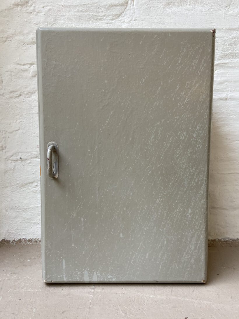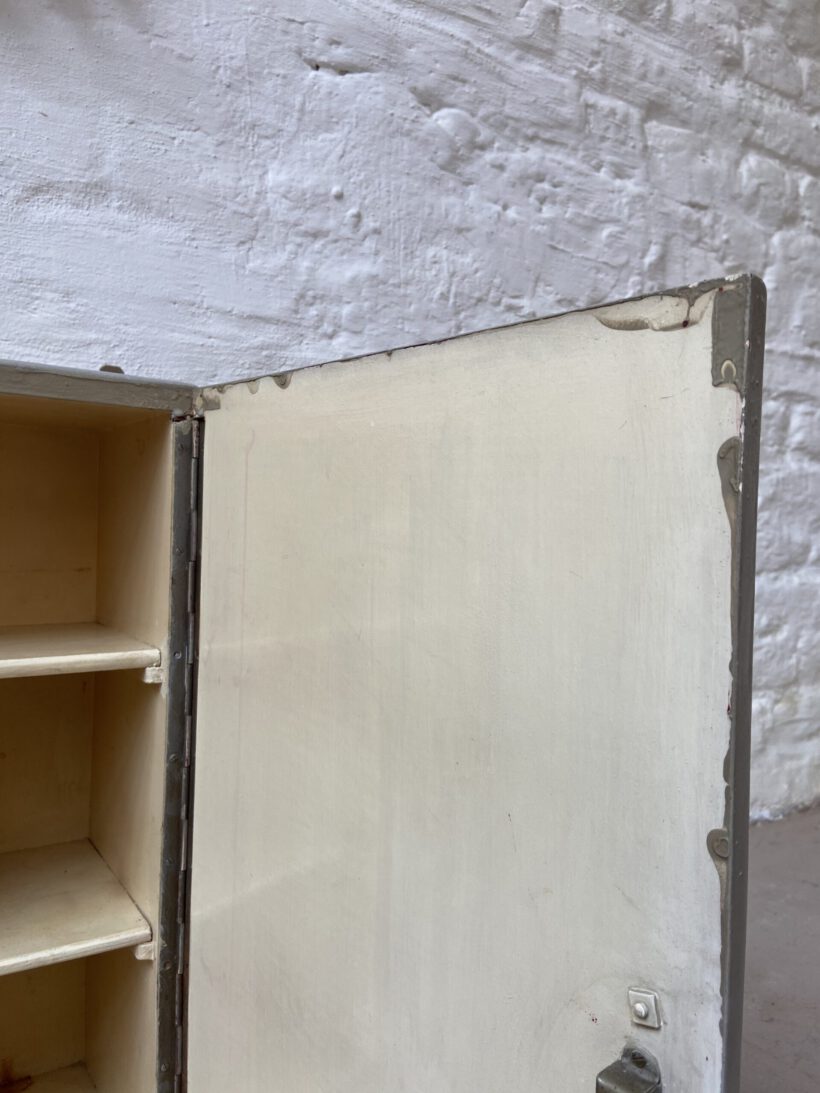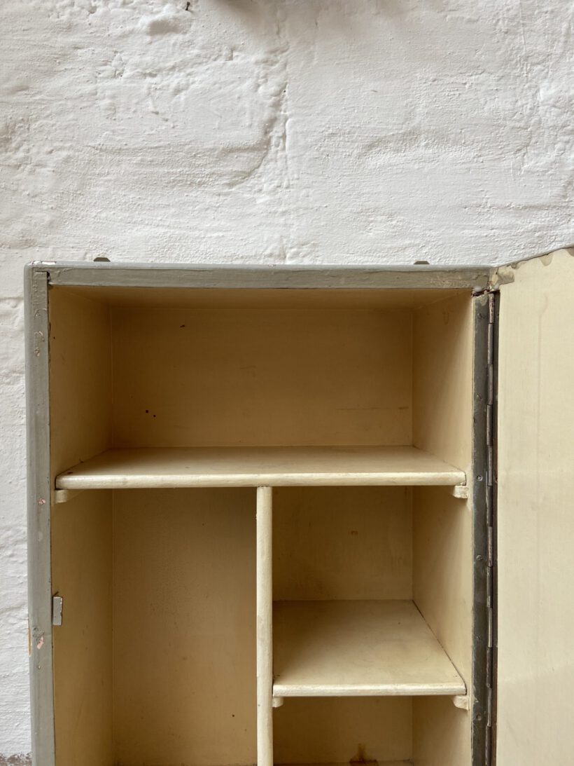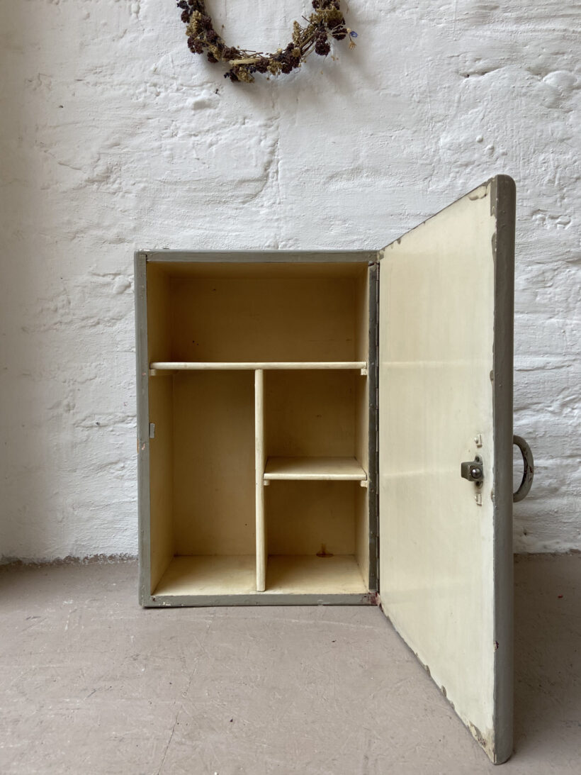 Wunderschöner alter Medizinhängeschrank aus Frankreich. Gerot ist grau und hat eine einzigartige Patina. Durch die tropfenartige Patina (siehe Bilder) entsteht ein spannender Industrie-Look.