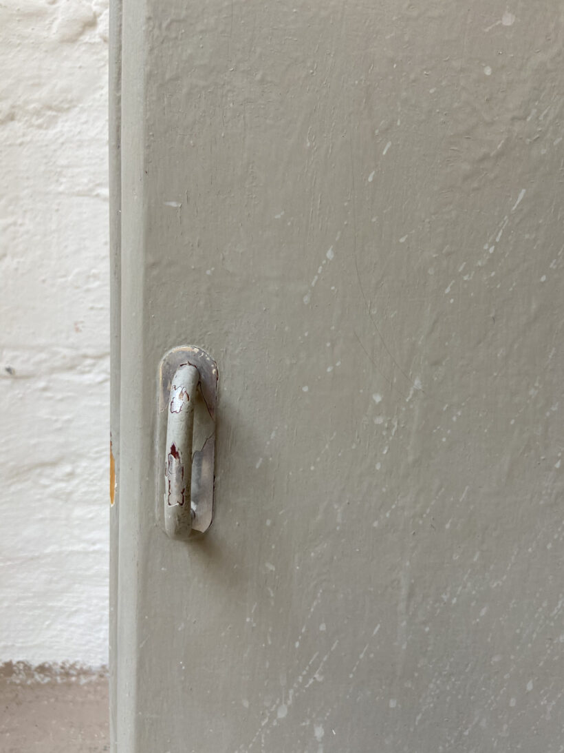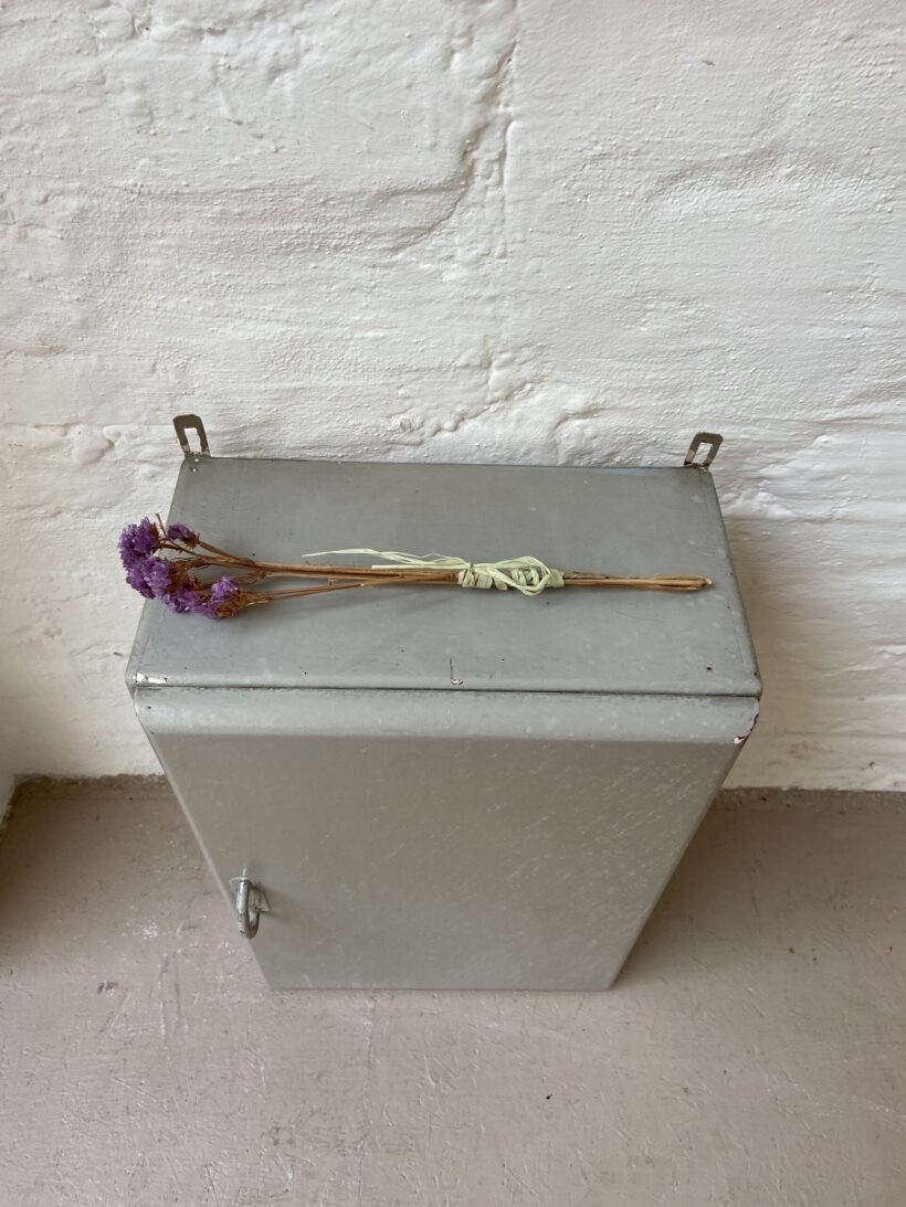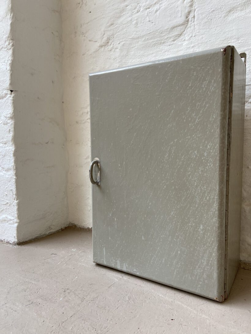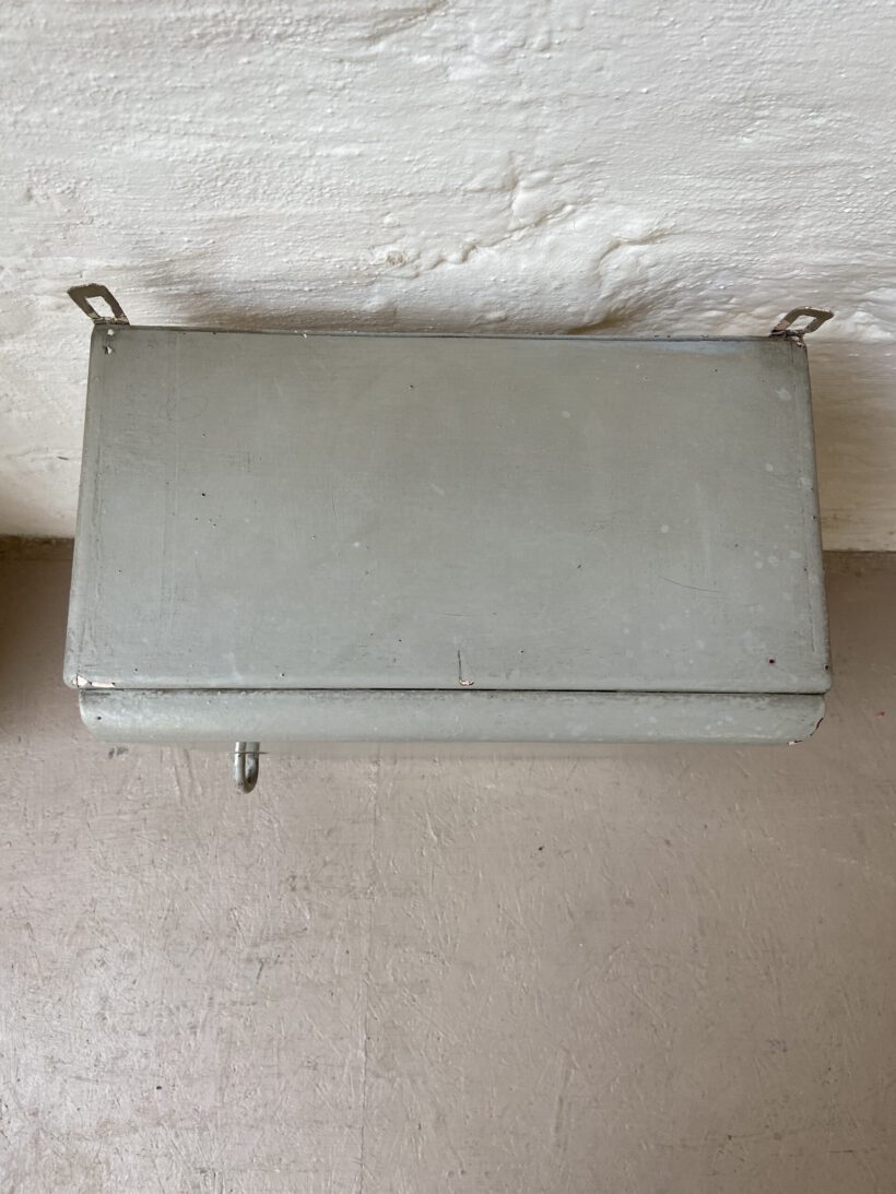 Wunderschöner alter Medizinhängeschrank aus Frankreich. Gerot ist grau und hat eine einzigartige Patina. Durch die tropfenartige Patina (siehe Bilder) entsteht ein spannender Industrie-Look.