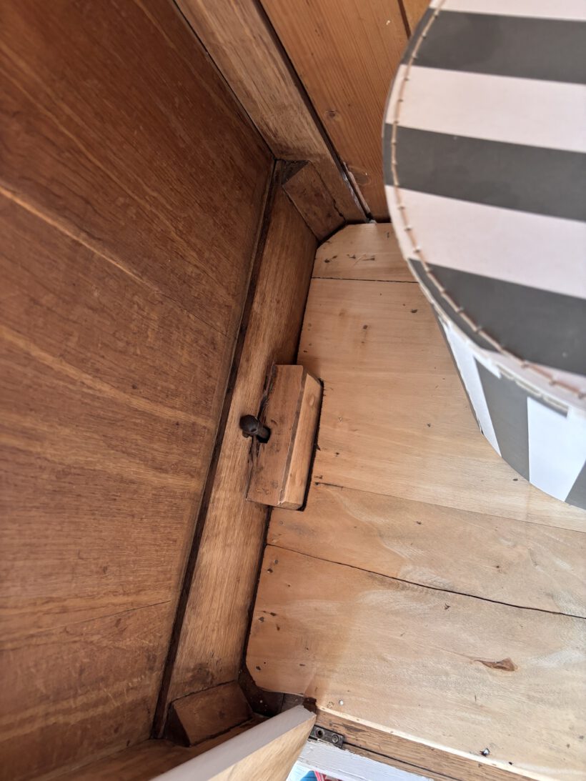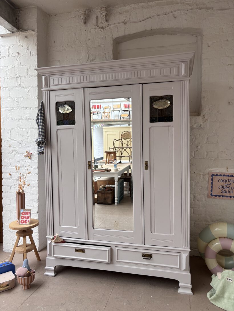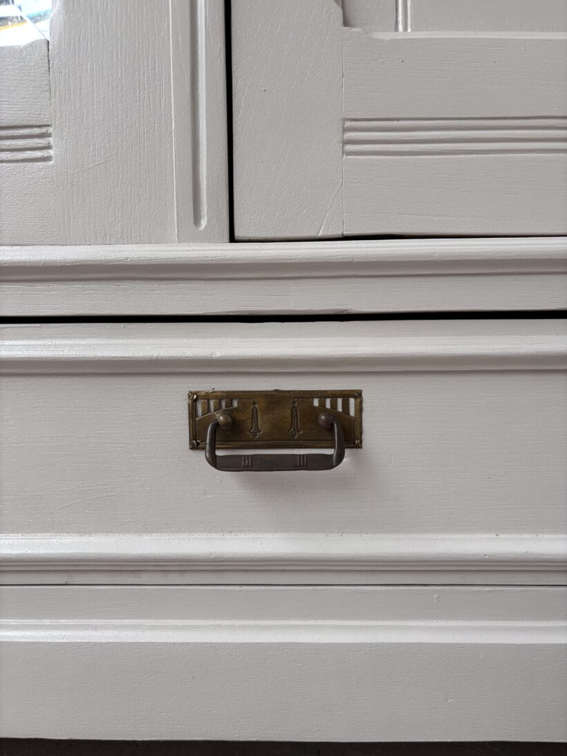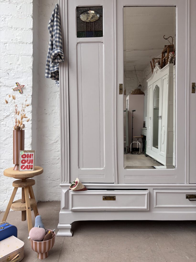 Noémi hat drei Türen, was selten bei antiken Steckschränken vorkommt. Innen haben wir ihr deshalb ein besonderes Innenleben verpasst – sie trägt recht 5 LegeFächer und links eine Kleiderstange. So ist ihr Innenraum ideal nutzbar und man kann eine Menge verstauen.