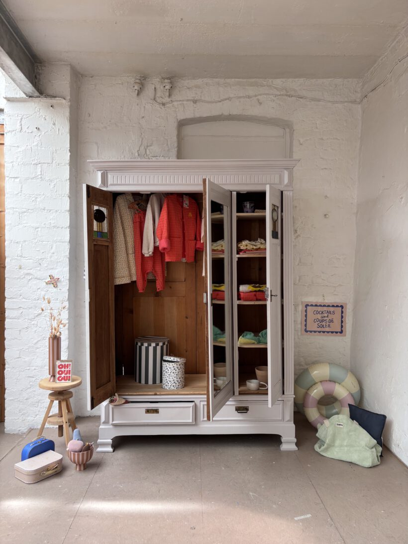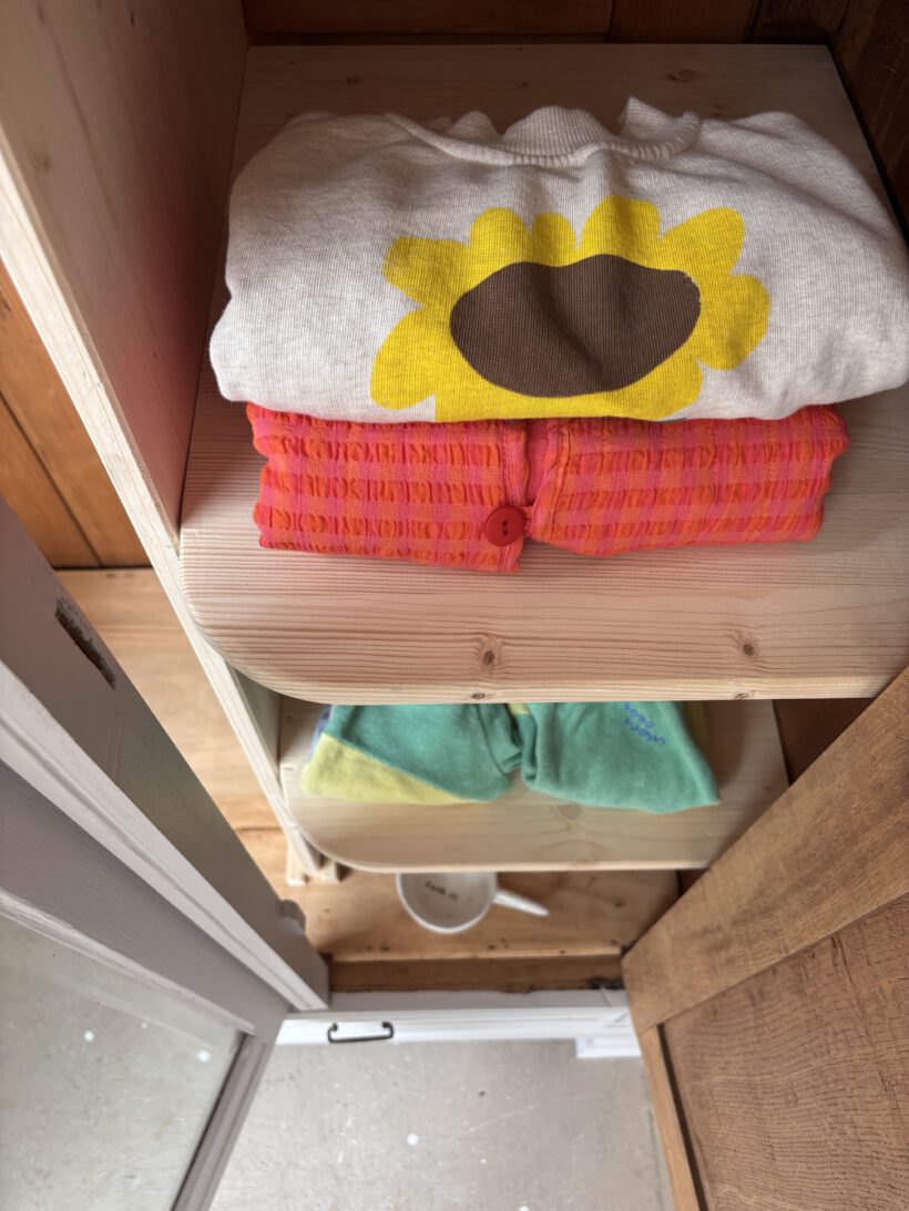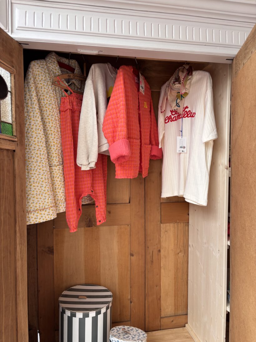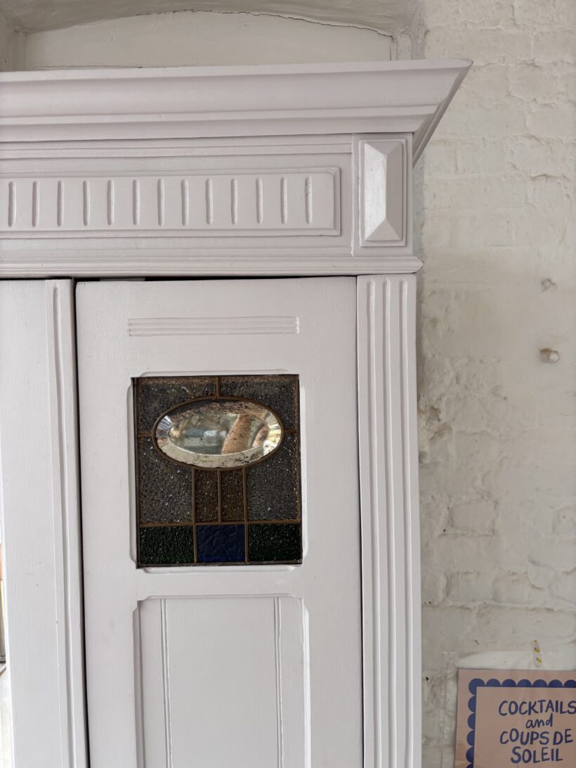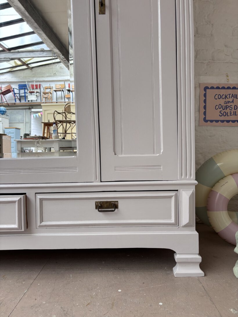 Noémi hat drei Türen, was selten bei antiken Steckschränken vorkommt. Innen haben wir ihr deshalb ein besonderes Innenleben verpasst – sie trägt recht 5 LegeFächer und links eine Kleiderstange. So ist ihr Innenraum ideal nutzbar und man kann eine Menge verstauen.