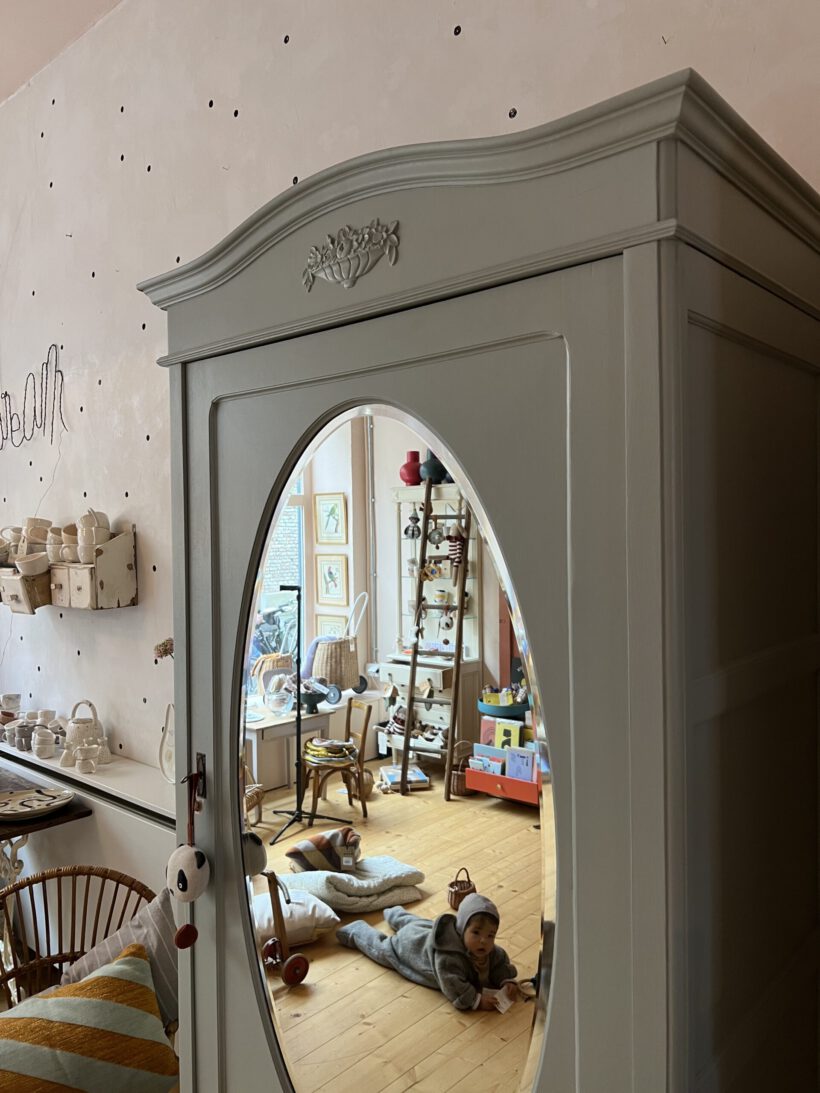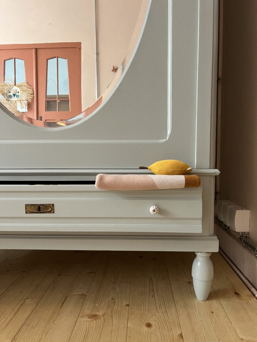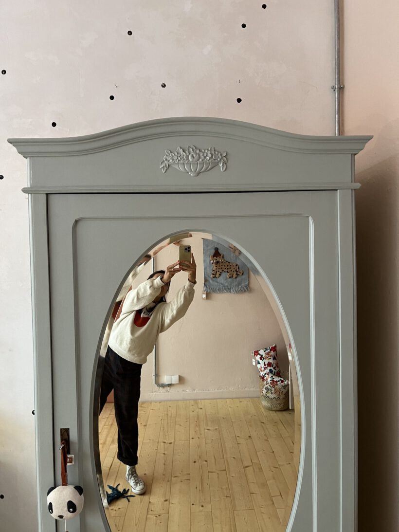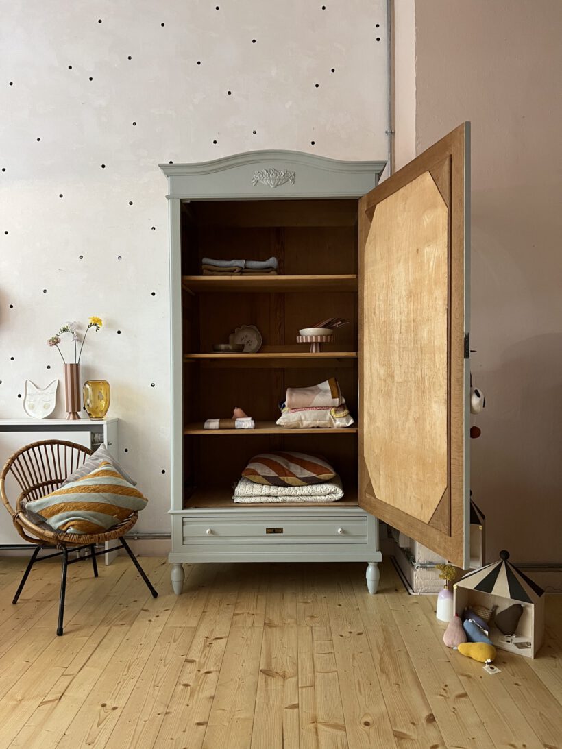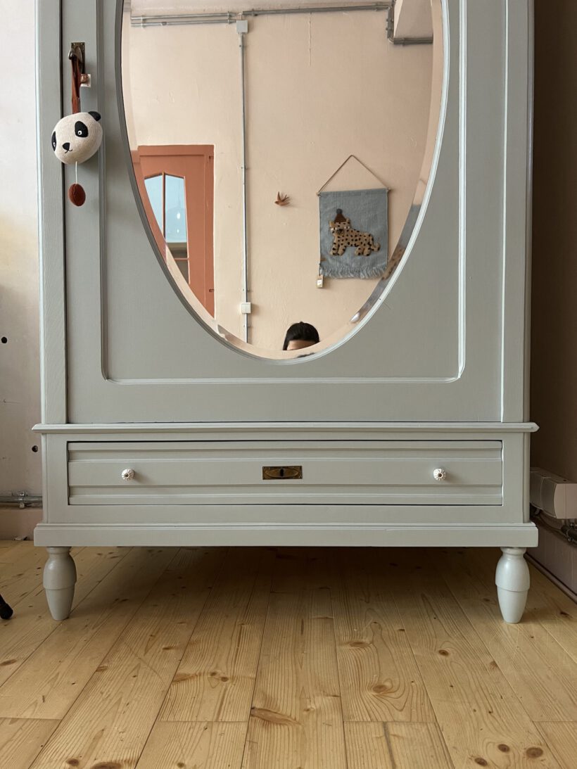 Sie ist gute 130 Jahre alt, stammt aus Frankreich und wird per Stecksystem in 12 Teilen auf und abgebaut. Das macht sie einfach unschlagbar perfekt und unkaputtbar. Odette macht jeden Umzug mit und lässt sich in jedes noch so kleine Zimmer und Stockwerk tragen. Besonders lieben wir den original geschliffenen ovalen Spiegel und dass sie auf hohen Füßen steht. Ein Traum!