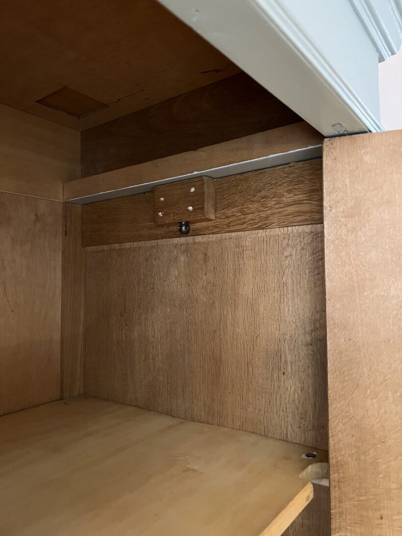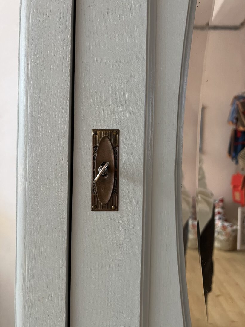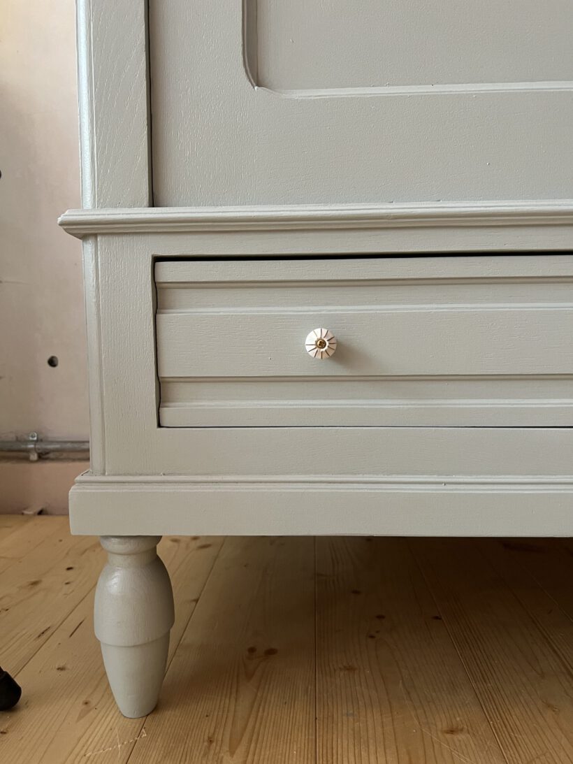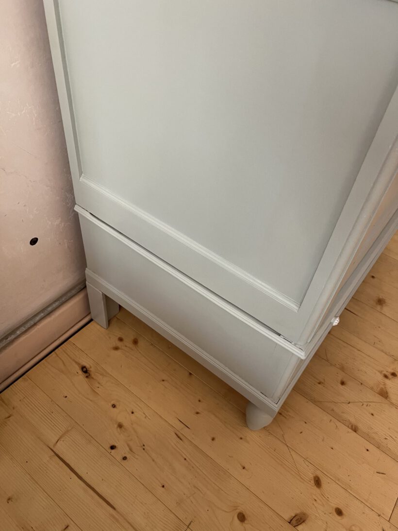 Wir haben Odette restauriert, grundiert und zweimal lackiert in einem wunderschönen hellblaugrau von Farrow and Ball. Die Schublade hat zwei neue Keramikknöpfe von uns bekommen. Odette ist aus Eichenholz. Der Schlüssel und die Tür funktionieren einwandfrei.