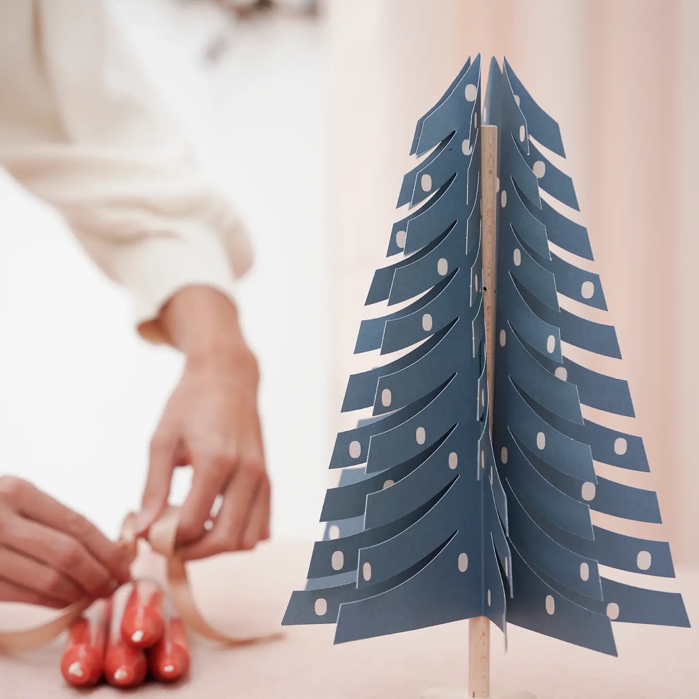 Einfach zu montieren: komplettes DIY-Kit. Dunkelblau mit dezentem Muster: stilvoll in jedem Interieur. Perfekt für Weihnachten: und die gesamte Wintersaison. Passt durch den Briefkasten: ein überraschendes Geschenk! Nachhaltig produziert: gedruckt in den Niederlanden auf FSC-Papier. Baue deinen eigenen Baum!