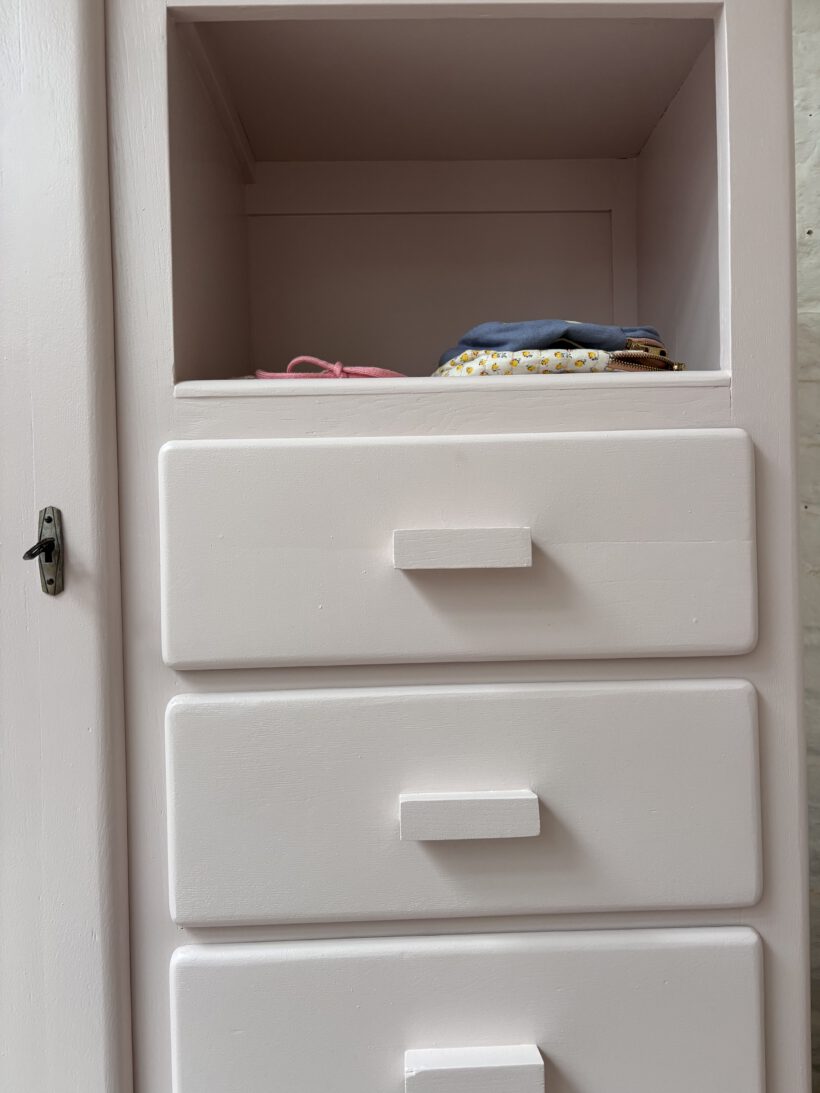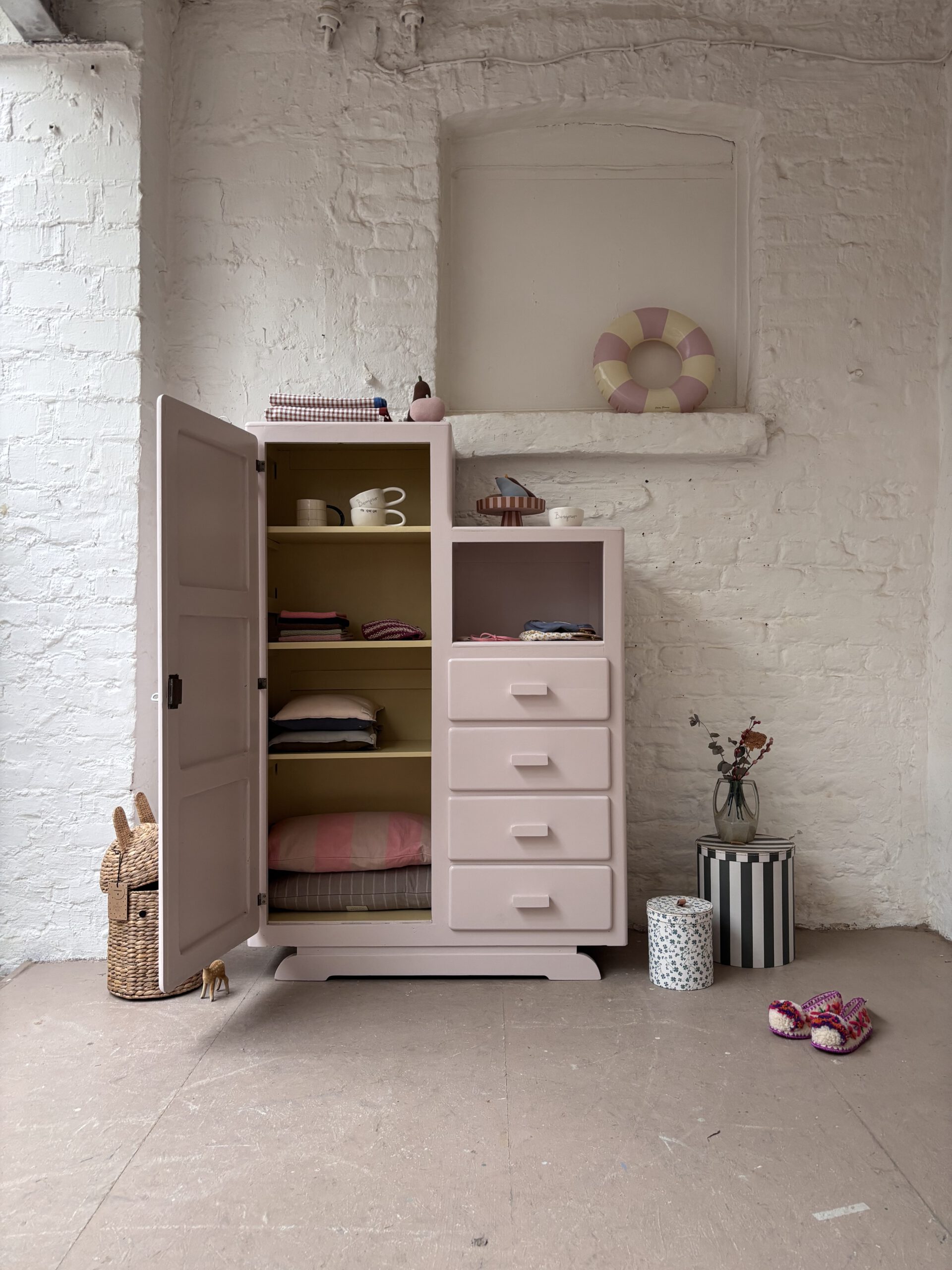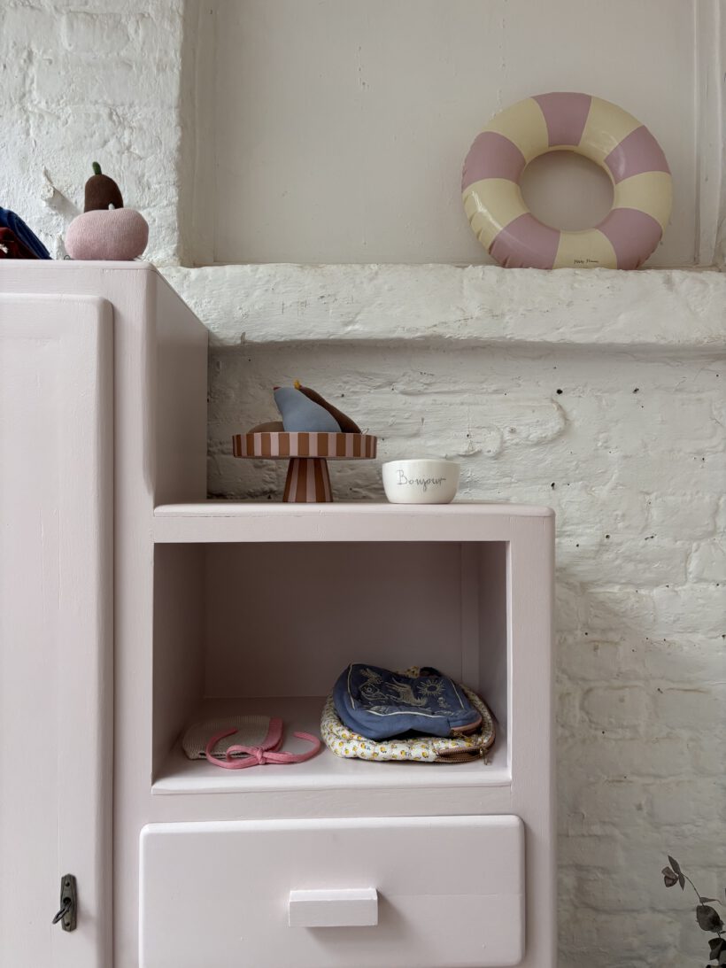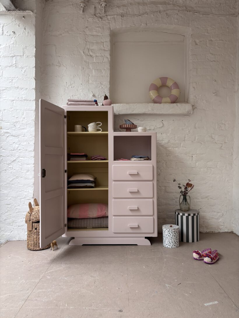 Wir haben Patrice restauriert, sein Holz geschliffen, grundiert und zwei Mal lackiert zweifarbig in Farrow and Ball Farben: außen rosa innen gelb.