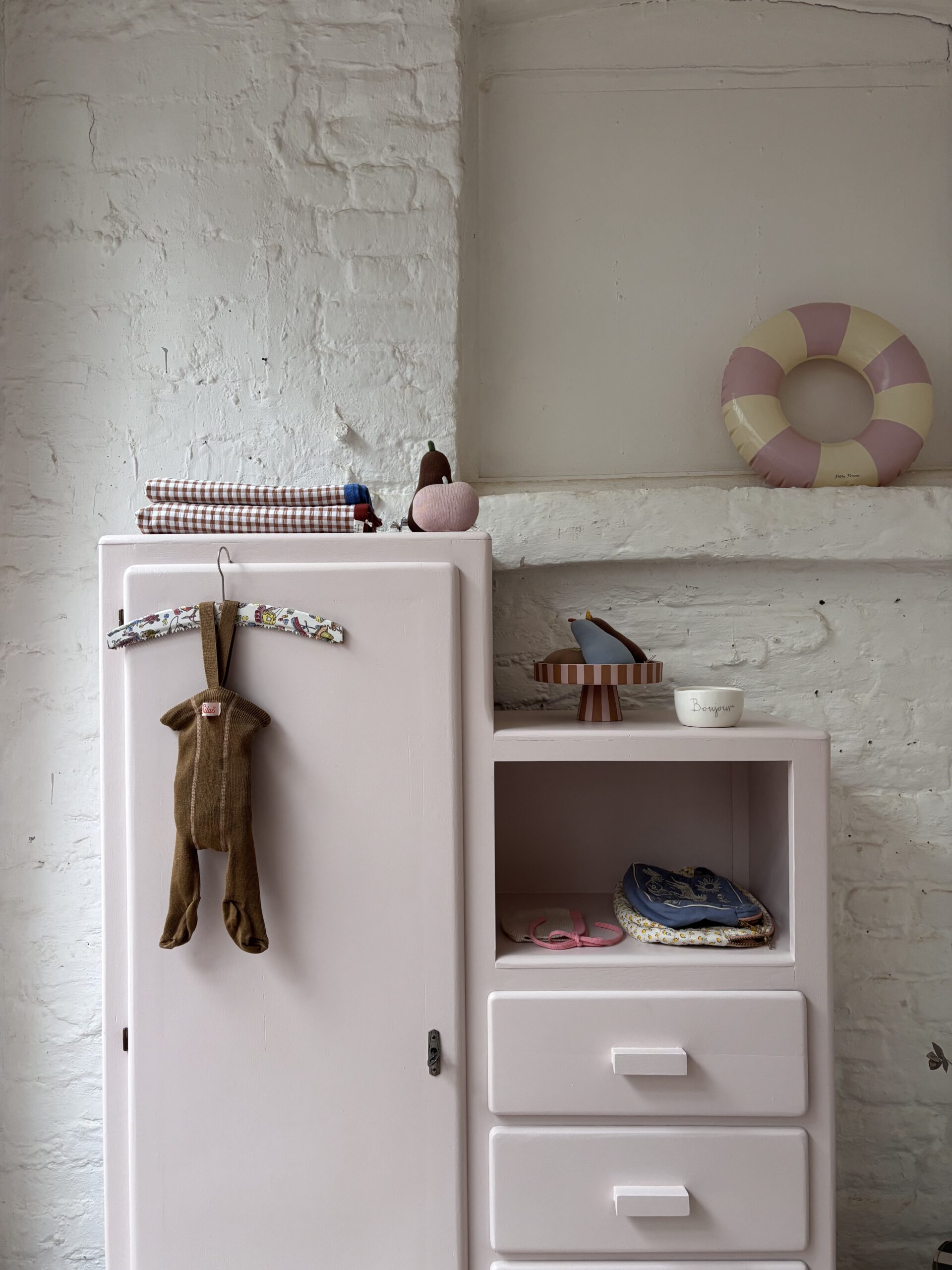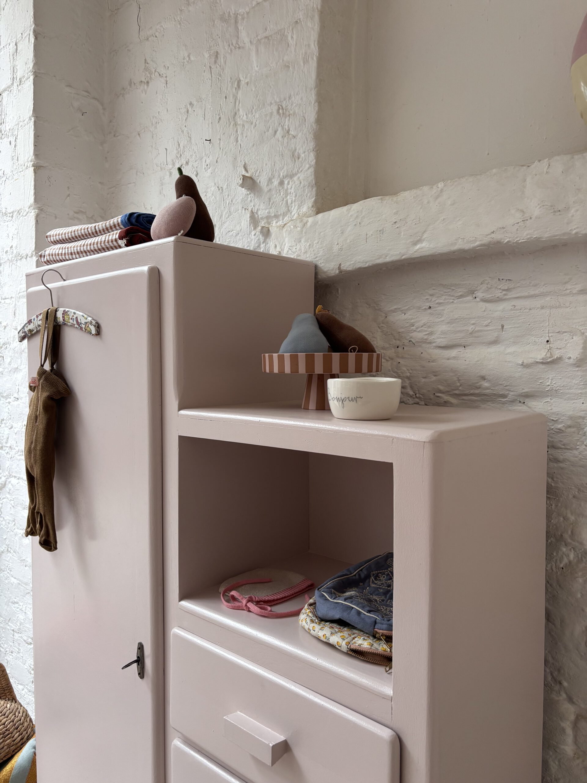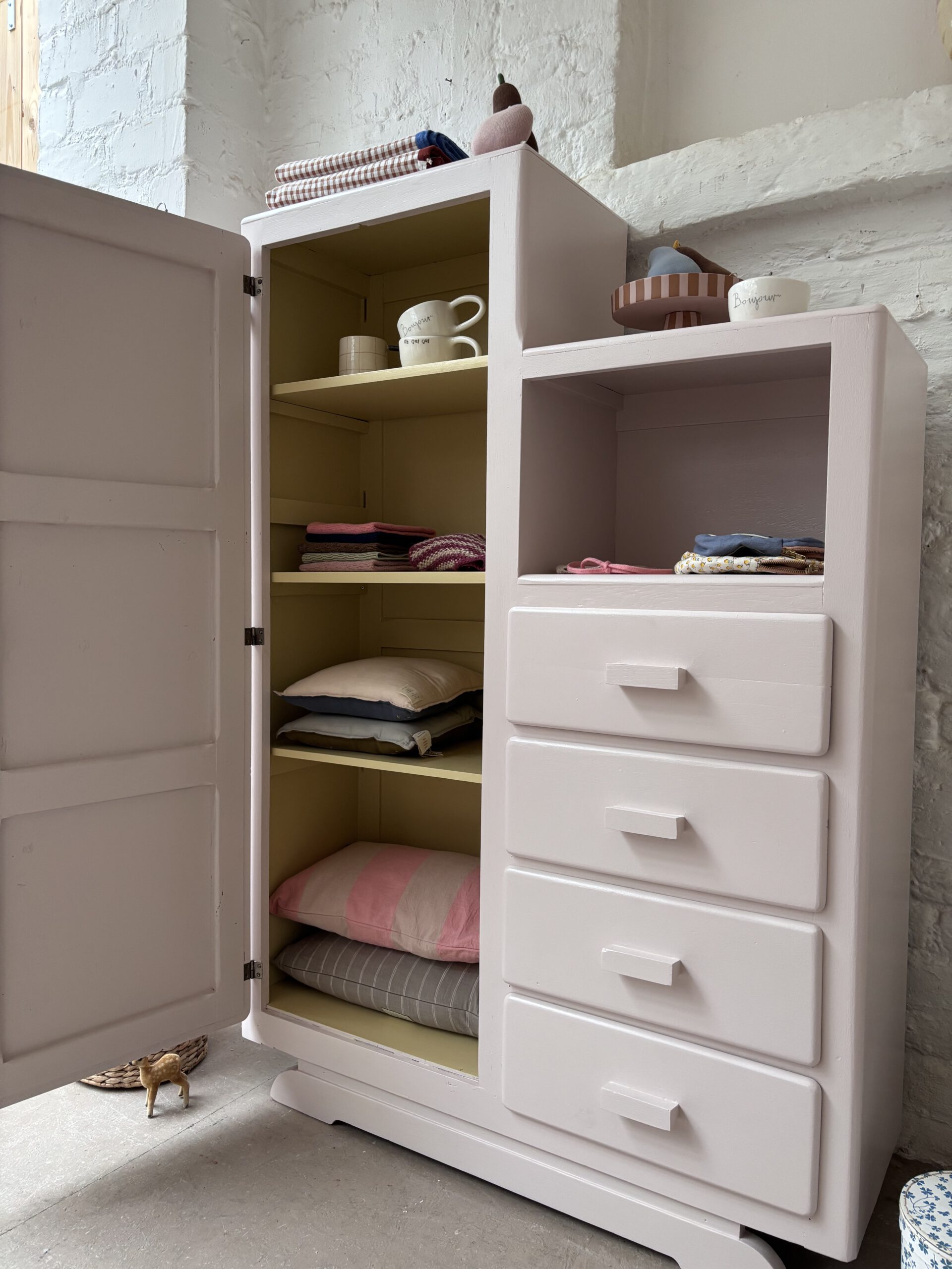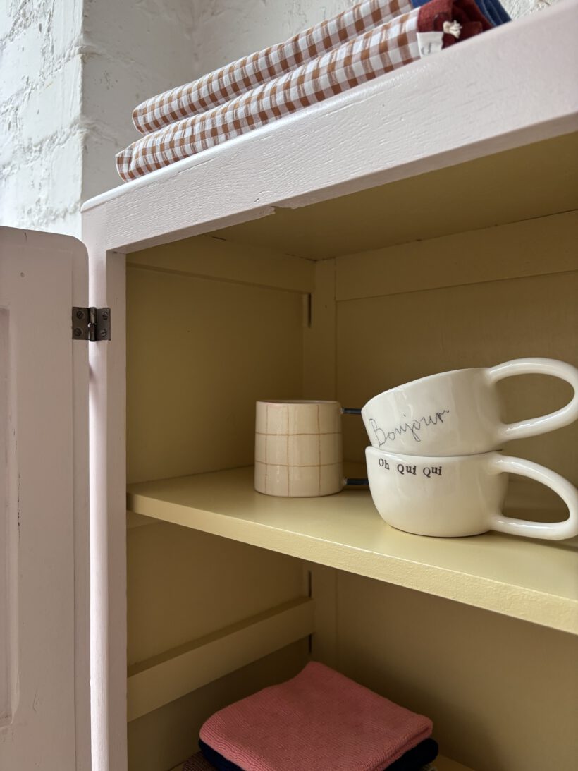 Wir haben Patrice restauriert, sein Holz geschliffen, grundiert und zwei Mal lackiert zweifarbig in Farrow and Ball Farben: außen rosa innen gelb.