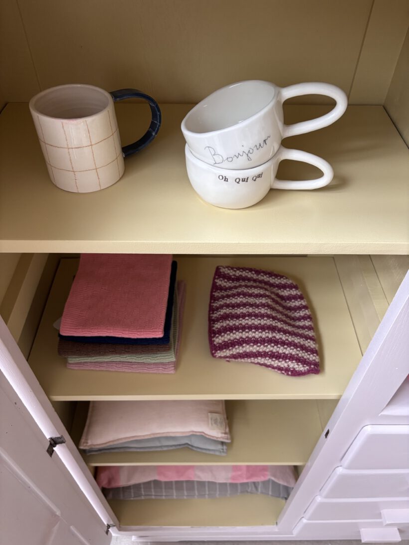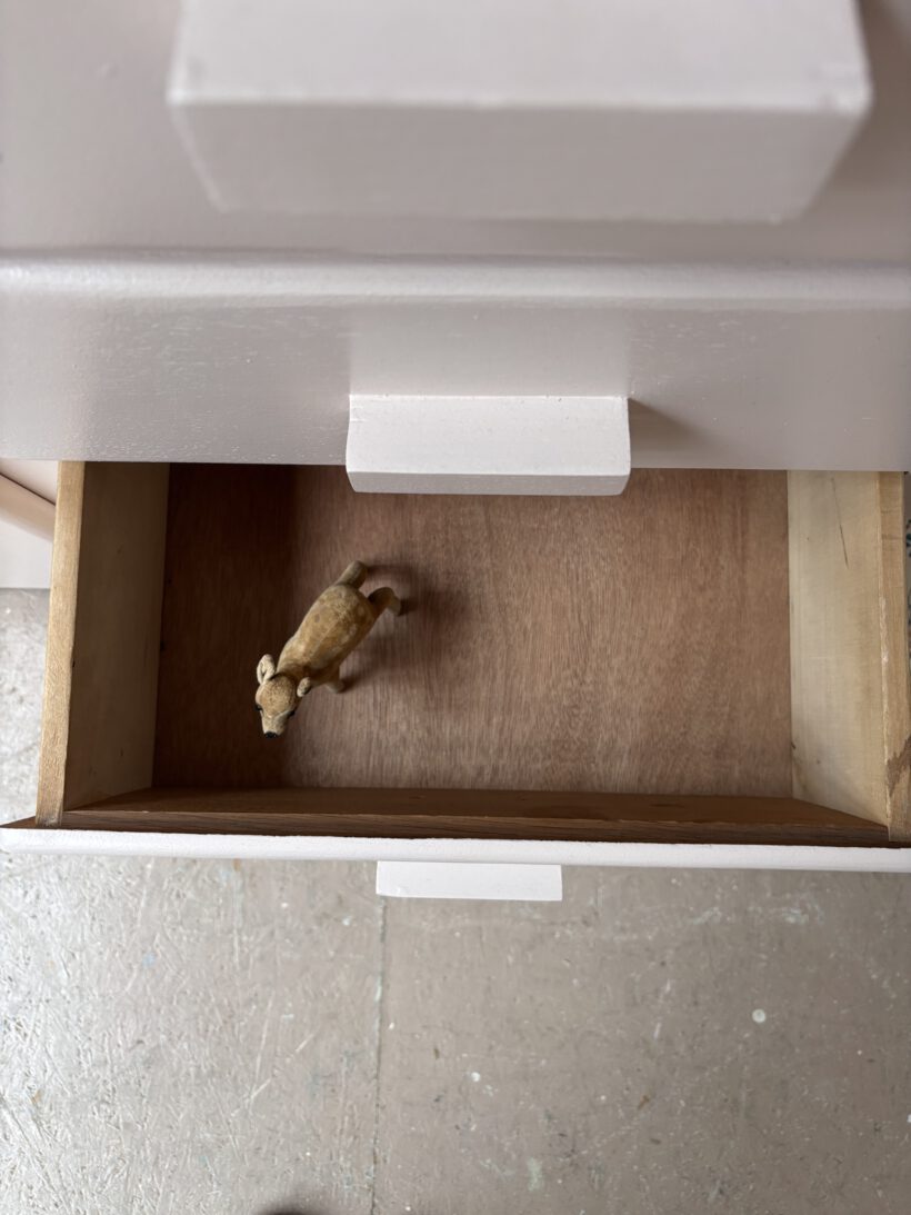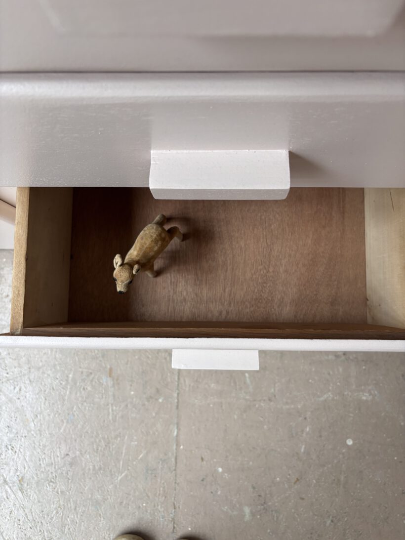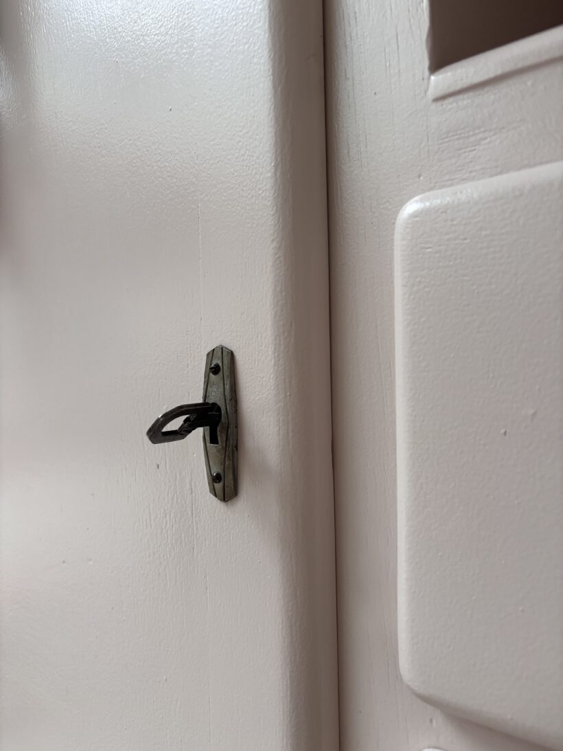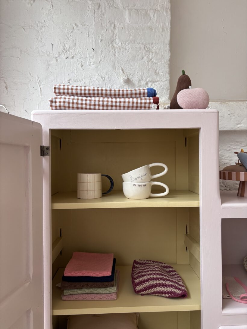 Wir haben Patrice restauriert, sein Holz geschliffen, grundiert und zwei Mal lackiert zweifarbig in Farrow and Ball Farben: außen rosa innen gelb.