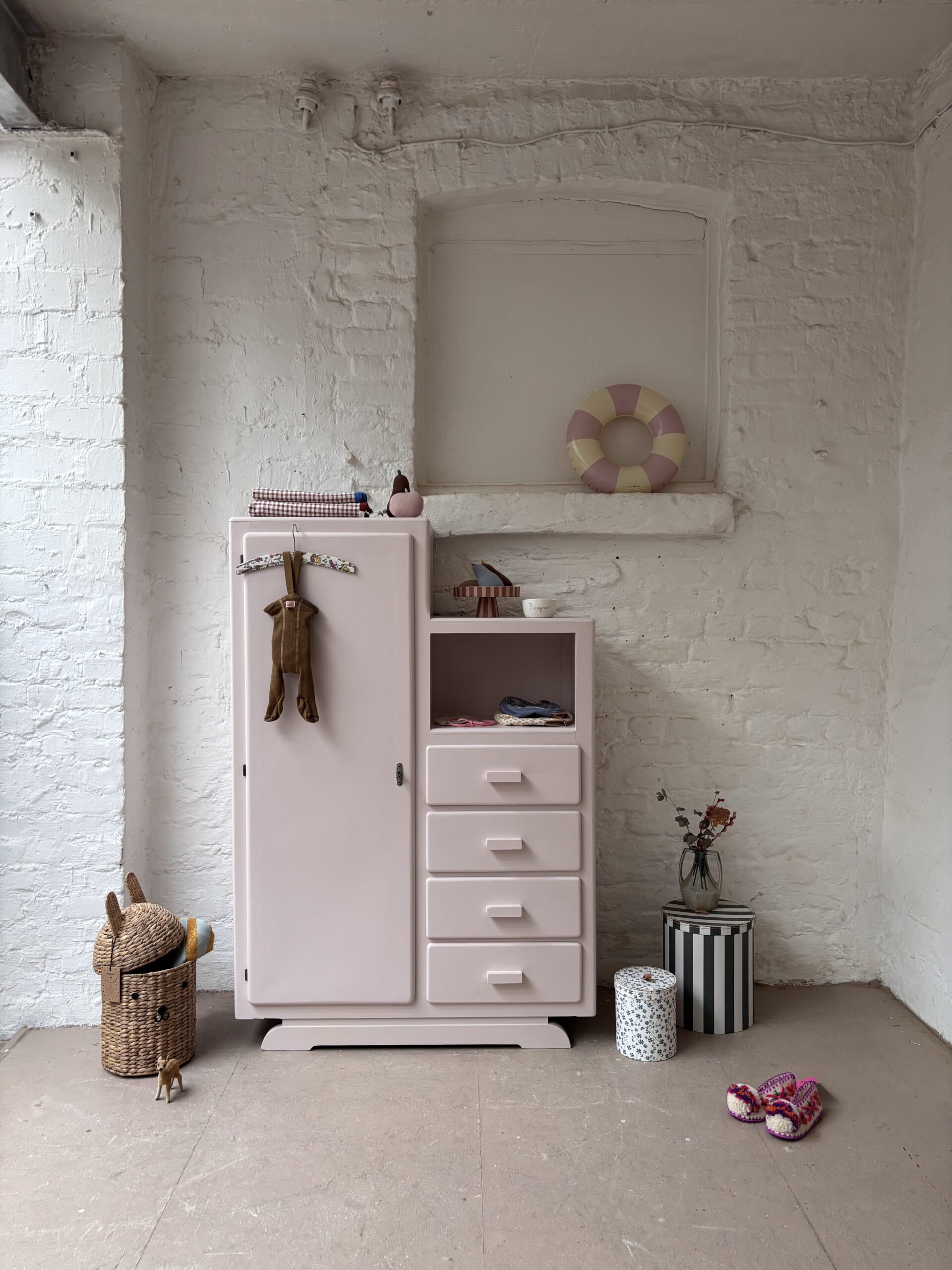 Die zwei sind Pariser Midcentury Kleiderschränke. Sie stammen aus den 40er/50er Jahren und sind Designklassiker, die heute nur noch selten auffindbar sind. Prägnant ist ihr schlichtes Design mit besondere Form. Der zwei stufige Aufbau ist sehr charmant und ein Hingucker. Außerdem ist die Aufteilung sehr praktisch. Schubladen und Fächer – ein Traum. Besonders praktisch sind auch die schmalen Maße. Beide sind gerade Mal 35,5 cm tief. Sie tragen damit null auf im räum und sind vielseitig einsetzbar.