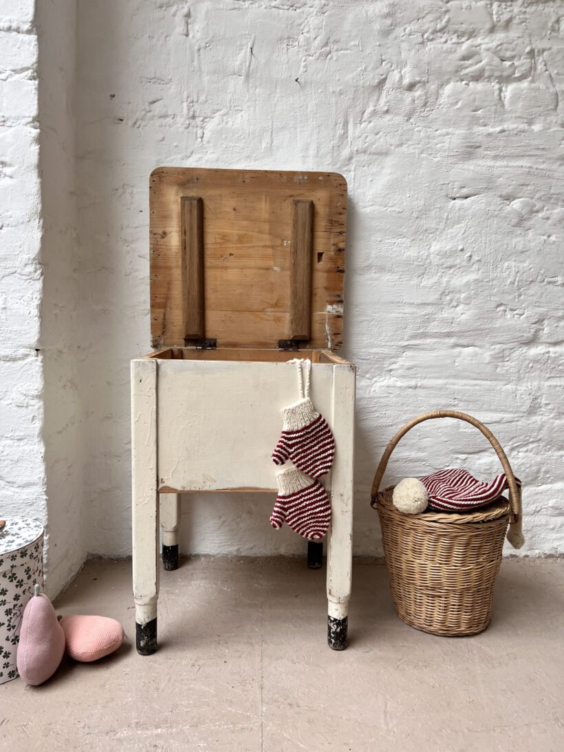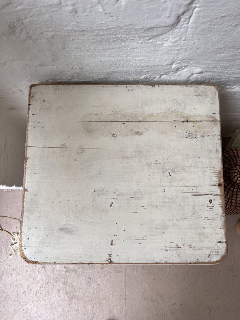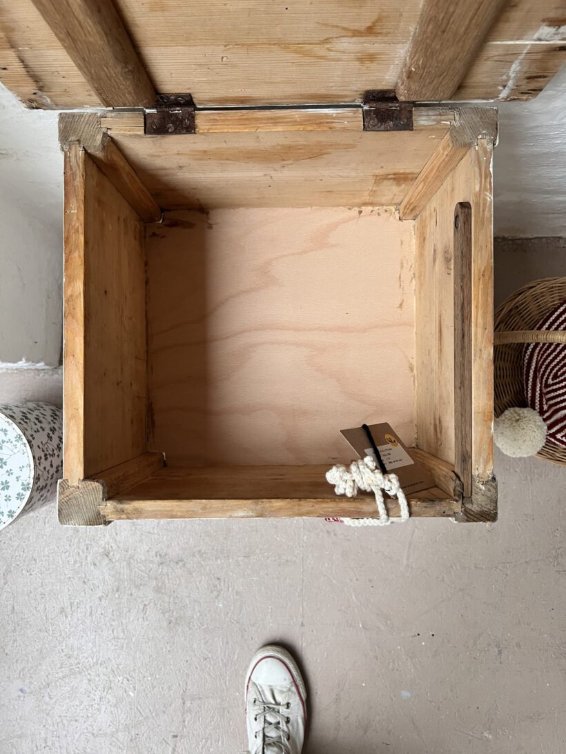 …ein wunderschöner kleiner Beistelltisch mit Truhenfach, den man auch wunderbar als Hocker nutzen kann. Die Sitz-/Tischfläche ist geschliffen und gewachst. Das Gestell wurde erhalten und hat eine wunderschöne Patina.