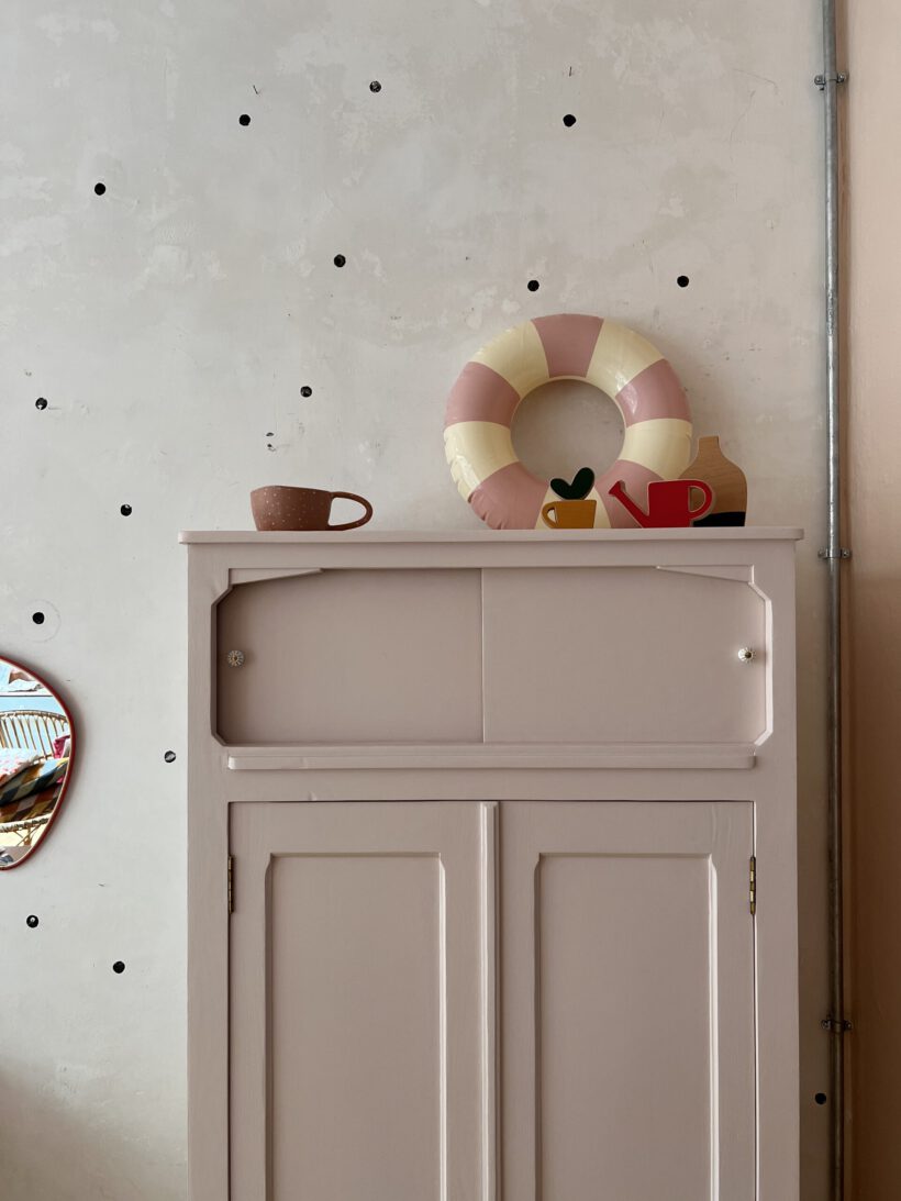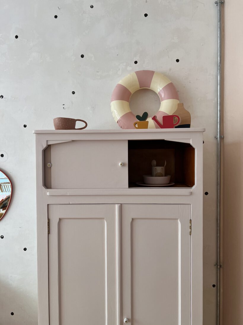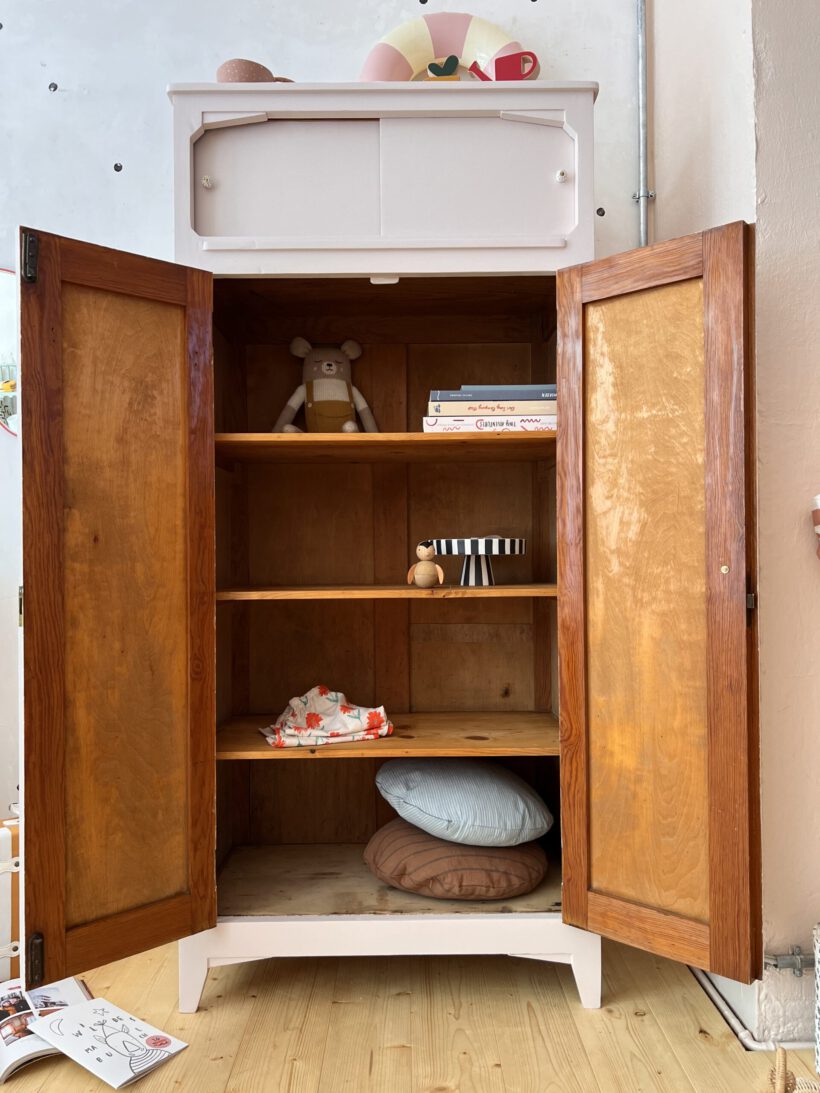 Eine wie Pauline hatten wir noch nie da…ihr Design, ihre Größe und ihr Charme sind für uns einzigartig. Besonders hübsch finden wir die zwei Schiebetüren im oberen Drittel, hinter denen sich ein kleines hübsches Fach für allerlei Schönes versteckt. Auch ihr schmale Größe, die zwei Türen bei gerade mal 73 cm Breite und die hübschen hohen Füße, gefallen uns sehr. Pauline stammt aus den 50/60er Jahren und ist – für diese Zeit typisch – aus dünnem und leichtem Holz gefertigt. Sie ist also nicht schwer, wie man das sonst von antiken Möbeln kennt.