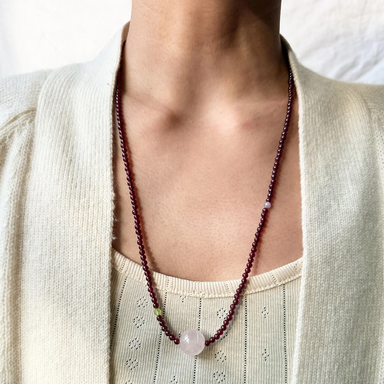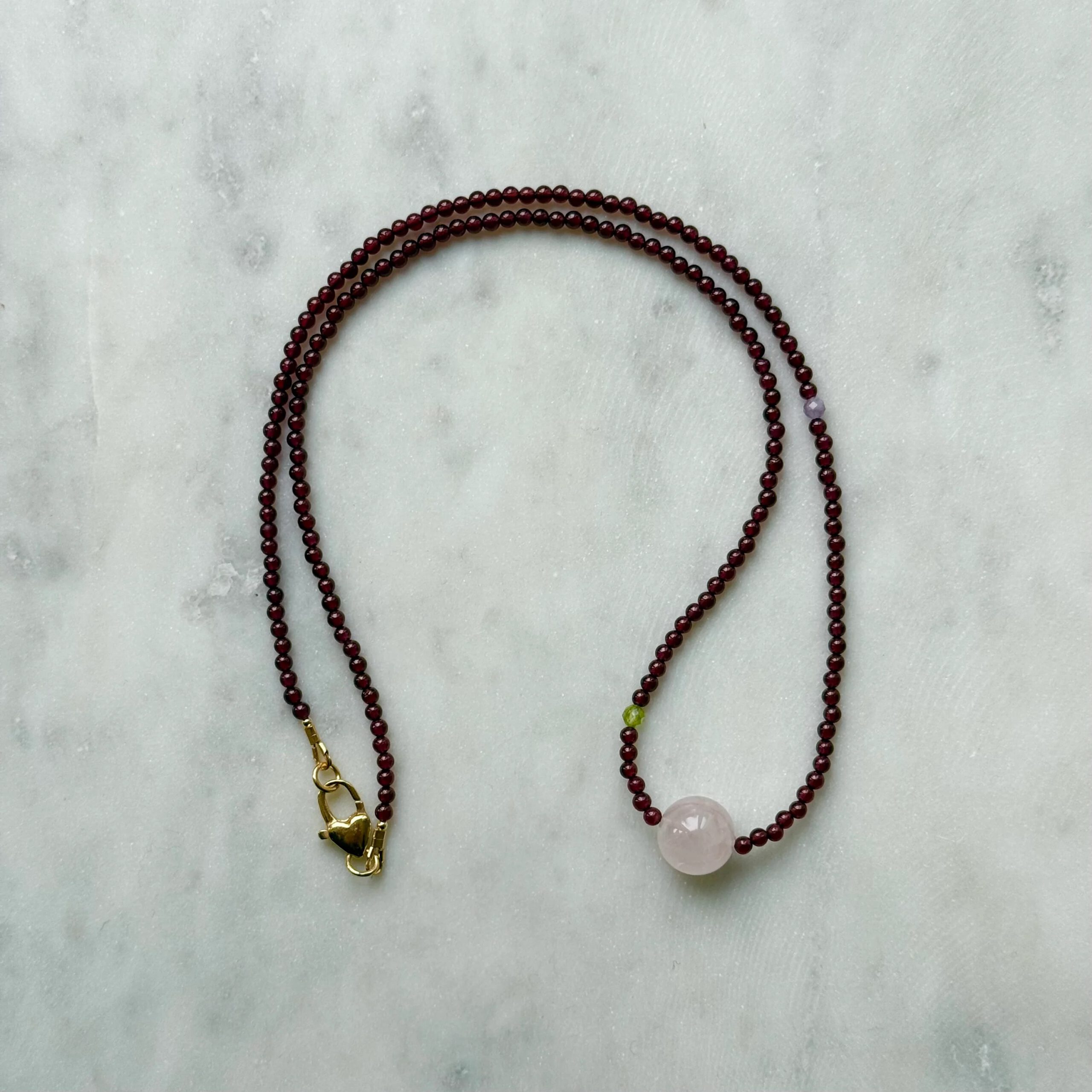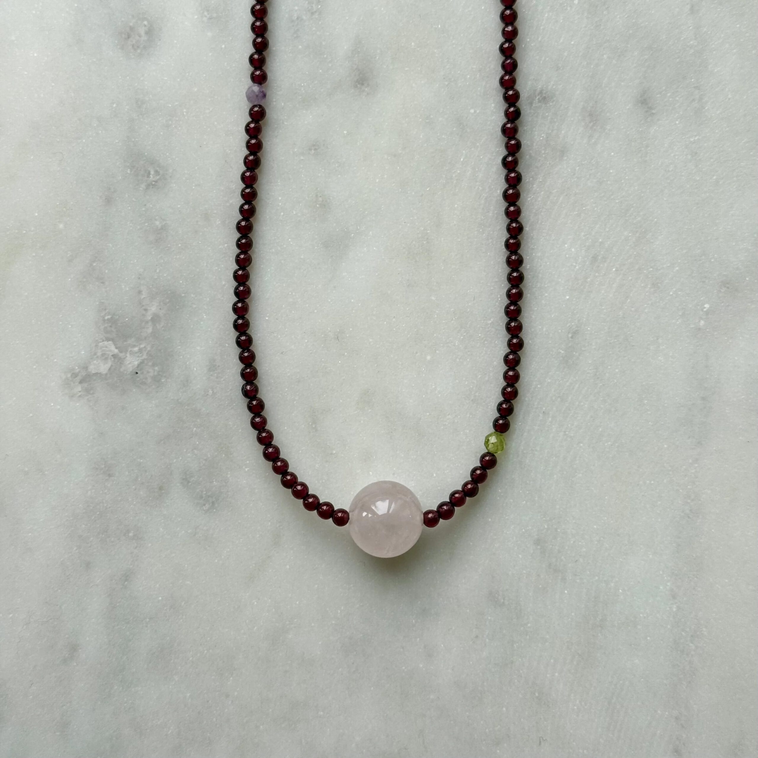 Variante bordeaux-rosa: Besteht aus einem facetiertem Peridot und Amethyst Steinen. Der Runde Edelstein ist ein Rosenquartz 10 mm breit.