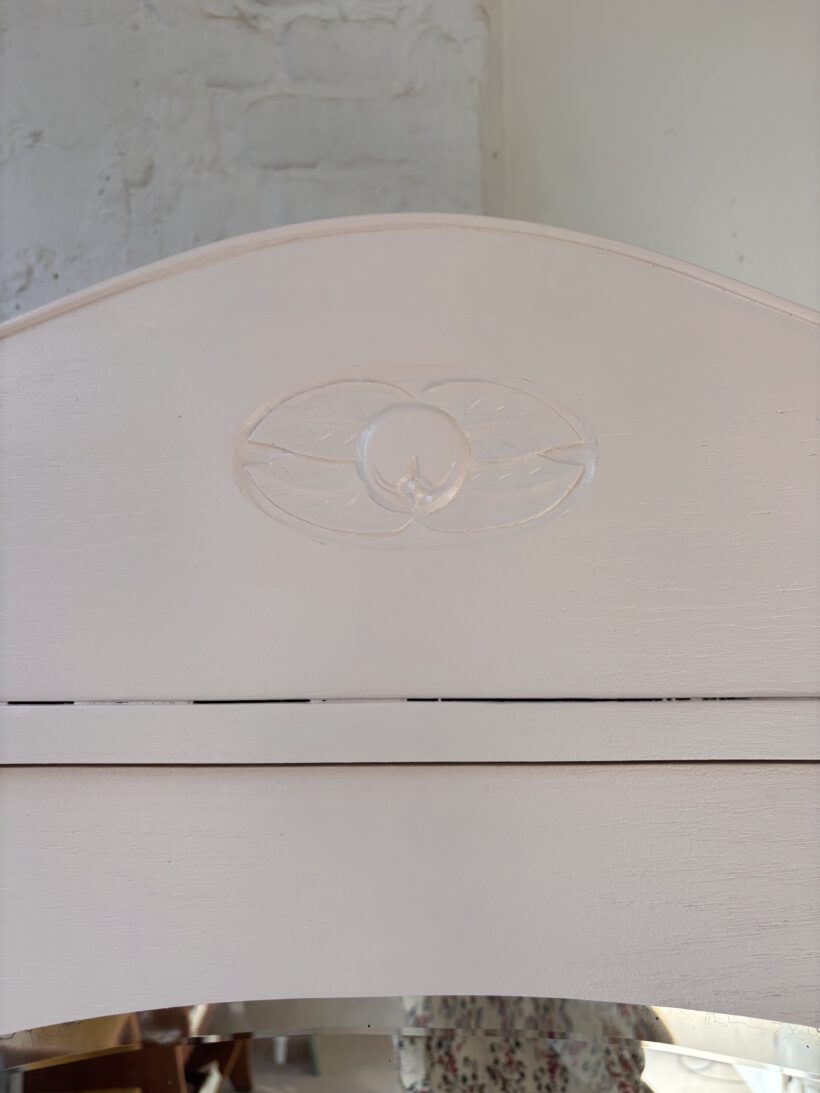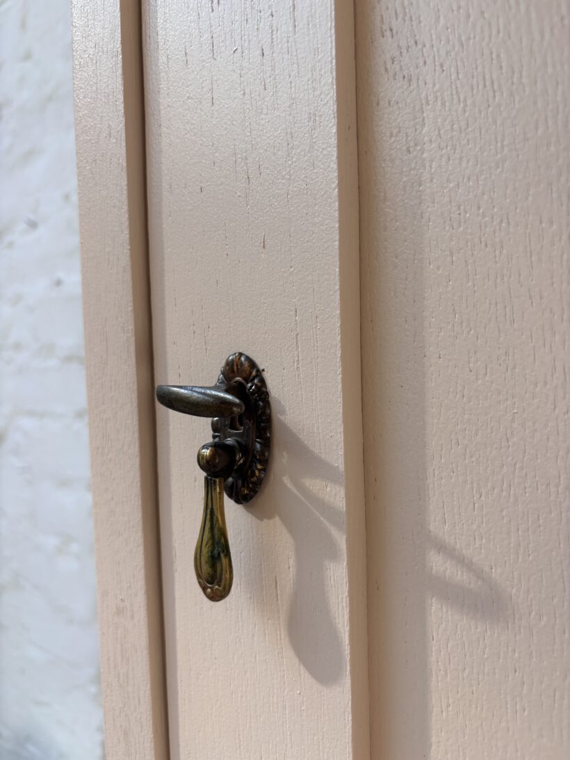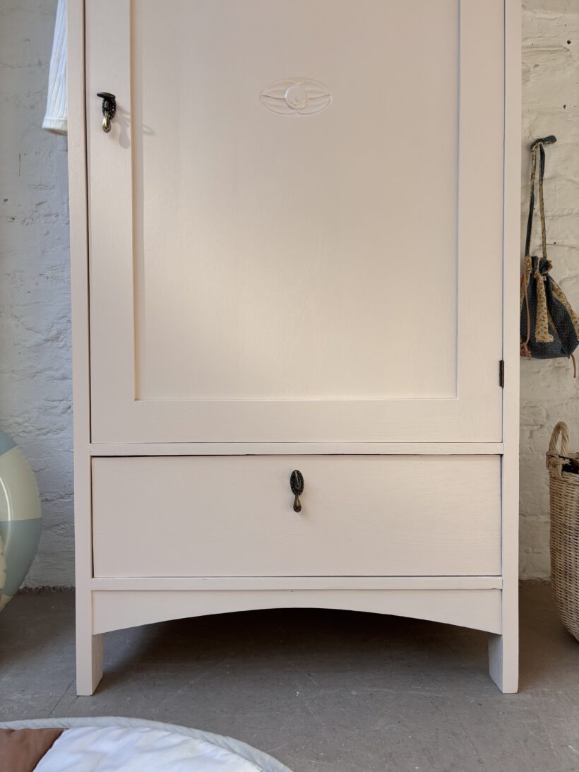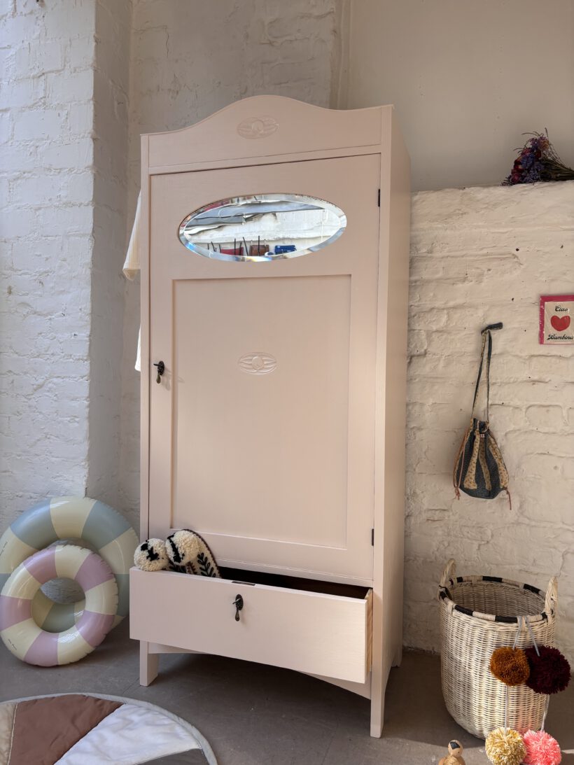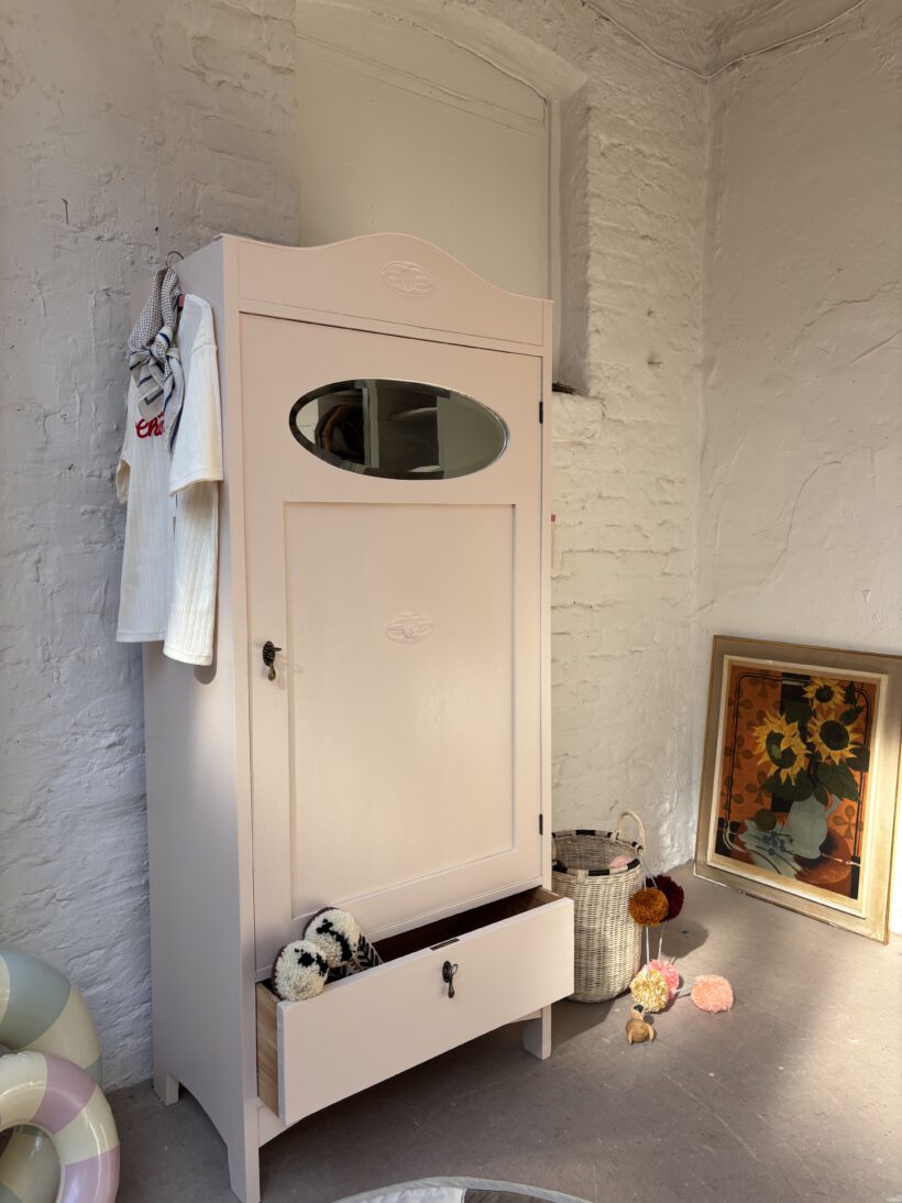 Per trägt ein wunderschönes Apricot-Rosa von Farrow and Ball bekommen. Dafür wurde ihr Holz komplett geschliffen, grundiert und zwei Mal lackiert. Der Schlüssel für die Tür ist vorhanden und schließt wunderbar. Für die Schublade gibt es leider keinen mehr. Dafür öffnet und schließt auch diese wunderbar;-)