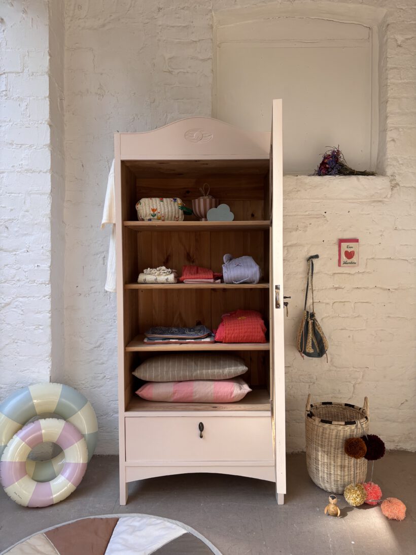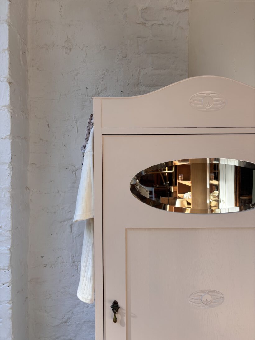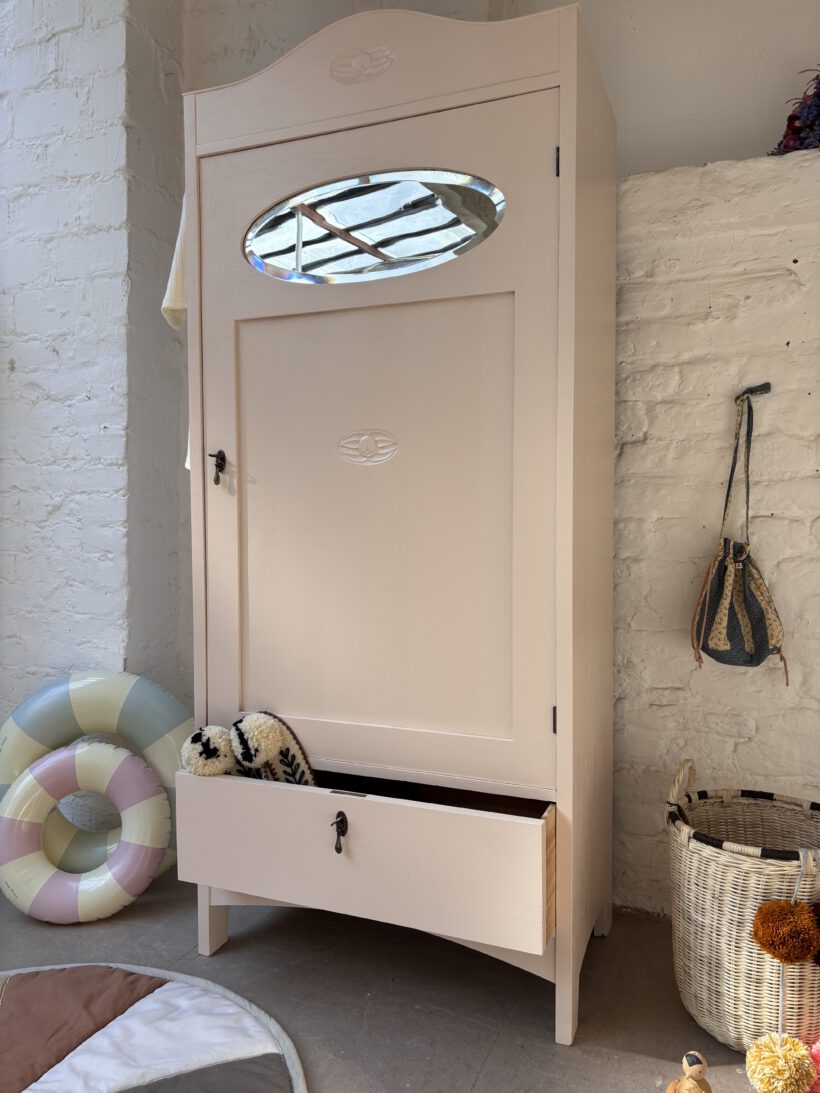 Per ist ein Hingucker in jedem Zuhause. Er hat ein ovales Fenster mit Facettenschliff, das original erhalten ist und unschlagbare Maße. Mit gerade Mal einer Breite von 78 cm fällt er definitiv in ein besonderes Maß, dass oft gesucht wird, gerade für Räume mit wenig Stellplatz. Die alten Apfelschränke finden wir besonders schön in Kinderzimmern. Sie bieten genug Stauraum für Kinderkleidung und nehmen wenig Platz ein. Aber auch als Küchenschrank oder im Wohnzimmer machen sie sich bezaubernd.