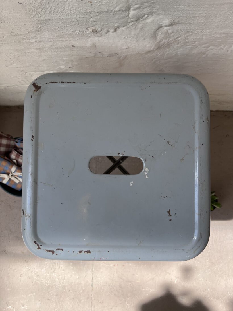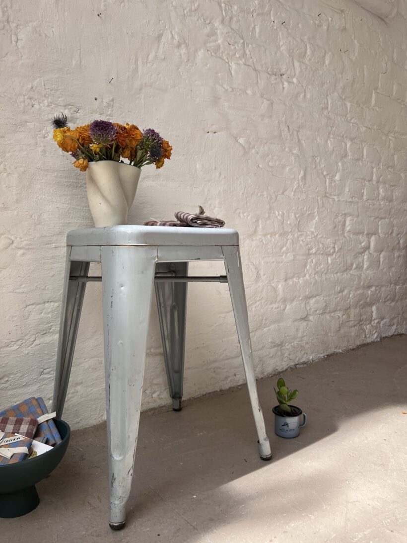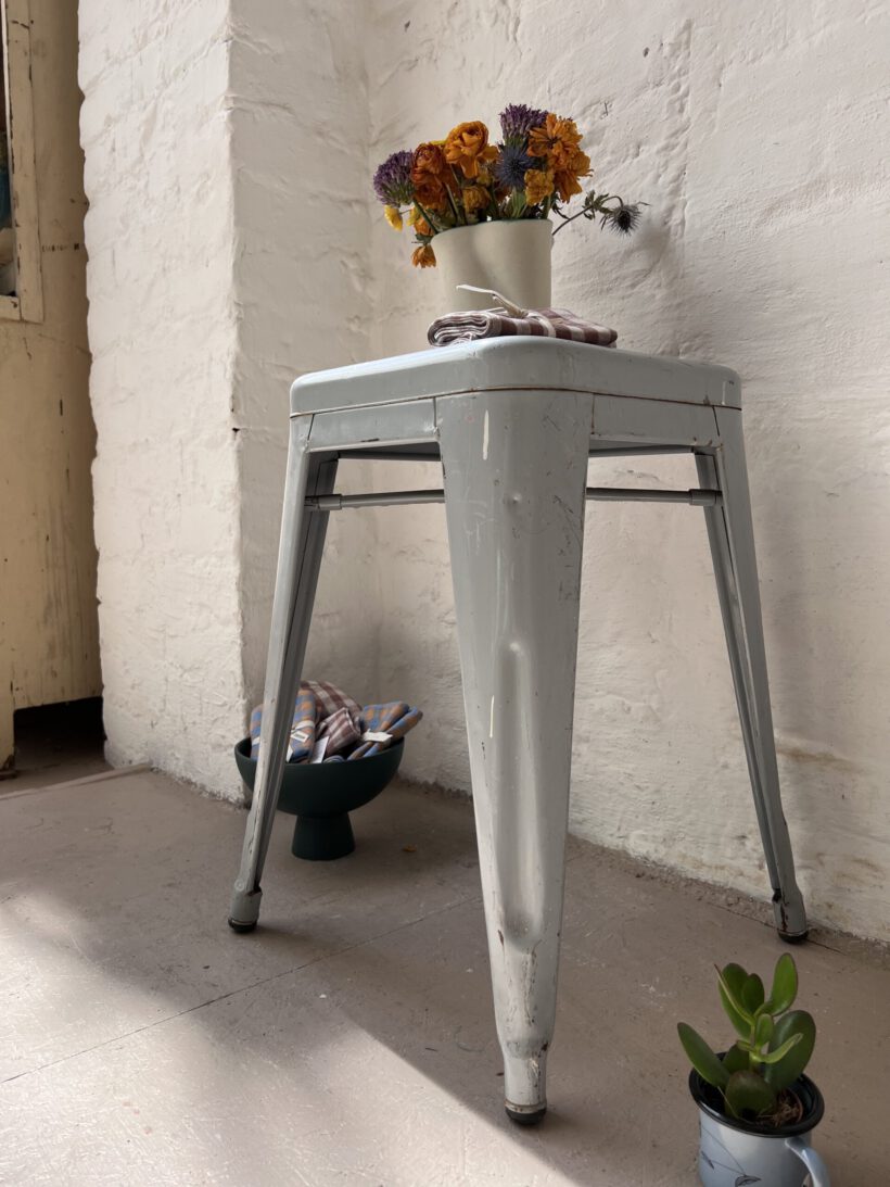 Wunderschöner alter Hocker der Designmarke Tolix. Pierre Luc stammt aus Frankreich, trägt ein schönes helles warmes grau und hat eine schöne Patina. Toll als Stuhl, Hocker und auch kleiner Beistelltisch.