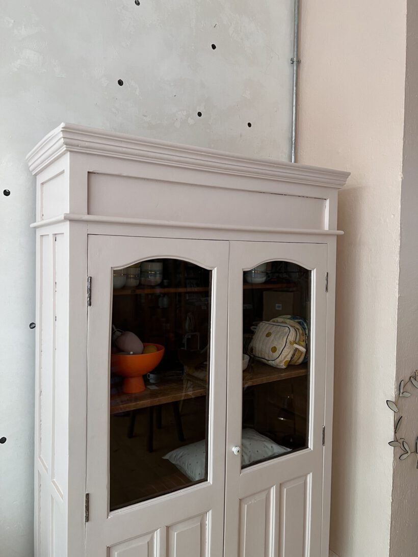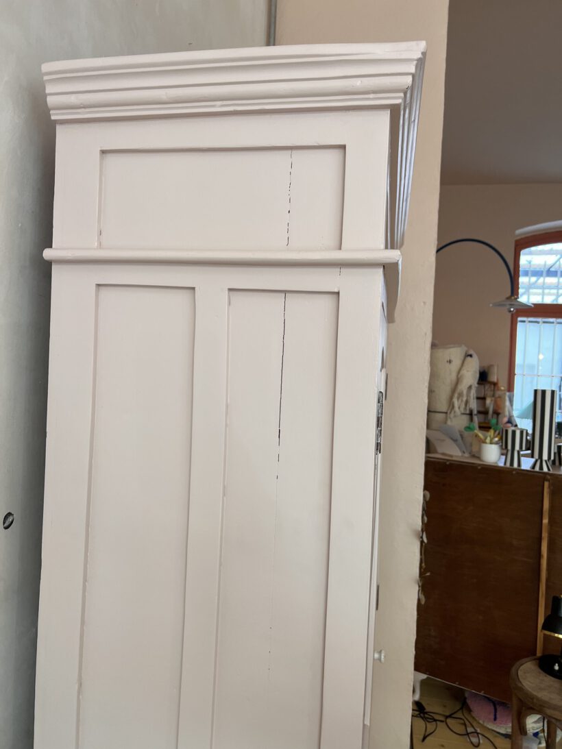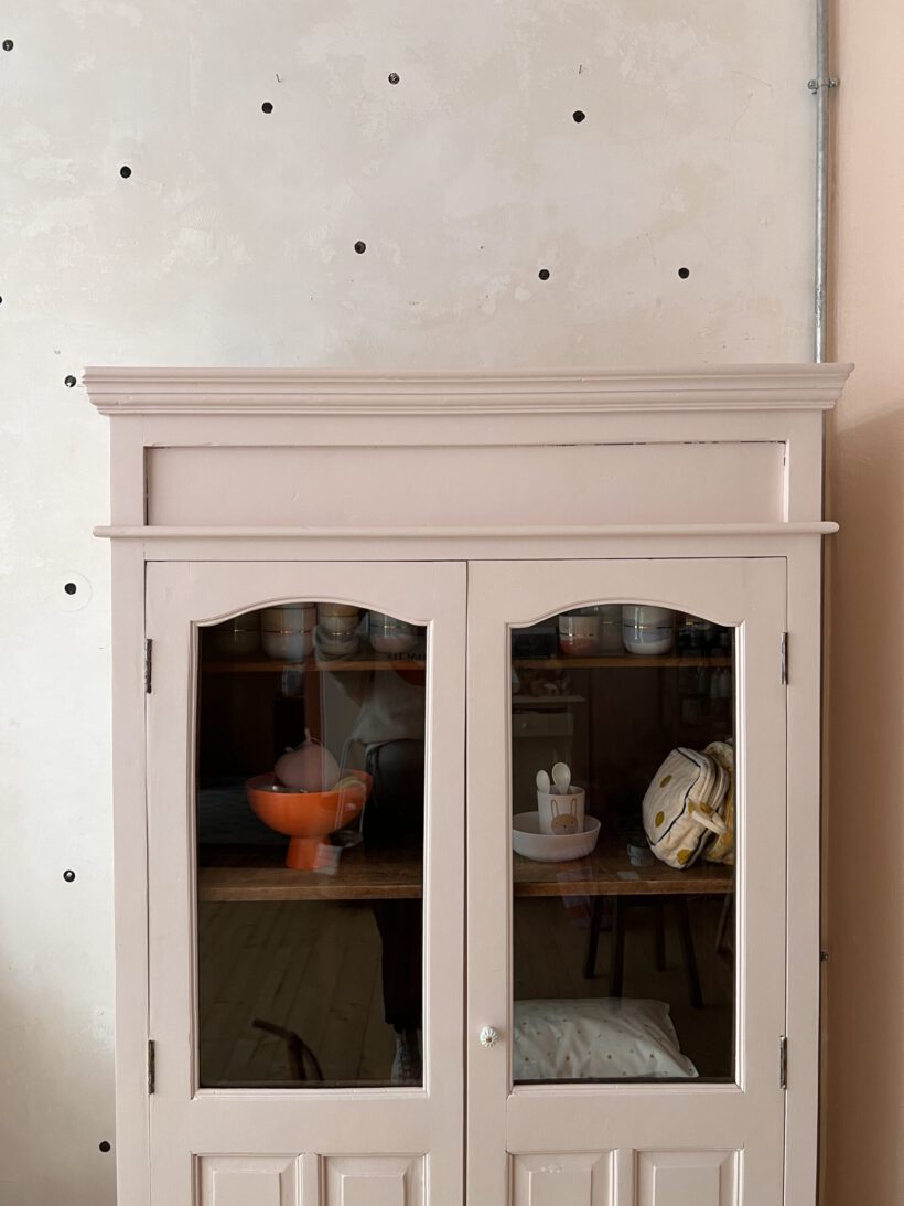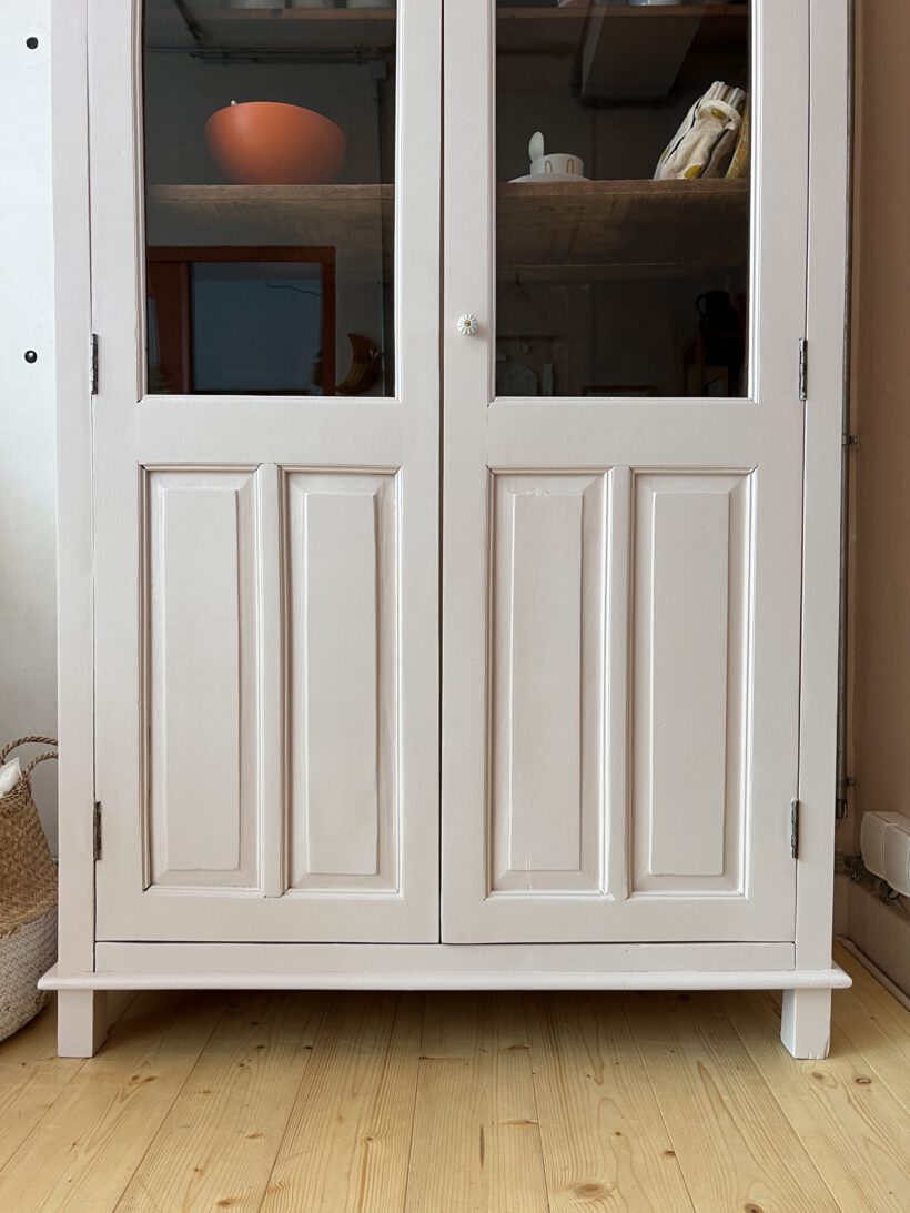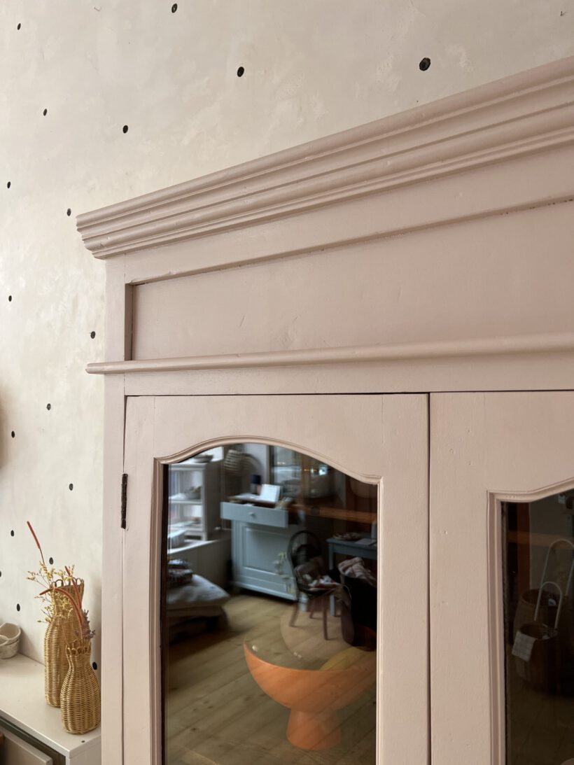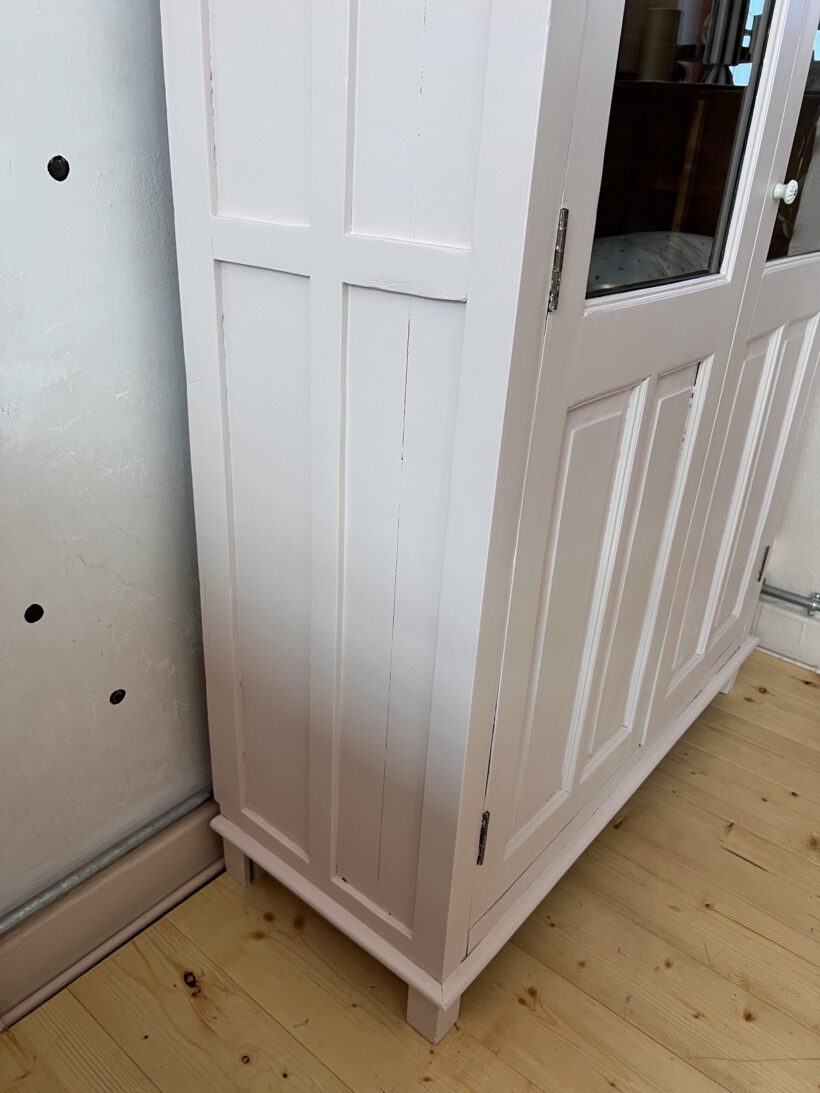Raika wurde von uns restauriert, ihr Holz teilweise ausgebessert, innen hat sie eine kleine Tassenablage von uns bekommen und sie wurde geschliffen, grundiert und zwei Mal lackiert. Ihr Farbton ist ein zartes rosa von Farrow and Ball.
