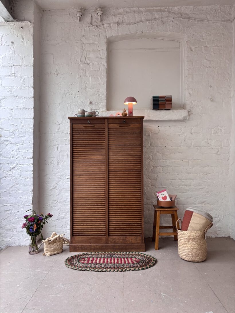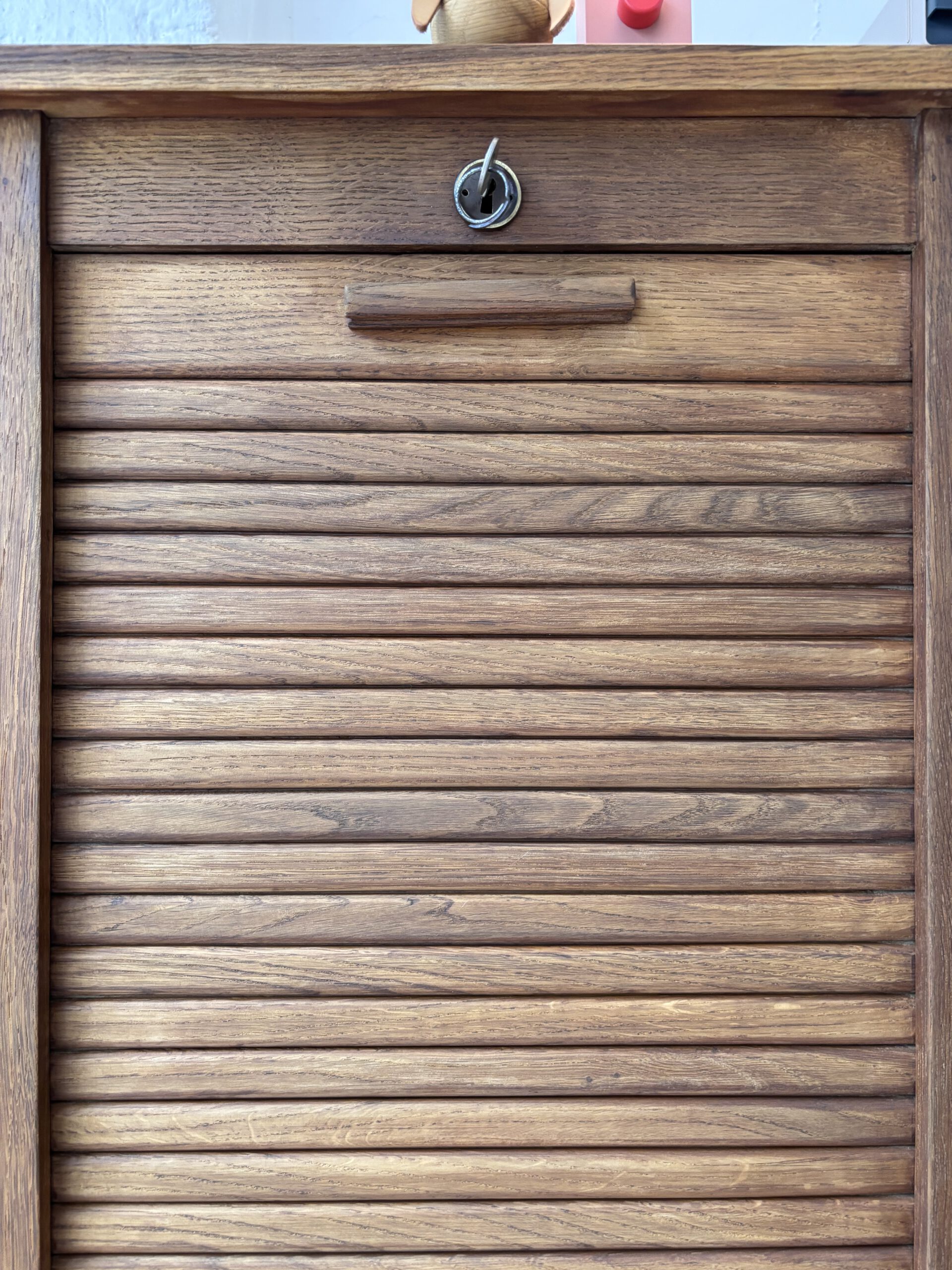 Renoir ist aus Eichenholz und hat sehr schöne Maße. Er ist im Korpus gerade mal 37 cm tief, was ihn zu einem Allrounder Talent in räumen macht. Und er hat auch eine schöne höhe von 150cm. Der warme Holzton schenkt eine angenehme Atmosphäre und die schmalen Maße machen ihn vielseitig einsetzbar. Renoir hat zwei Rolladentüren, die sich durch den Schlüssel leicht öffnen und durch hochschieben wieder schließen. Die Böden sind herausnehmbar und versetzbar. So kann man die Größe der einzelnen Fächer je nach Bedarf umstellen. Wir haben Renoir´s Holz schön geschliffen und mit einer Holzlasur im Farbton helle Eiche von Auro lasiert. Er ist wunderschön geworden. Ein toller Hingucker.