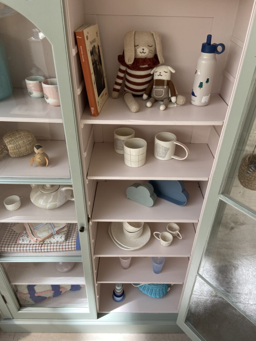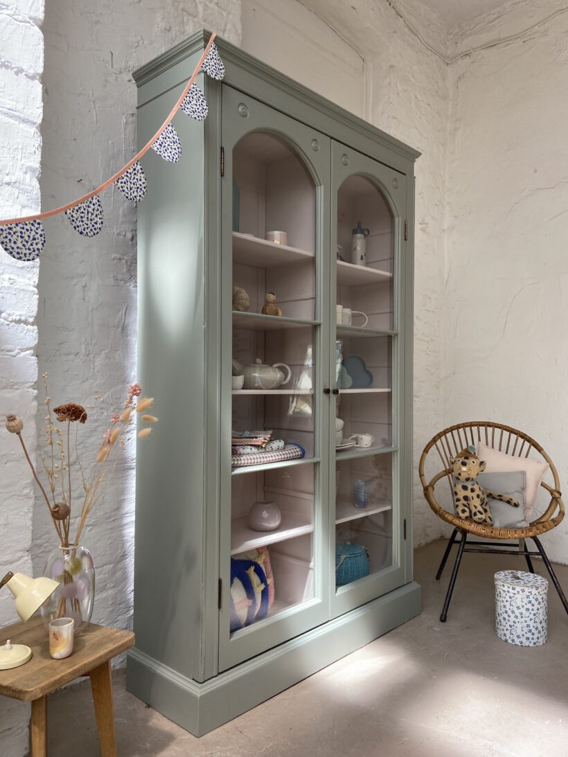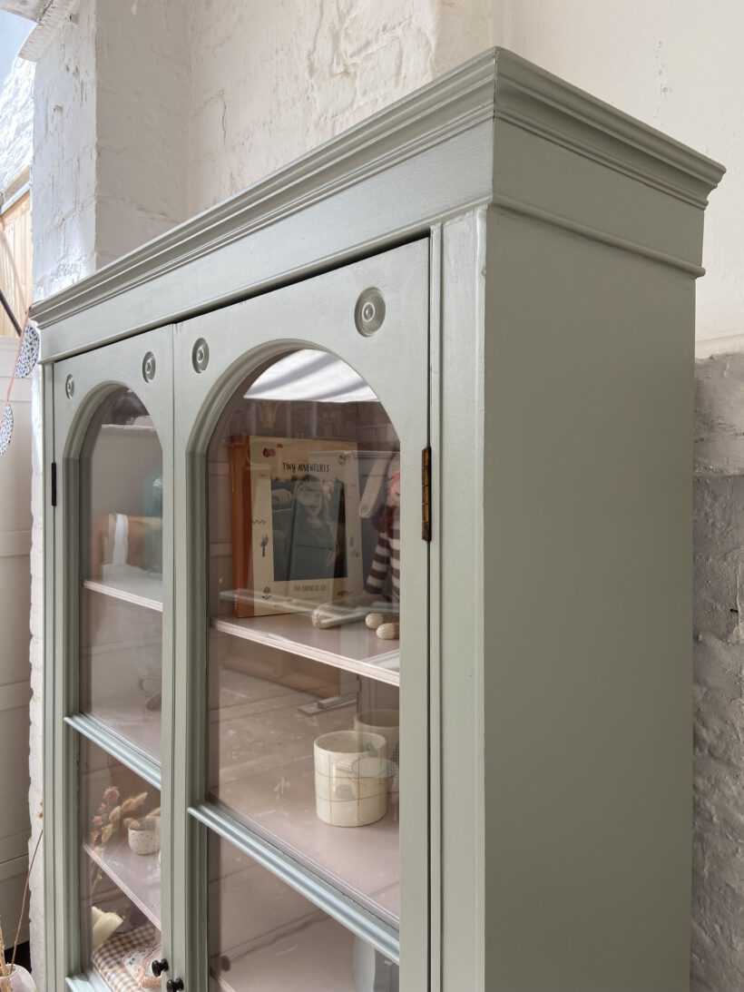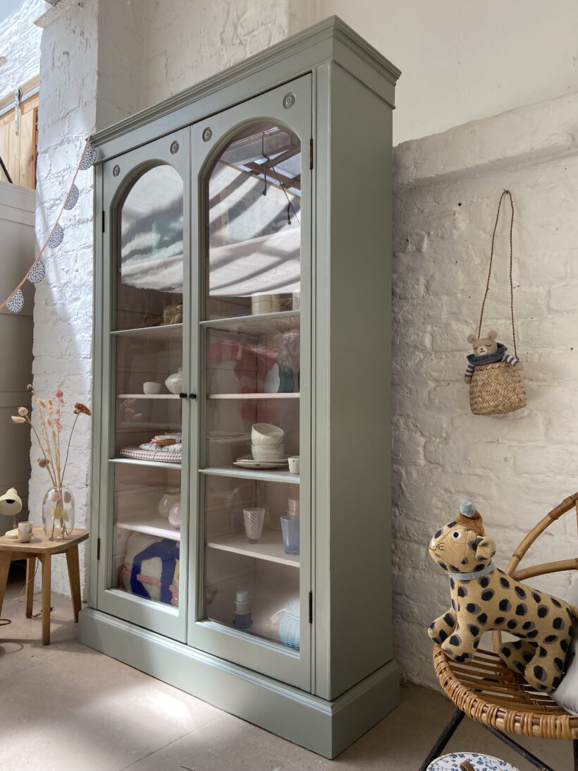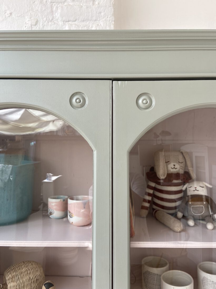Romeé hat ein sehr ungewöhnliches und besonderes Design. Sie ist so schmal mit ihren nur 33 cm Tiefe, dass sie als Schrank in den kleinsten Räumen wunderschön aussieht und kaum Raum einnimmt. Die großen Glasscheiben geben eine tolle Aussicht auf die ausgestellten Schätze und die vielen Fächer bieten dazu massig Stauraum! Besonders charmant an den Türen ist der Rundbogen der Scheiben und die kleinen runden geschnitzten Holzvertiefungen. Besonders charmant sind auch die Türknöpfe, sie öffnen und schließen die Türen ganz versteckt. Man muss sie nach rechts und links drehen um die Tren zu öffnen.