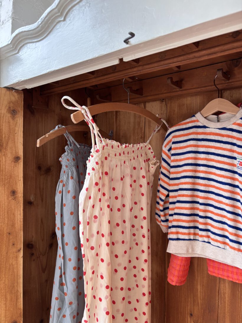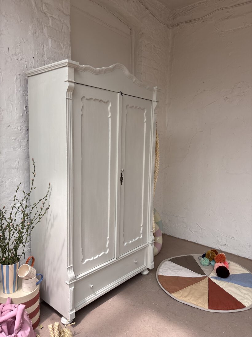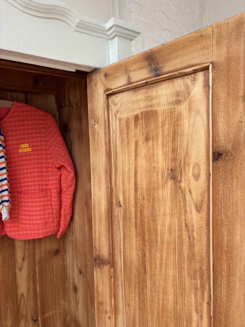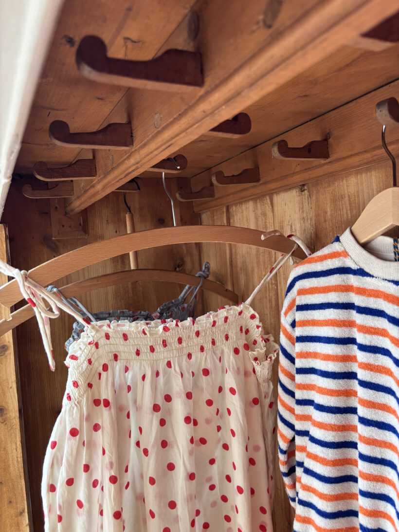 Innen hat sie noch ihre alten Kleidergarderoben- Hacken. Falls ihr wünscht ersetzen wir diese gerne mit einer Kleiderstange. Auch Böden können wir auf Wunsch montieren: https://tutuettata.de/product/einlegeboeden/