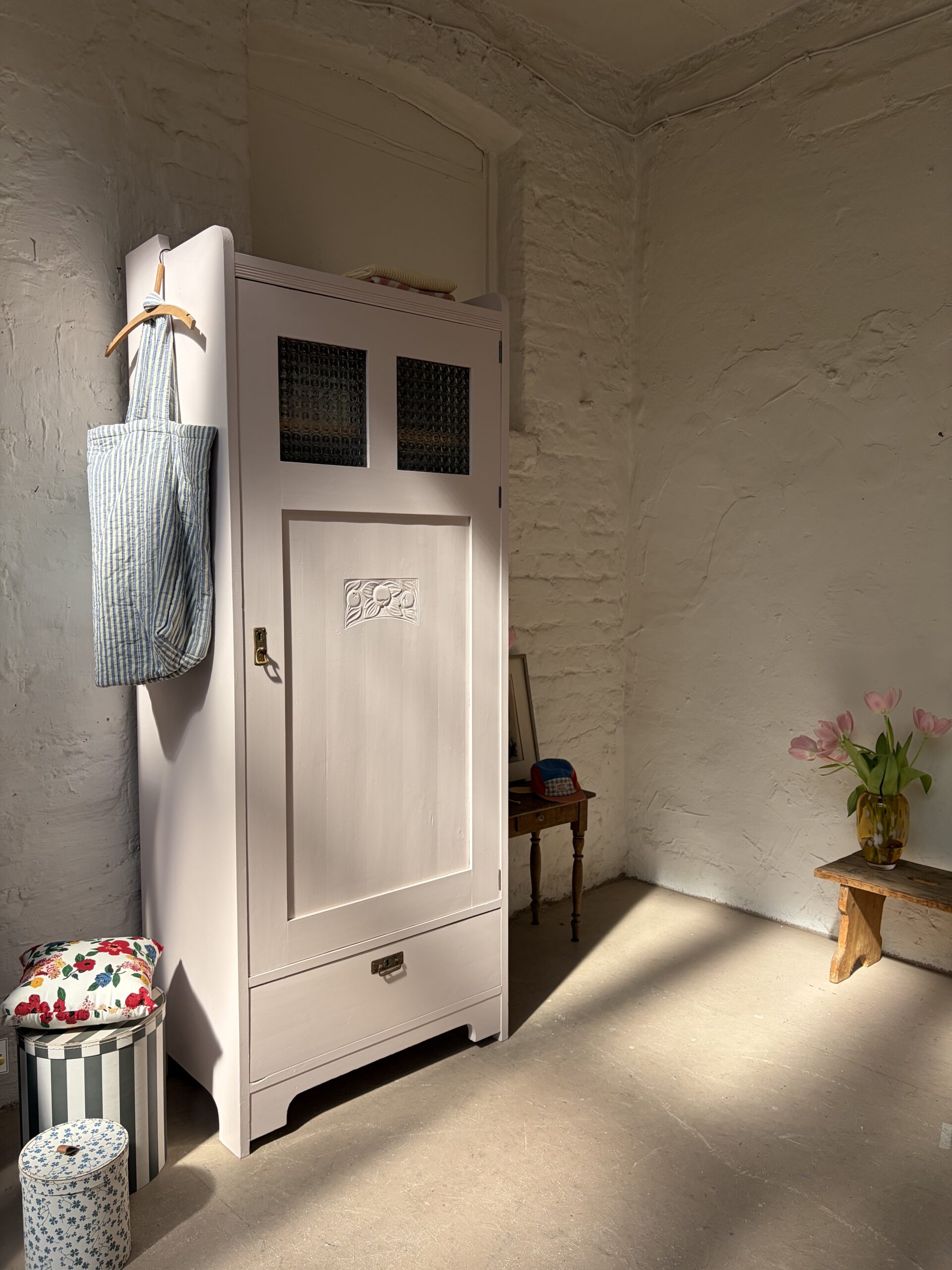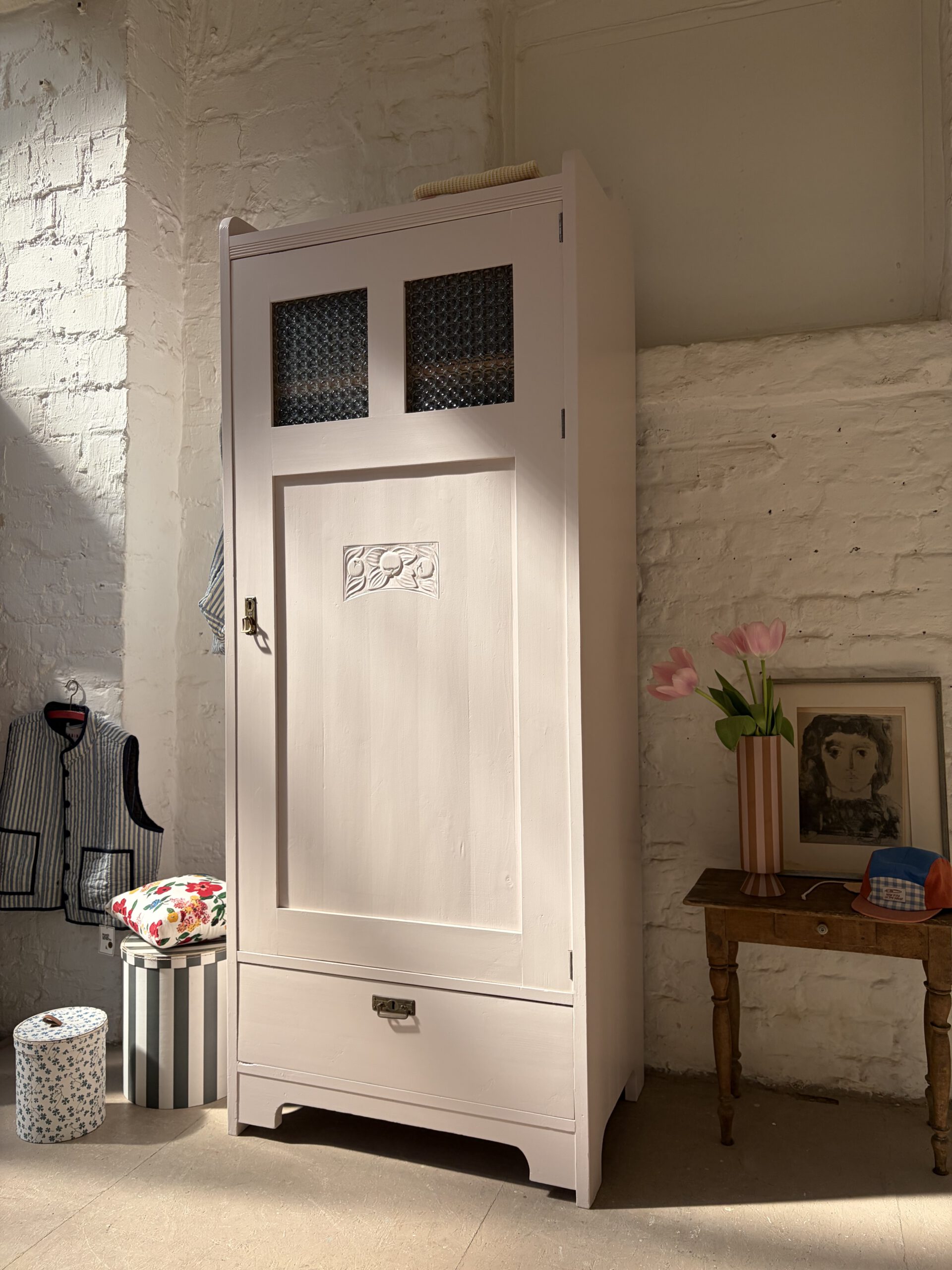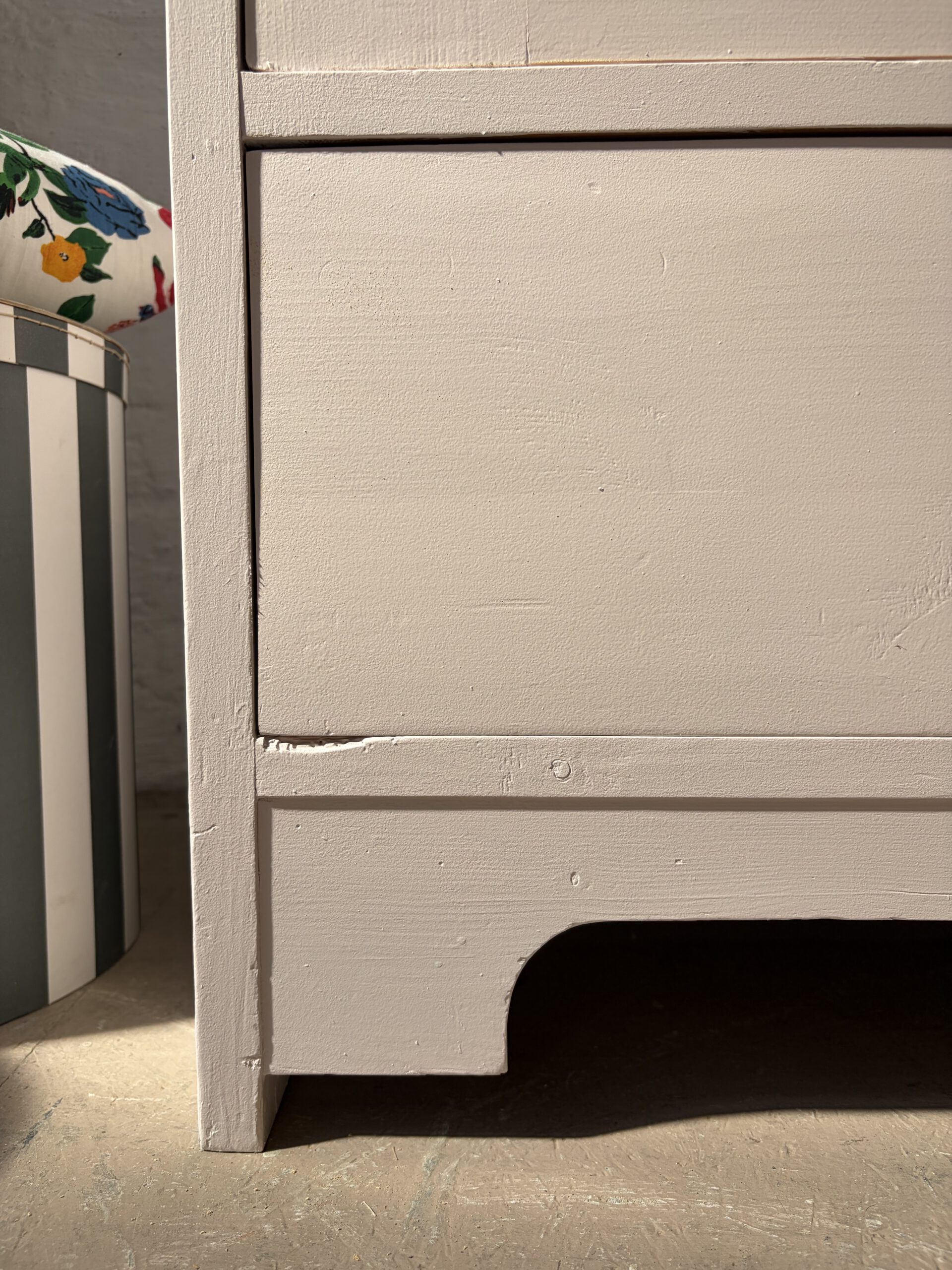 Wir haben Rune restauriert, ihr Holz und einige Stellen repariert, grundiert und drei Mal lackiert in unserm Lieblings Rosa von Farrow and Ball. Innen hat sie fünf Legefächer und ist sehr geräumig. Ihr Holz hat Patina und zeigt wunderschöne Spuren der Zeit, die ihren ganz individuellen Charme ausmachen.