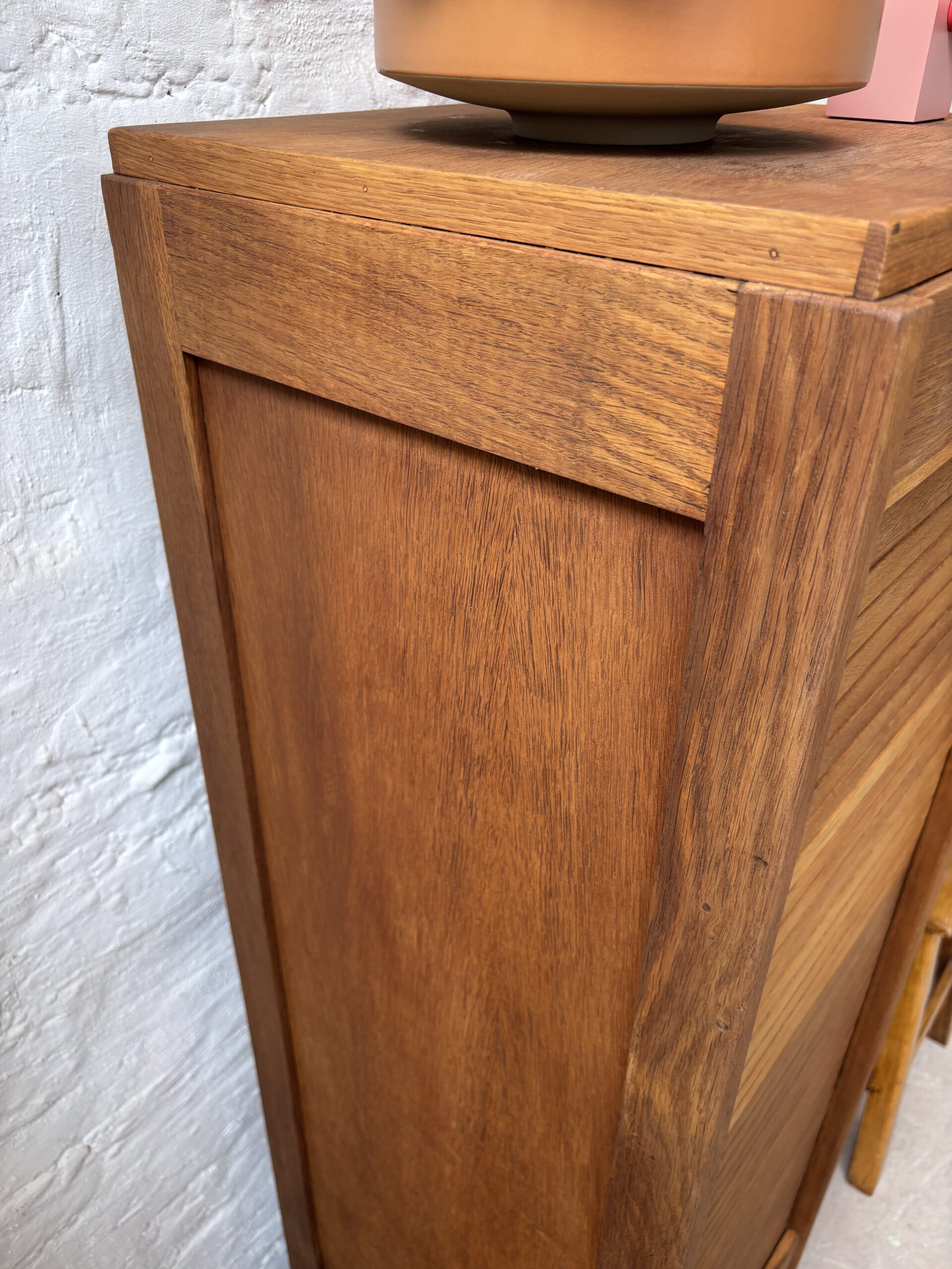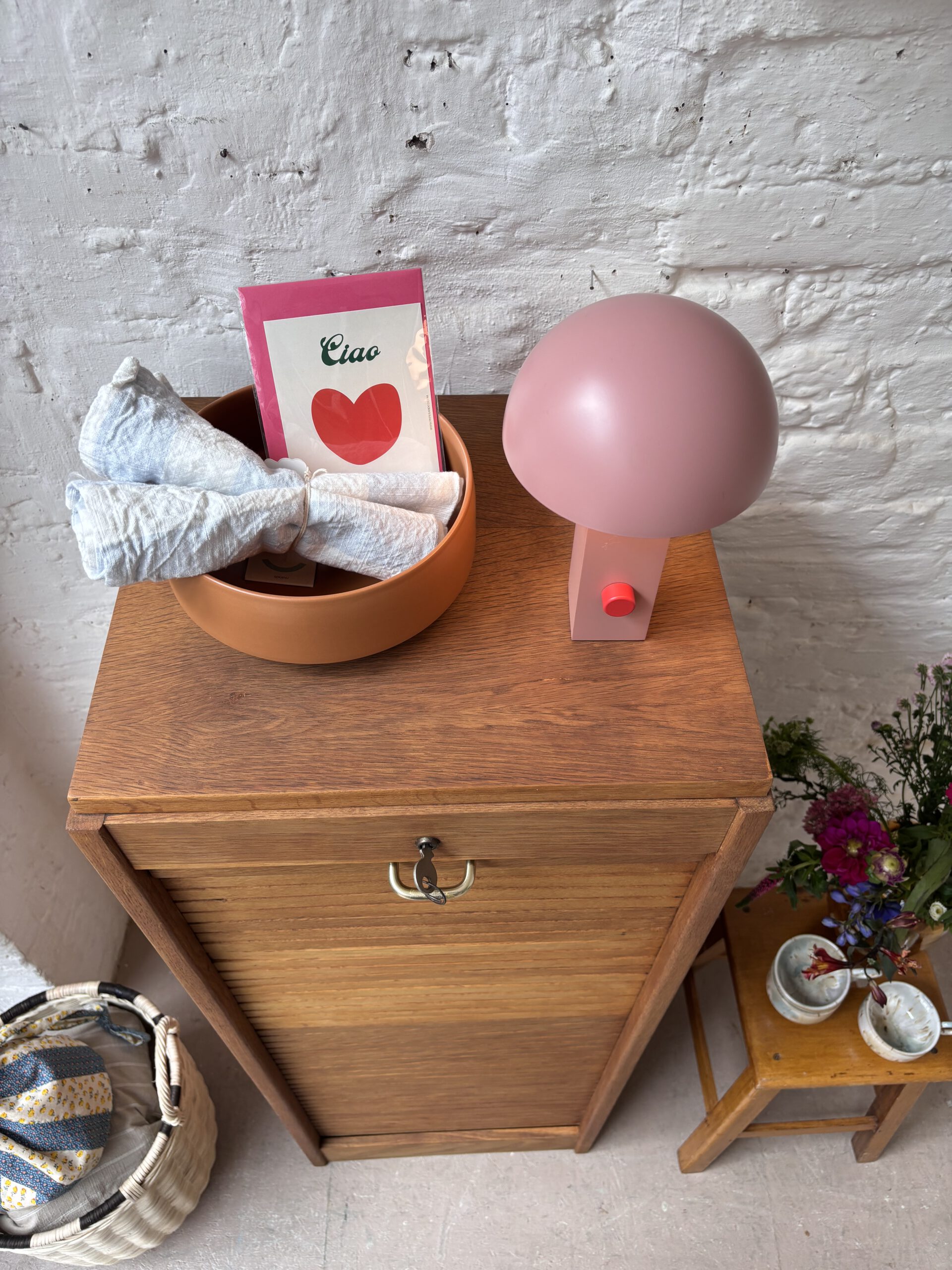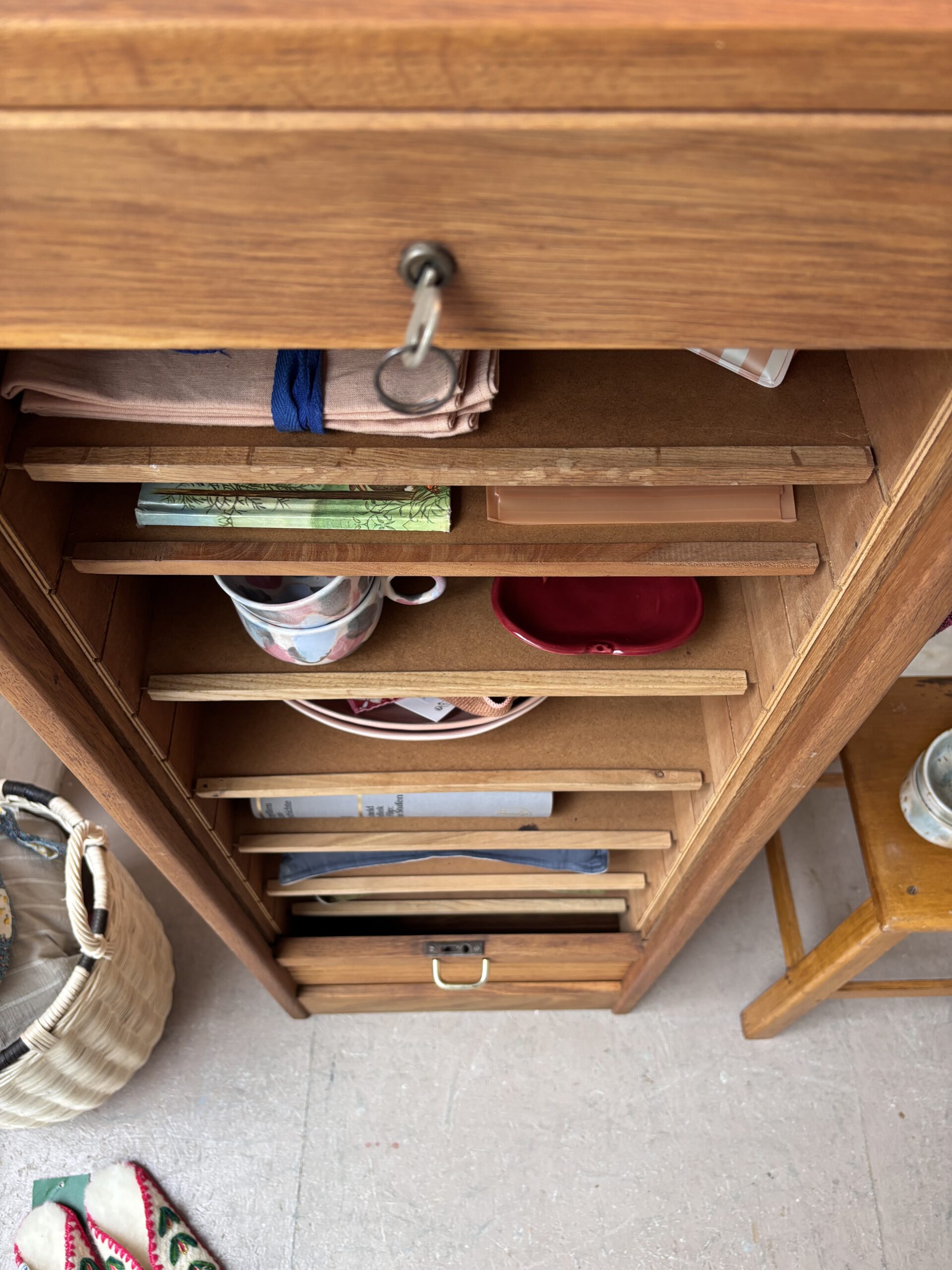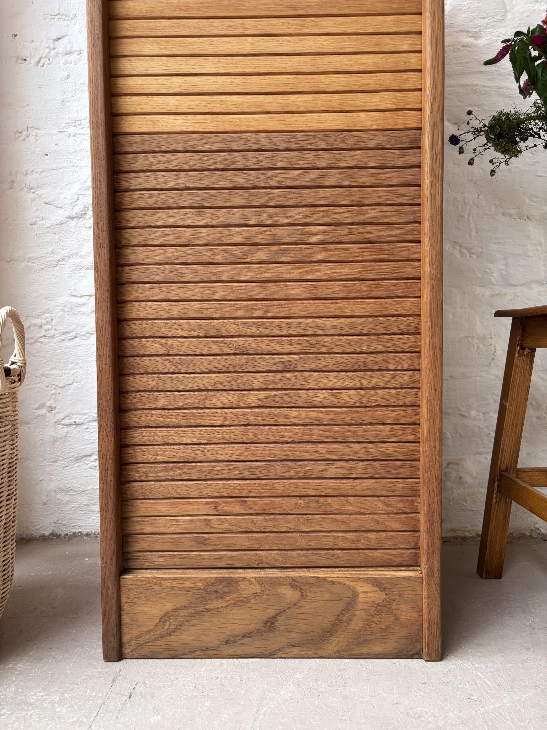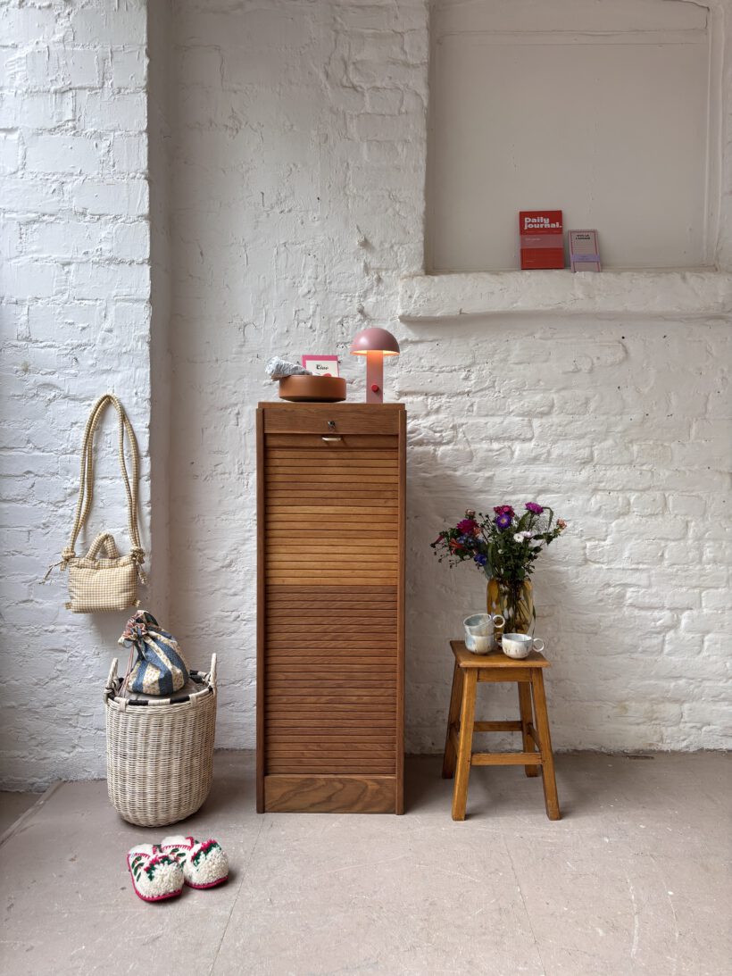 Er ist aus Eichenholz, hat eine so schöne Patina und in der Front eine Besonderheit: Der Rolladen besteht aus zwei verschiednen Hölzern (im oberen Teil vermutlich Pinie oder Esche) dadurch hat er einen ganz besonderen Look, den wir sehr lieben. Und wir hoffen ihr auch!