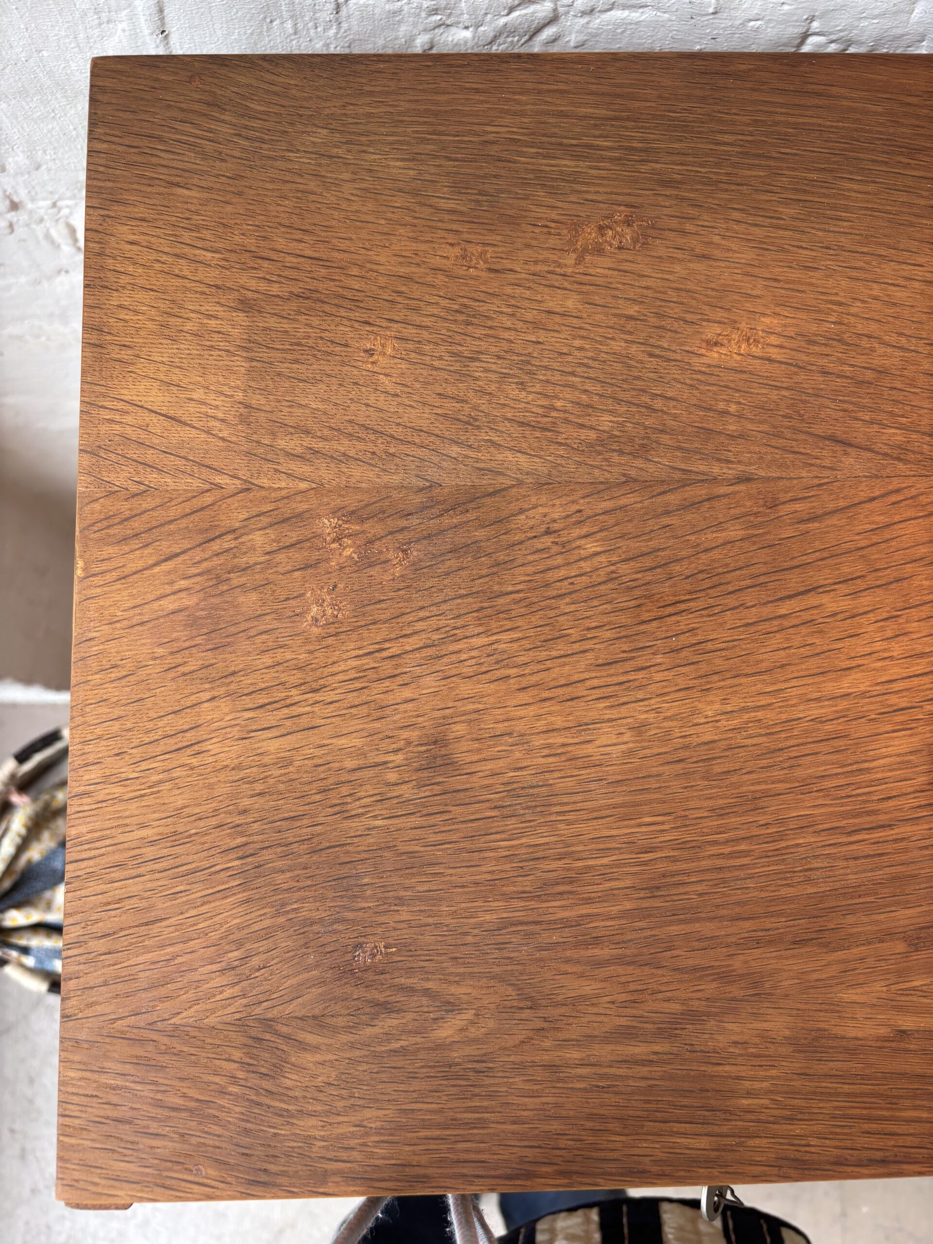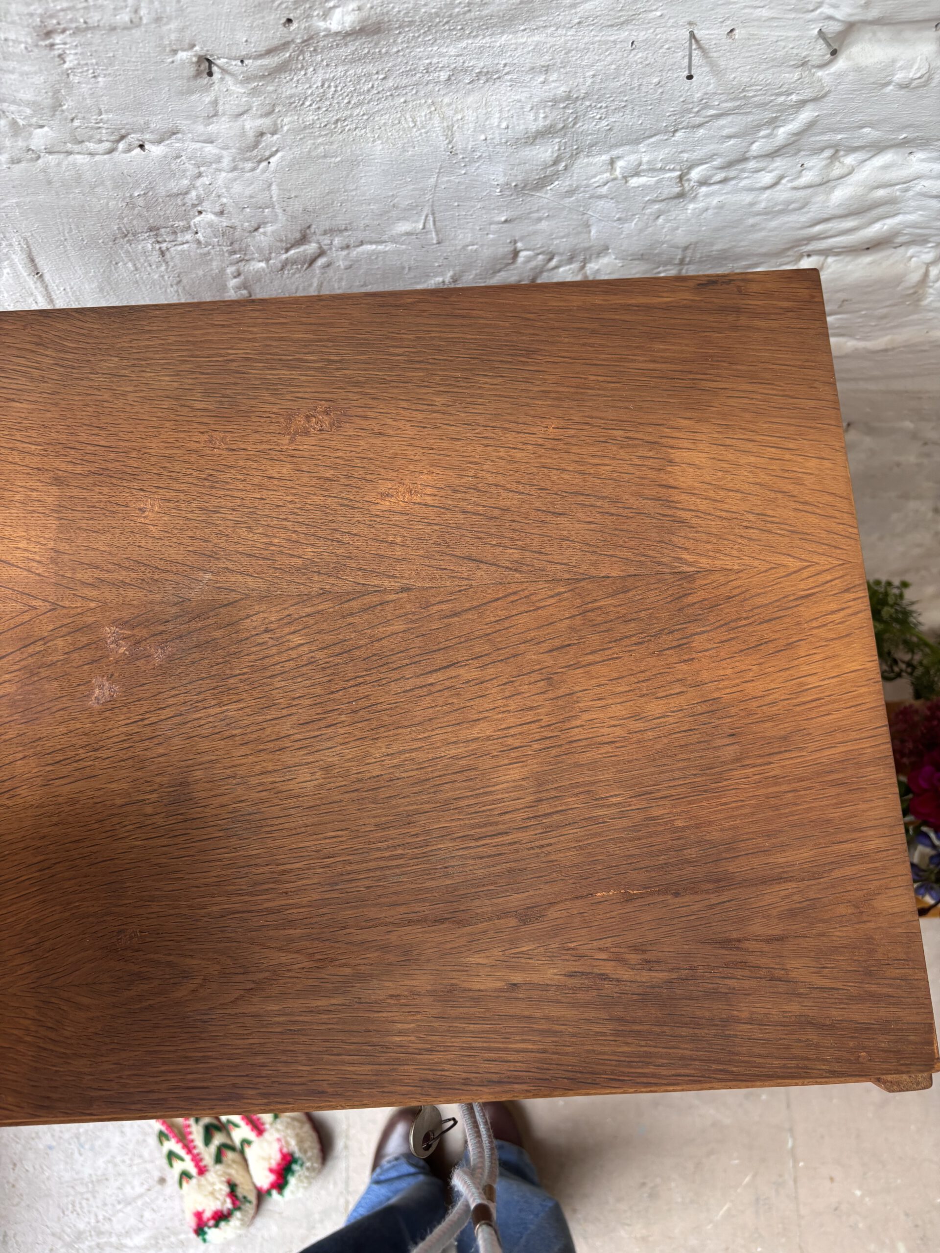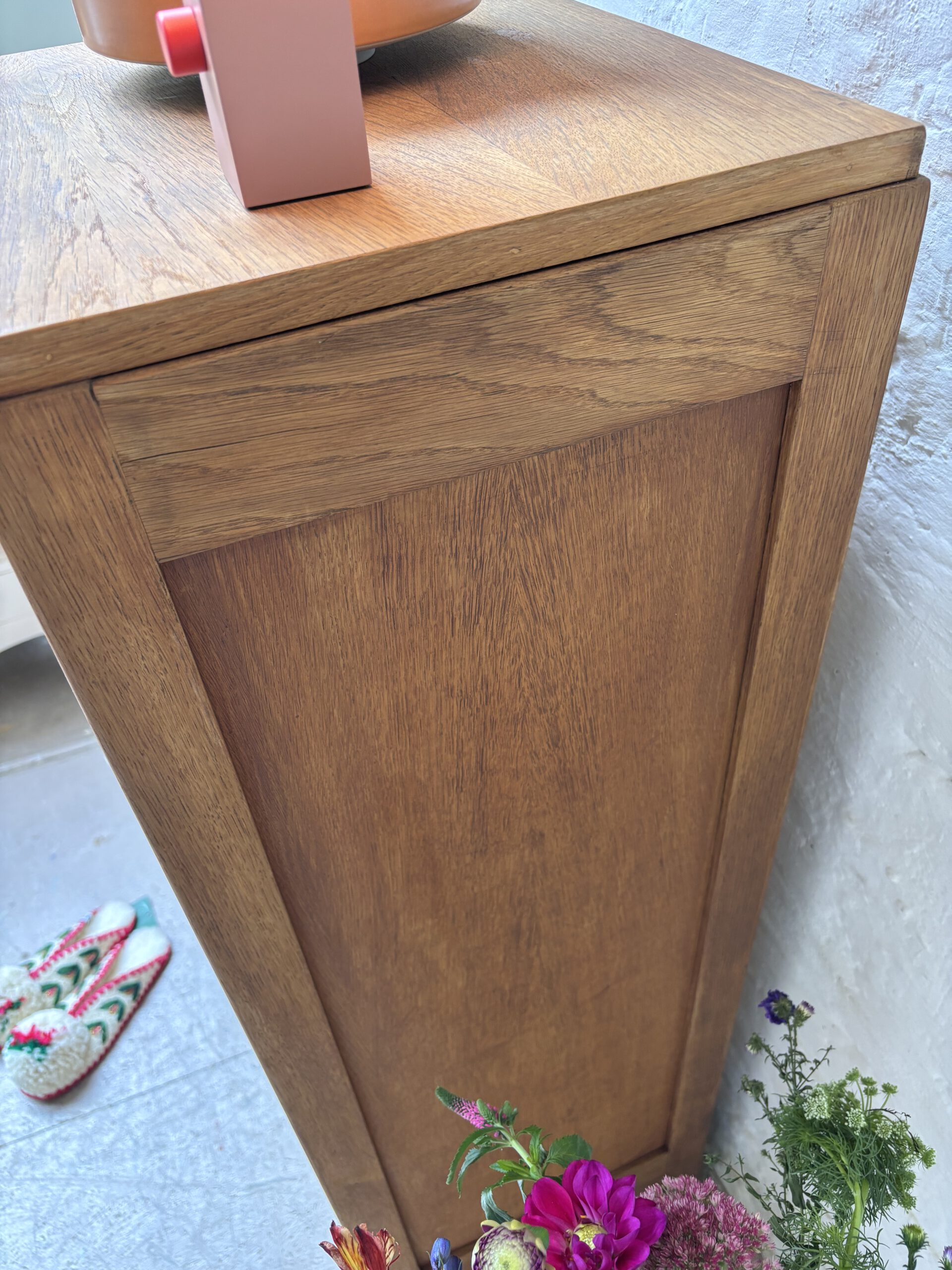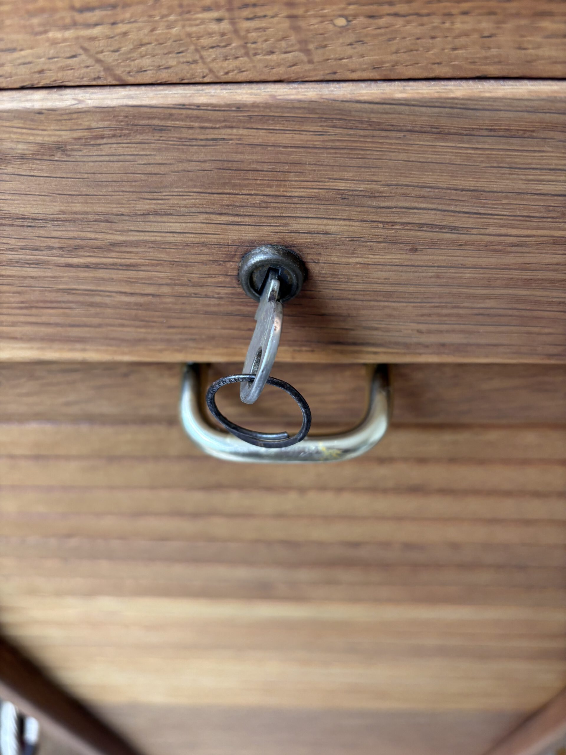 Er ist aus Eichenholz, hat eine so schöne Patina und in der Front eine Besonderheit: Der Rolladen besteht aus zwei verschiednen Hölzern (im oberen Teil vermutlich Pinie oder Esche) dadurch hat er einen ganz besonderen Look, den wir sehr lieben. Und wir hoffen ihr auch!