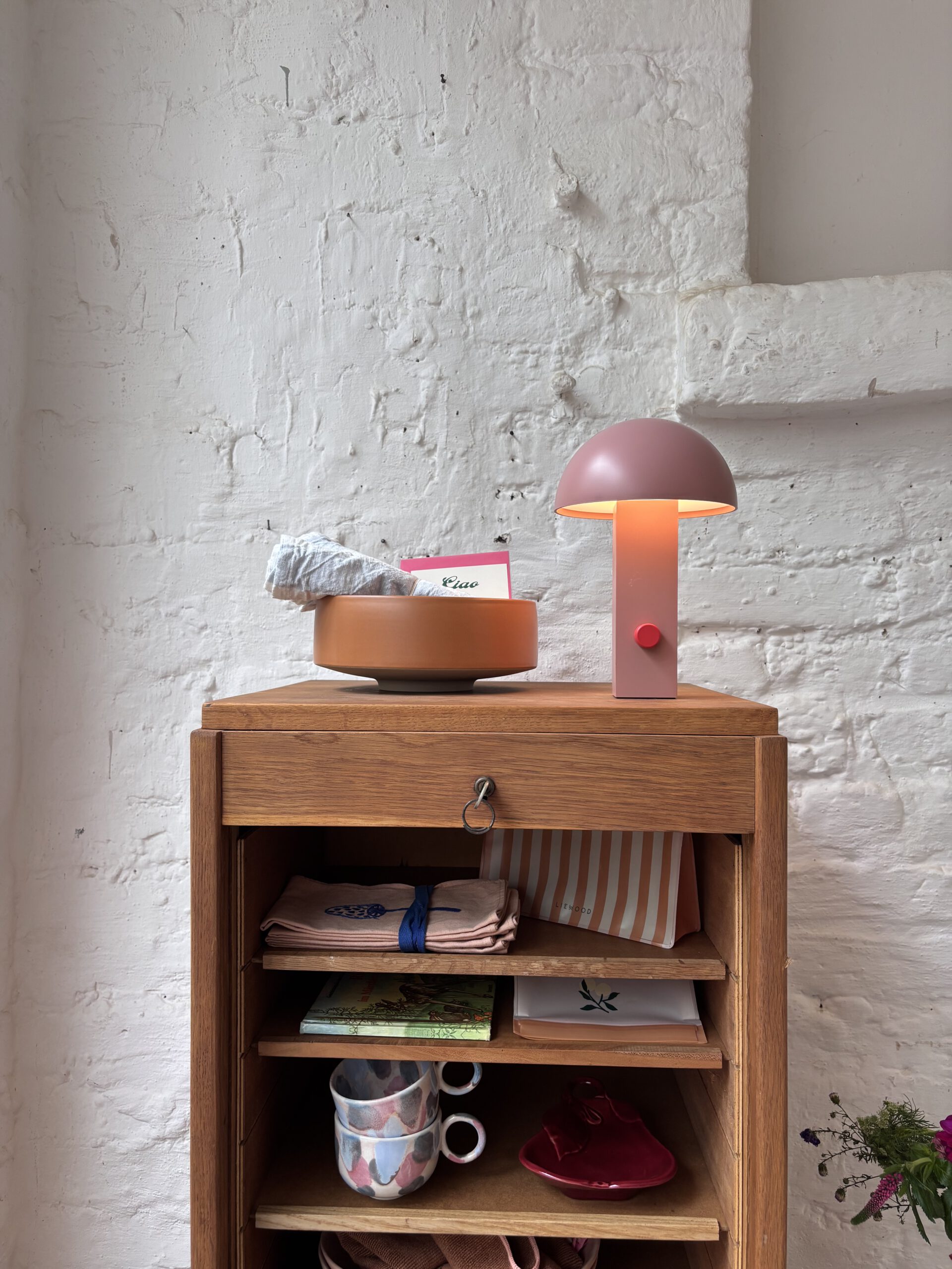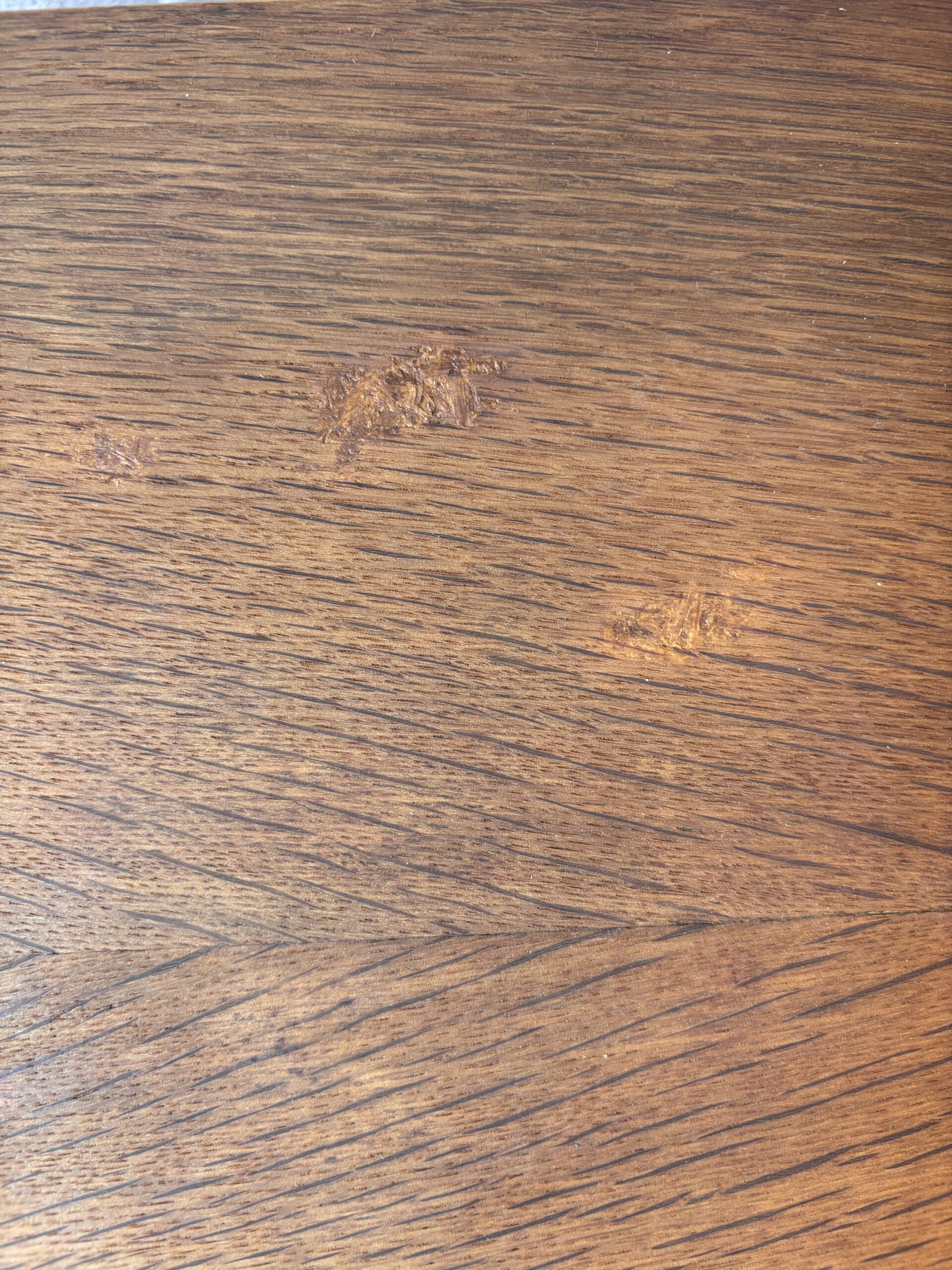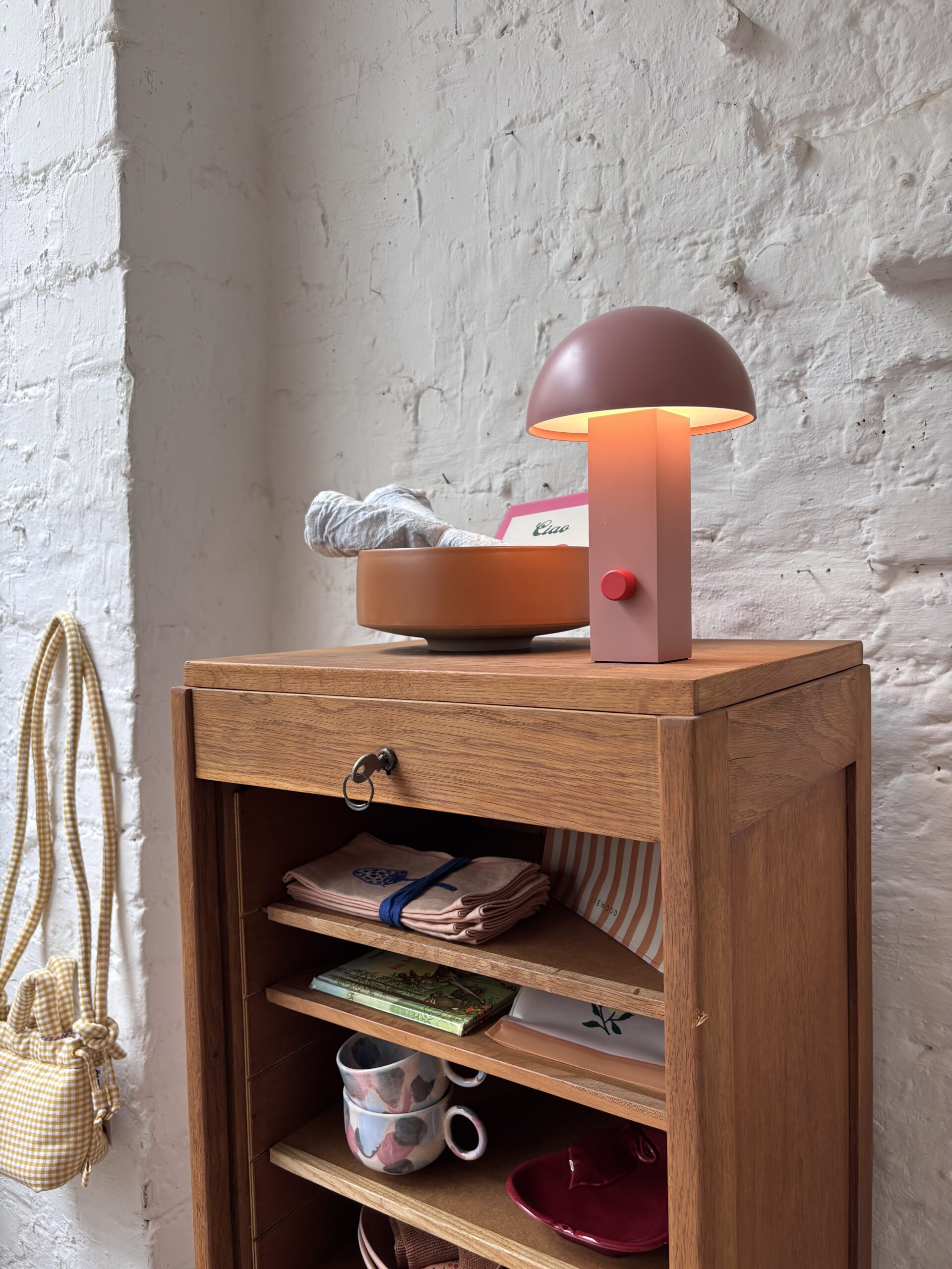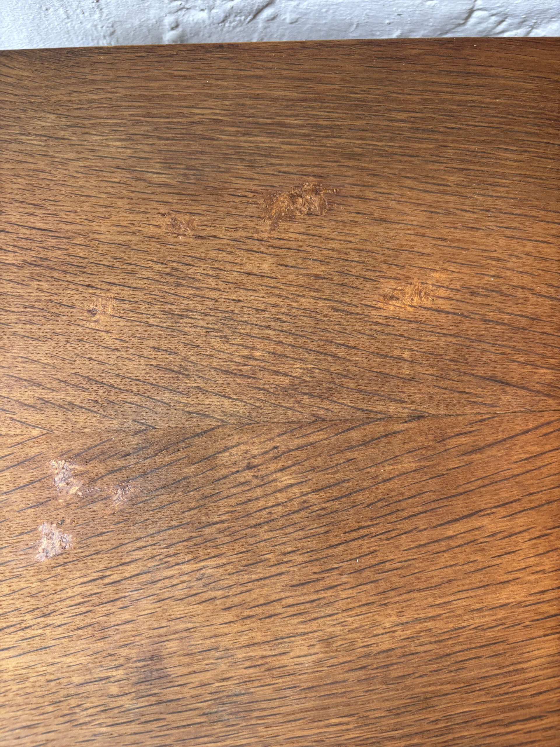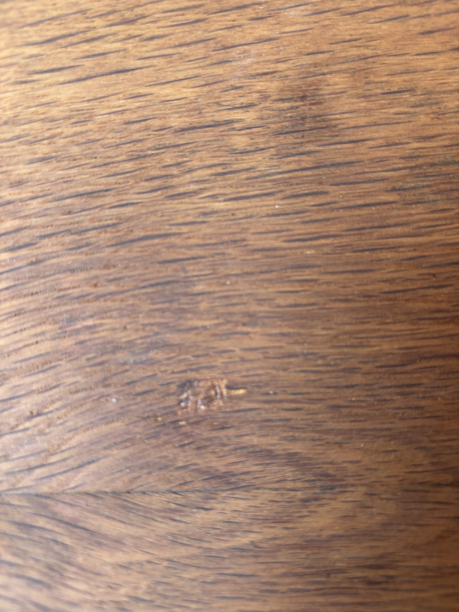 Er ist aus Eichenholz, hat eine so schöne Patina und in der Front eine Besonderheit: Der Rolladen besteht aus zwei verschiednen Hölzern (im oberen Teil vermutlich Pinie oder Esche) dadurch hat er einen ganz besonderen Look, den wir sehr lieben. Und wir hoffen ihr auch!