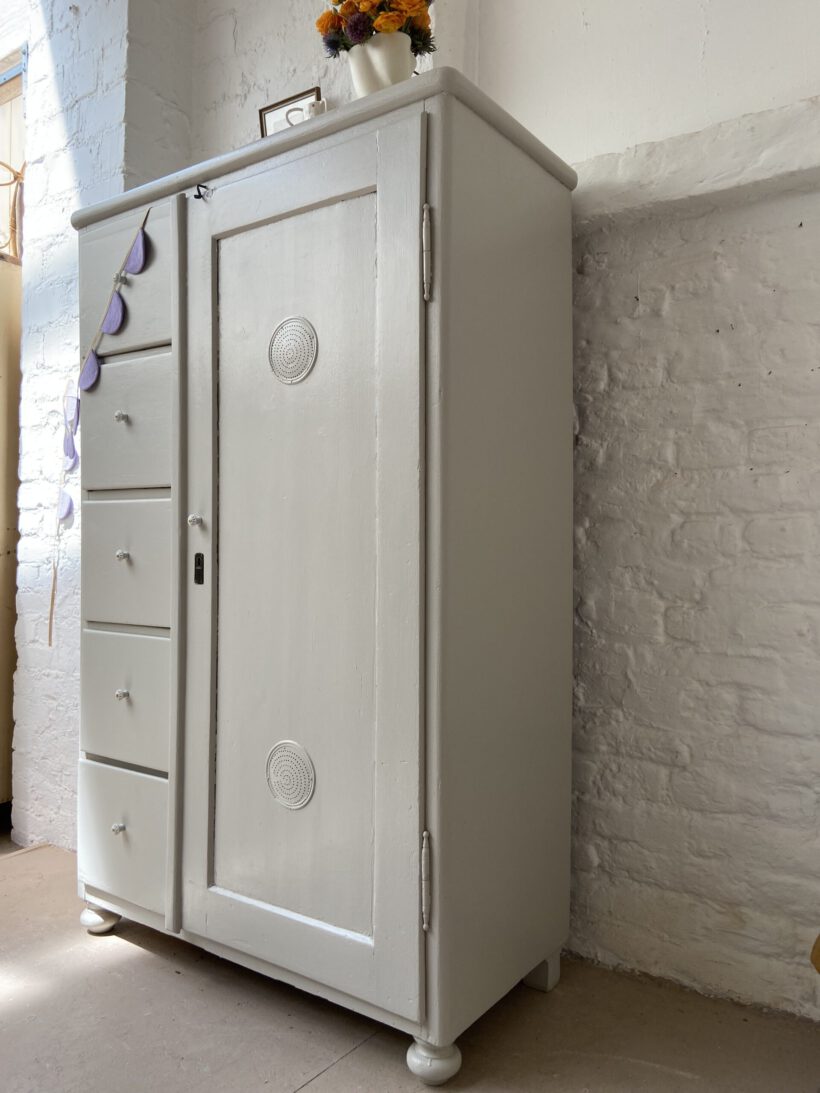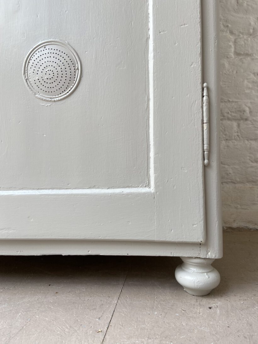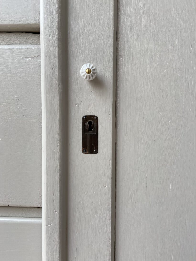 Silvas Türe wird mit einem antiken Haken geschlossen und geöffnet, da es kein passendes Schloss mehr gibt. Der Haken wir einfach mit der Hand nach oben geschoben und die Tür öffnet. Diese Art Türen zu schließen ist klassisch antik – wenn keiner da war, hat man sich damals auch einfach manchmal mit einem gebogenen Nagel beholfen;-) Einfach sweet! Alle Türen an Brotschränken sind so konzipiert, dass die Tür gleichzeitig auch die Schubladen schließt, damit niemand die guten Vorräte klauen kann;-)