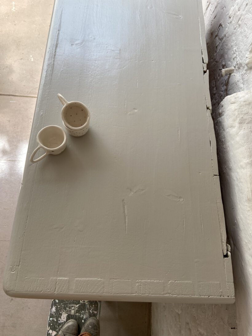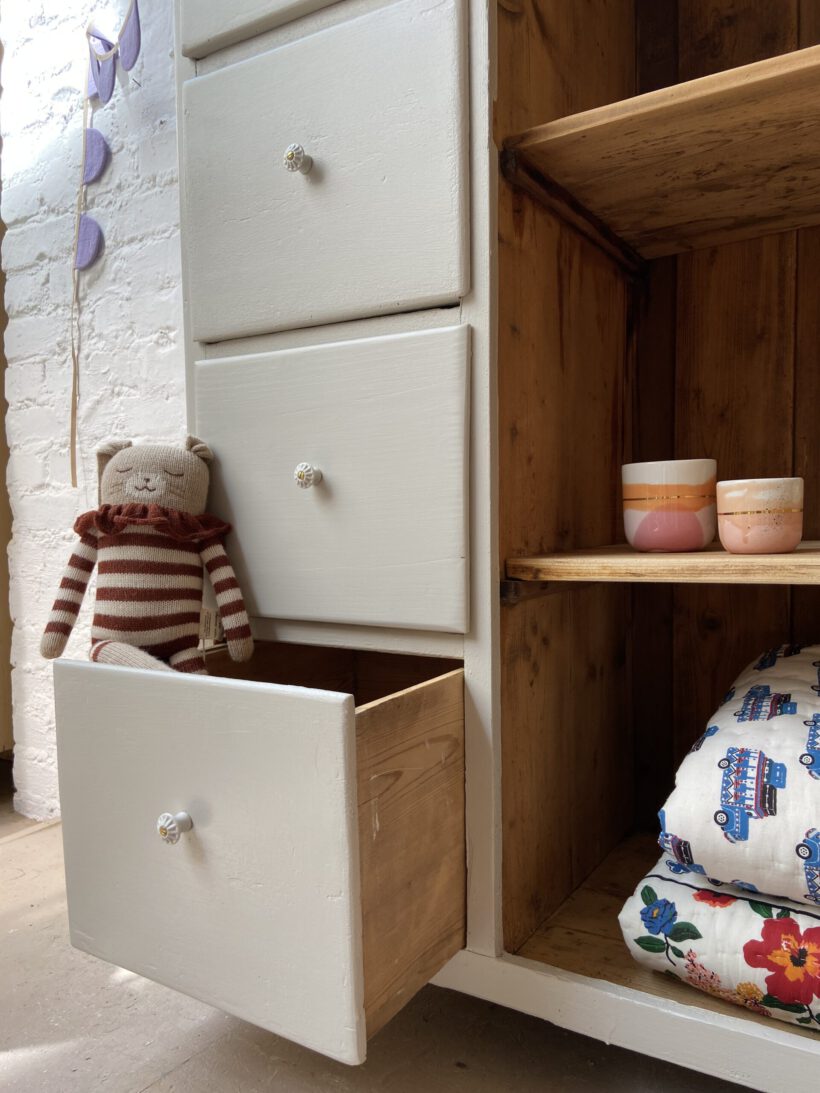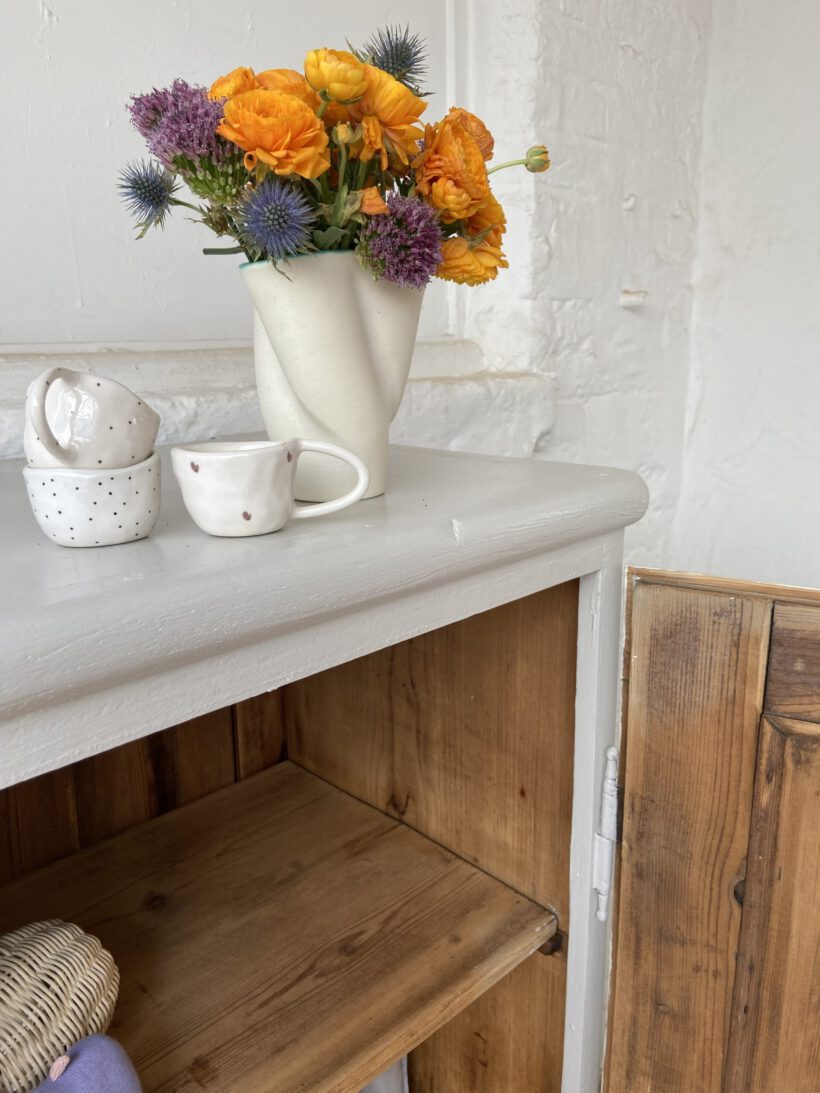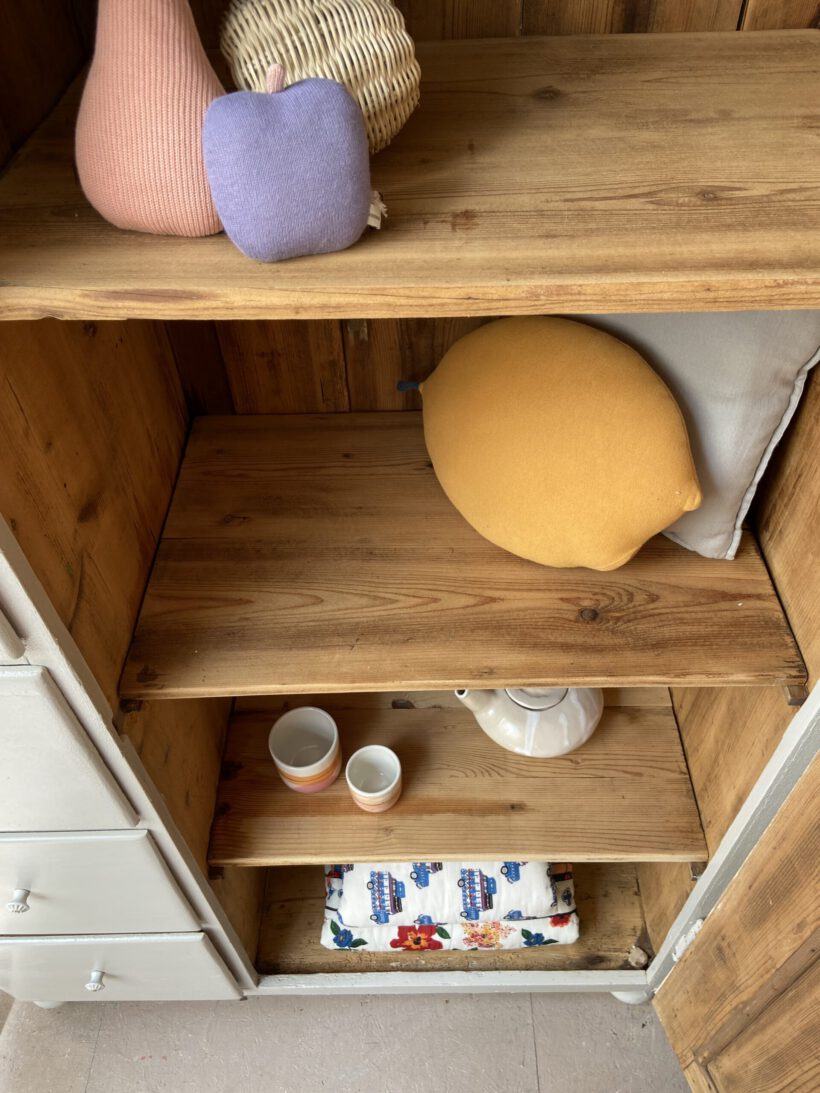 Silvas Türe wird mit einem antiken Haken geschlossen und geöffnet, da es kein passendes Schloss mehr gibt. Der Haken wir einfach mit der Hand nach oben geschoben und die Tür öffnet. Diese Art Türen zu schließen ist klassisch antik – wenn keiner da war, hat man sich damals auch einfach manchmal mit einem gebogenen Nagel beholfen;-) Einfach sweet! Alle Türen an Brotschränken sind so konzipiert, dass die Tür gleichzeitig auch die Schubladen schließt, damit niemand die guten Vorräte klauen kann;-)