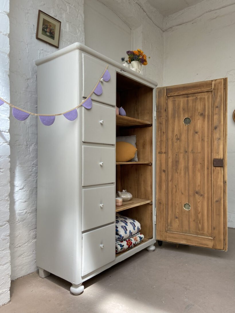unser liebster neuer Brotschrank! Bei diesem antiken Schätzchen handelt es sich um einen klassischen Brotschrank mit einer Tür rechts und fünf Schubladen für besonders viel Stauraum. Auch die vier Fächer im Schrankinneren bieten Platz ohne Ende. Je nach Wunsch lassen sich die Böden einfach entnehmen, um ihn in der Größe zu variieren.