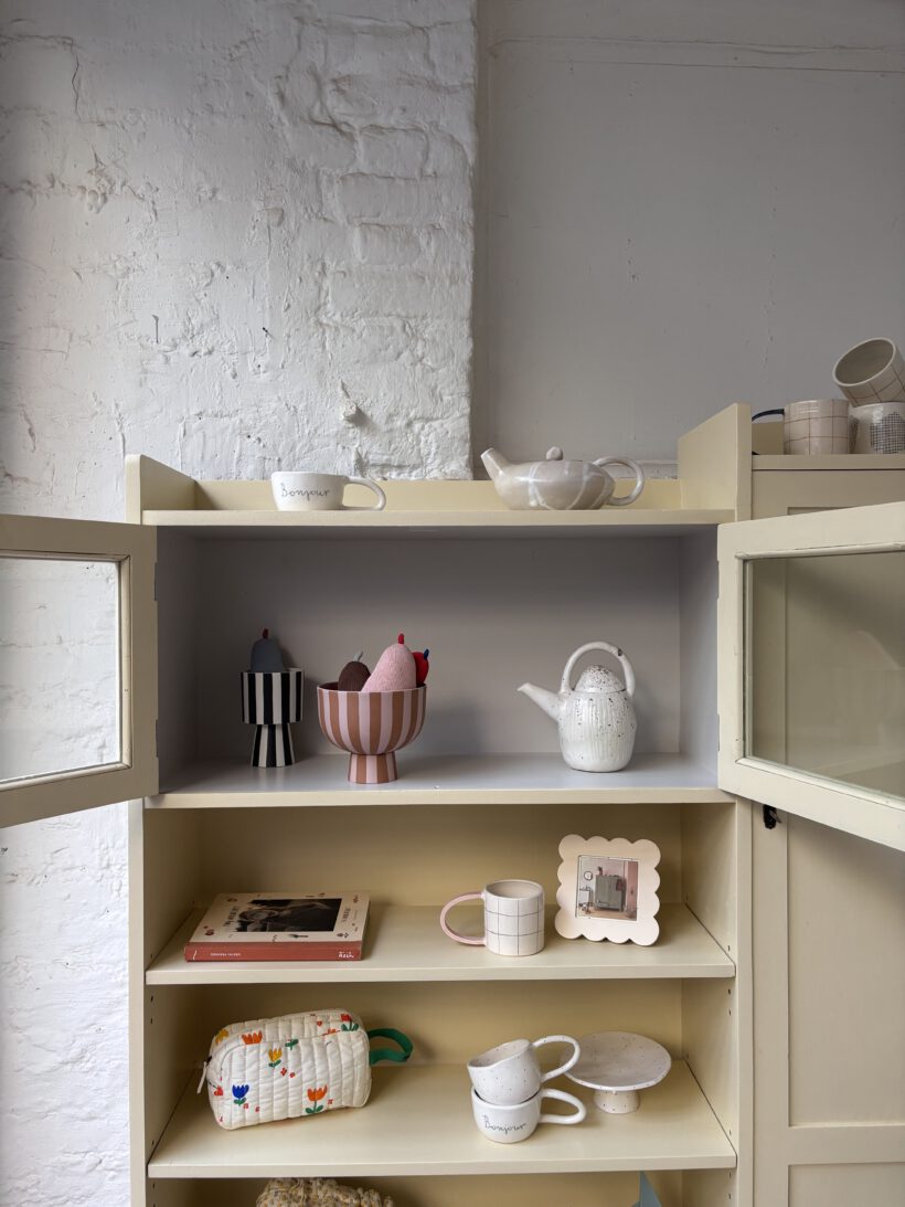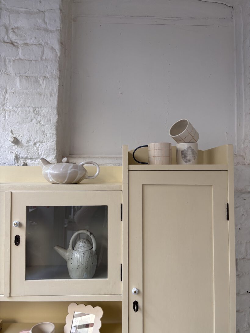 Wir haben Sol in ein zartes Gelb von Farrow and Ball getaucht. Er wurde geschliffen, grundiert und zwei Mal lackiert. Die tür hat einen Schlüssel.