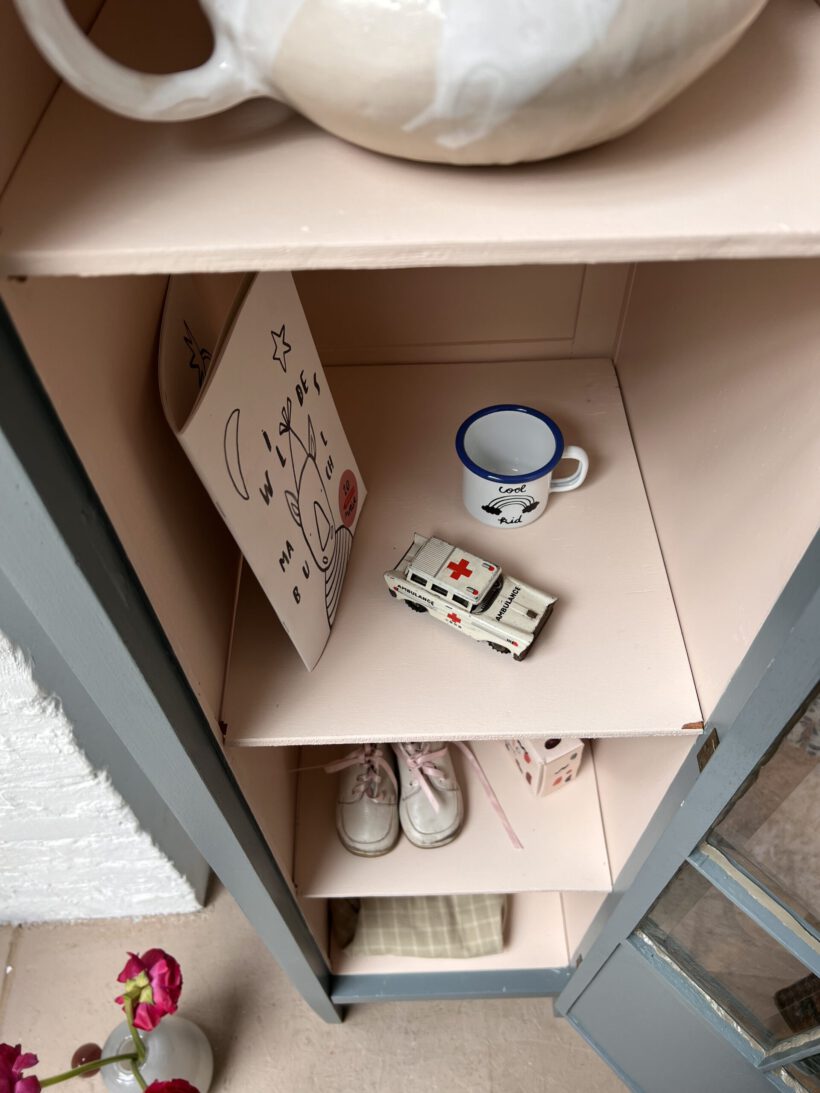 Sophia stammt aus Tschechien, sie hat ein ganz zartes und besonderes Design. Die Fenster sind noch aus original geschliffenem dicken Glas und die Füße zart und elegant. Wir haben Sophia außen in ein dunkles mattes blau und innen in ein rosa getaucht. Beide Farben sind von Farrow and Ball. Sophia wurde von uns restauriert, geschliffen, grundiert und zwei Mal lackiert. Die Fenster haben wir mit Fensterkitt neu eingesetzt.