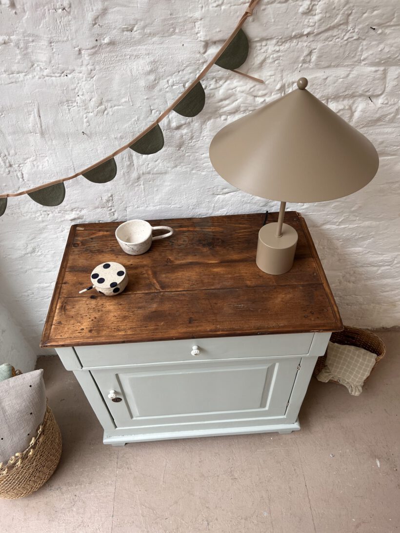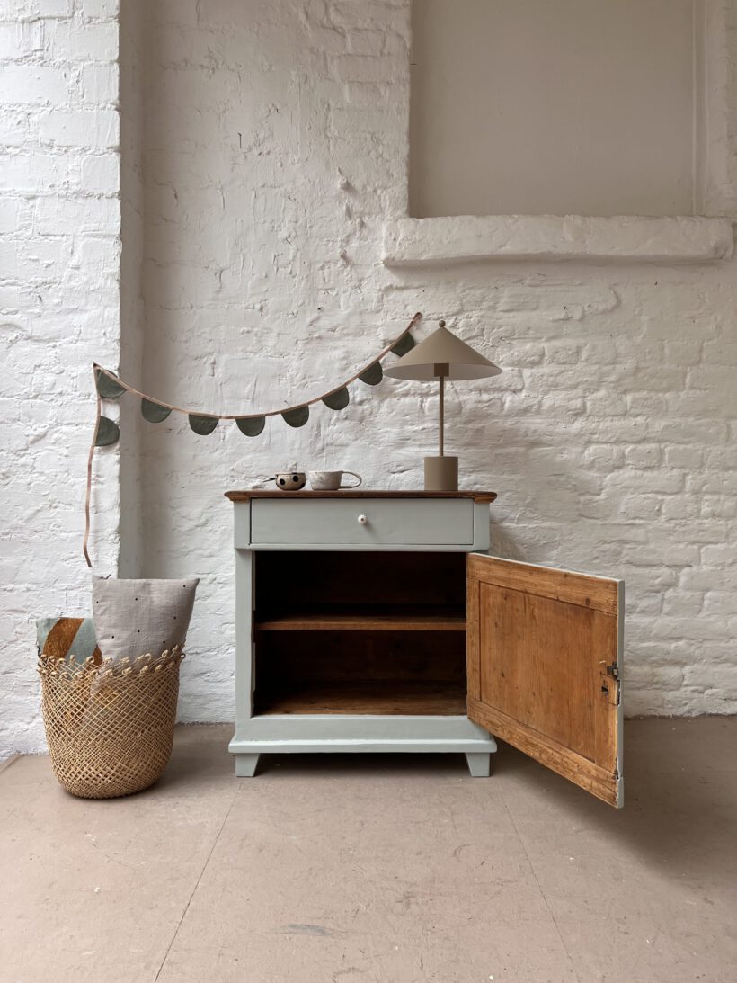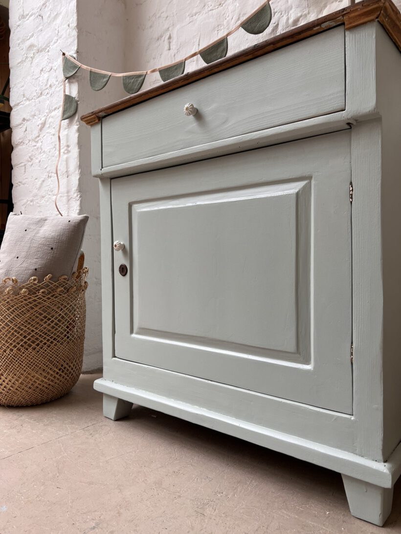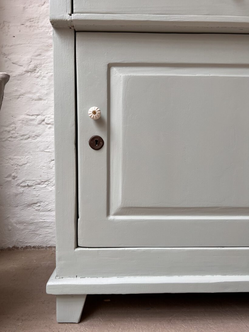 eine sehr besondere kleine antike Vitrine, diese Tammi. Tammi hat ein ungewöhnliches Design, ihre Tür ist breiter als hoch, was ihr einen ganz zauberhaften und niedlichen Look schenkt. Die Maße sind auch ungewöhnlich. Wir haben Tammi eine neue Farbe verpasst, ein zartes hellgraublau von Farrow and Ball. Dafür wurde Tammi´s Holz geschliffen, grundiert und zwei Mal lackiert. Die Platte haben wir so belassen wie sie war mit ihrer Patina, weil wir ihren Holzton wunderschön finden, es passt sehr gut mit dem hellblaugrau zusammen. Die Knöpfe und Beschläge stammen aus unserer eigenen Sammlung und sie neu angebracht.