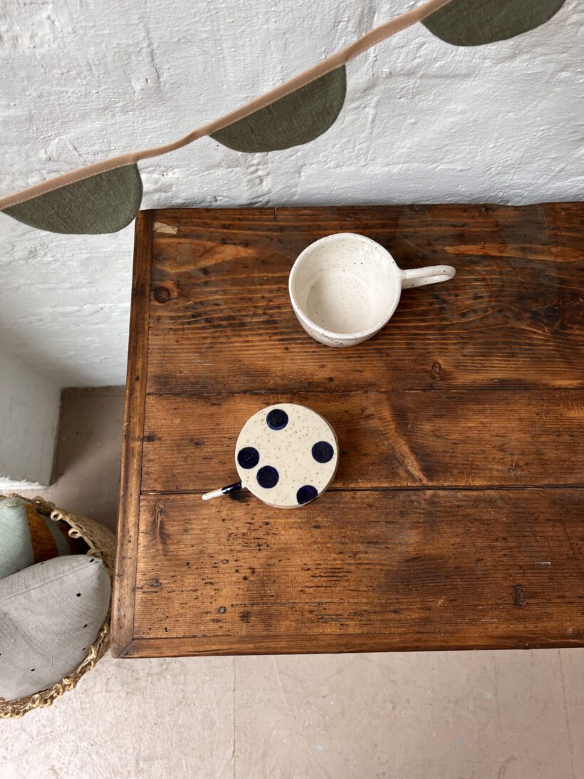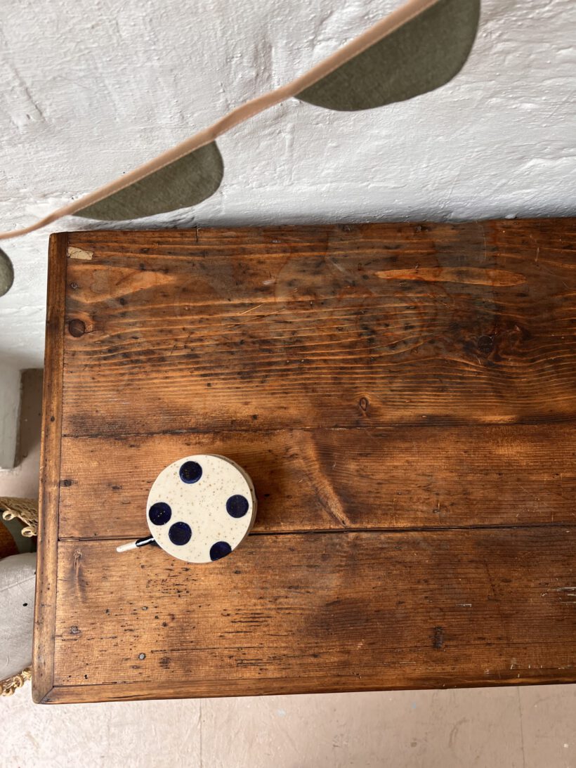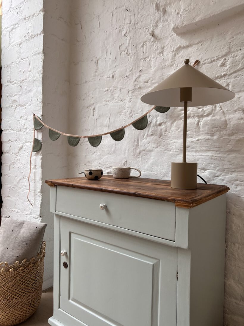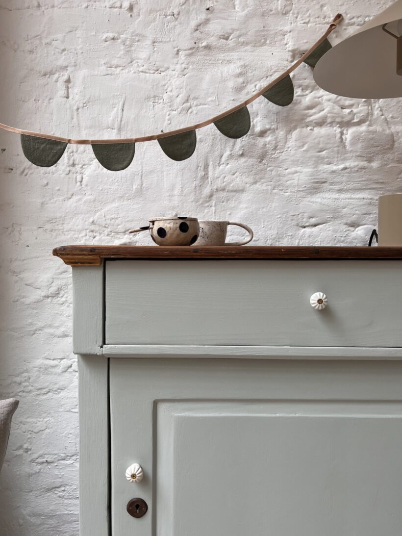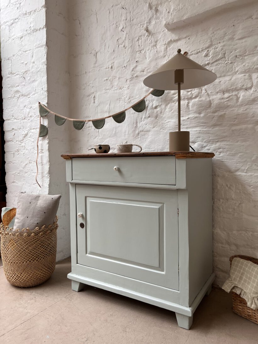 eine sehr besondere kleine antike Vitrine, diese Tammi. Tammi hat ein ungewöhnliches Design, ihre Tür ist breiter als hoch, was ihr einen ganz zauberhaften und niedlichen Look schenkt. Die Maße sind auch ungewöhnlich. Wir haben Tammi eine neue Farbe verpasst, ein zartes hellgraublau von Farrow and Ball. Dafür wurde Tammi´s Holz geschliffen, grundiert und zwei Mal lackiert. Die Platte haben wir so belassen wie sie war mit ihrer Patina, weil wir ihren Holzton wunderschön finden, es passt sehr gut mit dem hellblaugrau zusammen. Die Knöpfe und Beschläge stammen aus unserer eigenen Sammlung und sie neu angebracht.