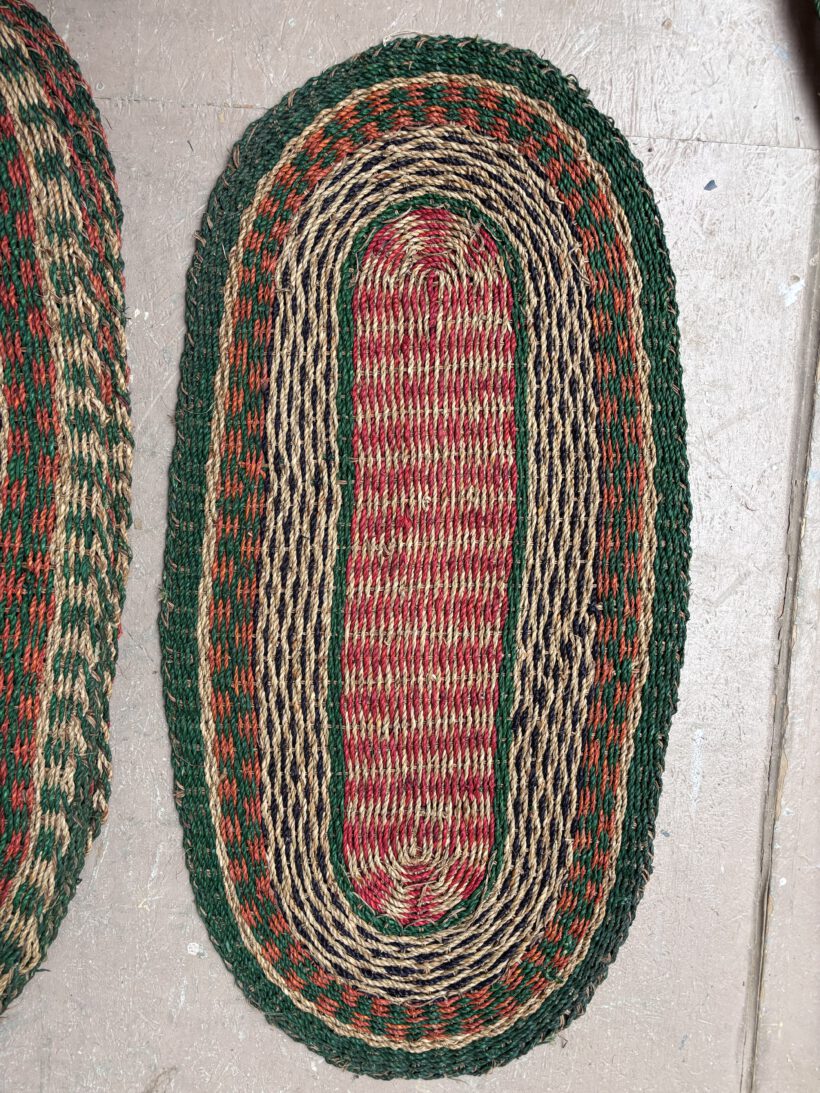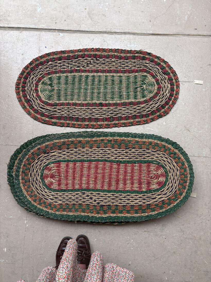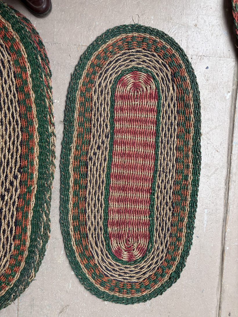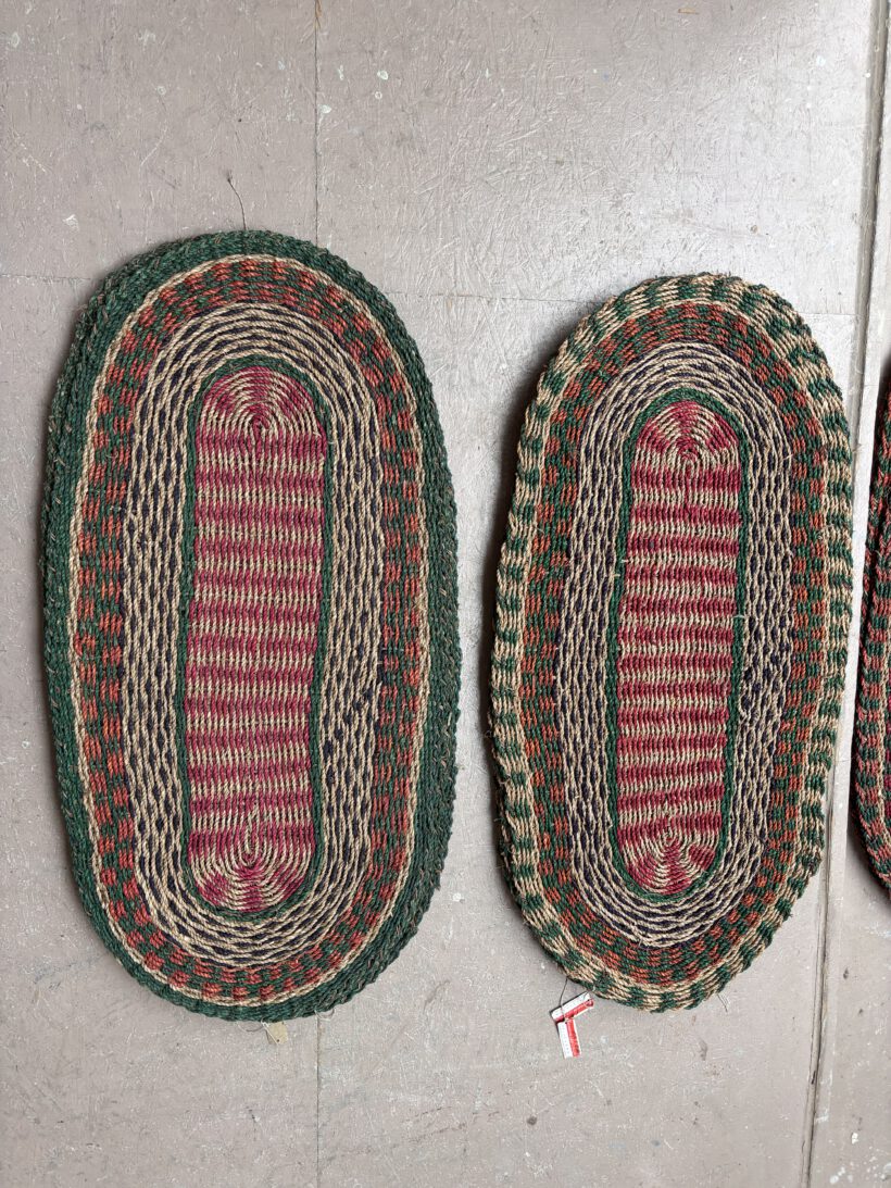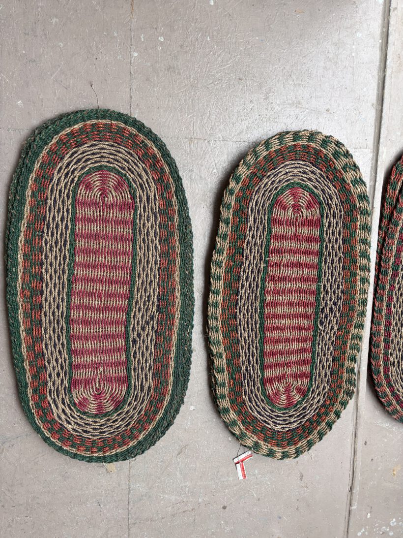 Wunderschöne vintage Rattanteppiche in tollen Farben. Es gibt drei verschiedene Varianten. Die Teppiche wurden nie benutzt. Teilweise sind noch die Etiketten vorhanden. Sie sind aus Rattan handgeflochten. Natürlich trotzdem alt. da Handmade gibt es leichte Variationen in der Flechtung.
