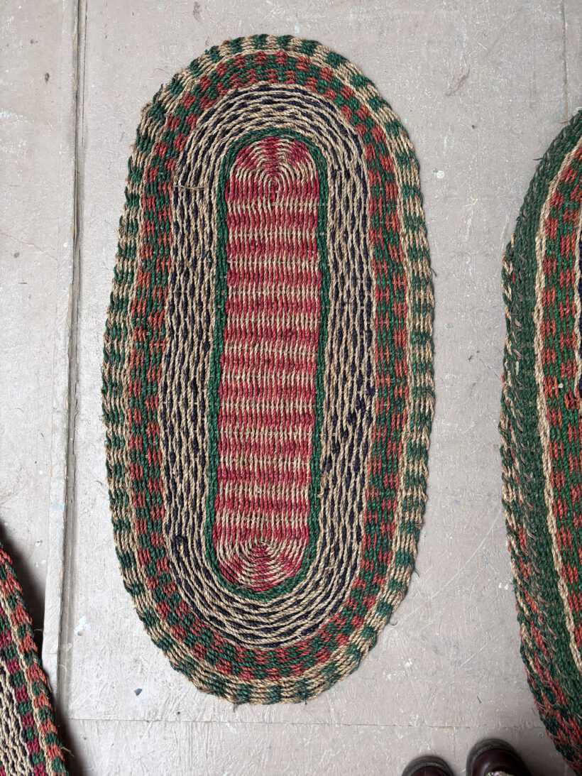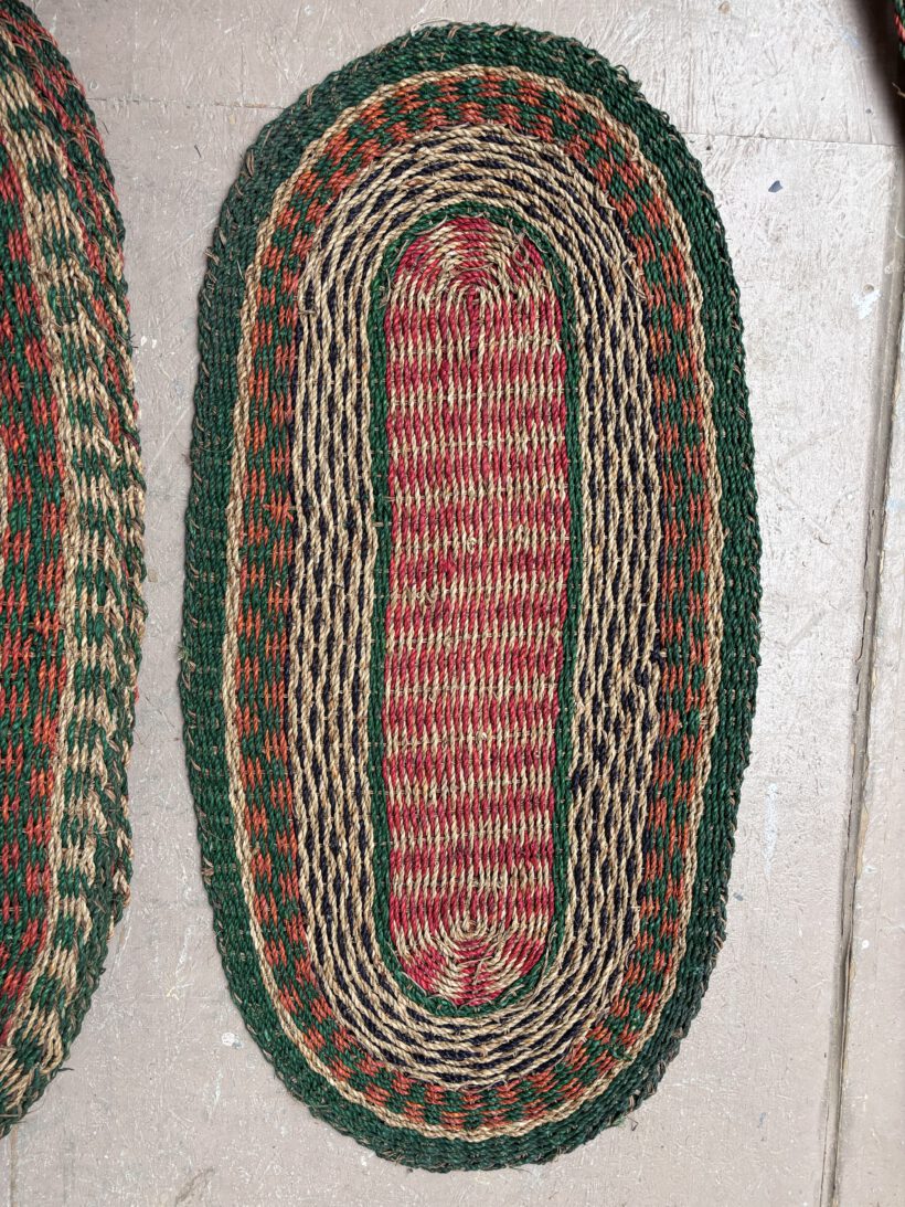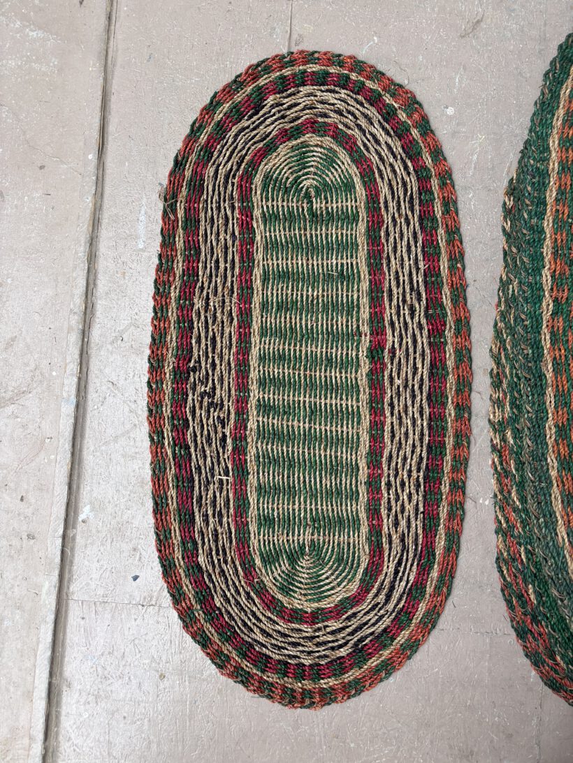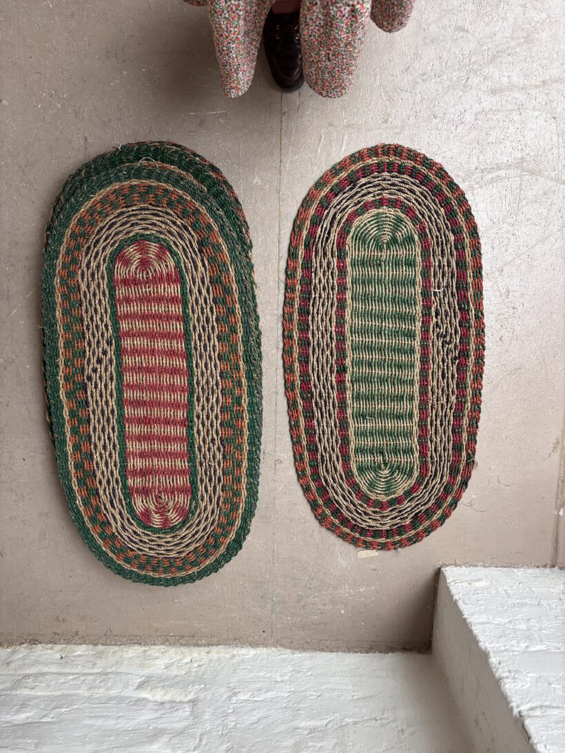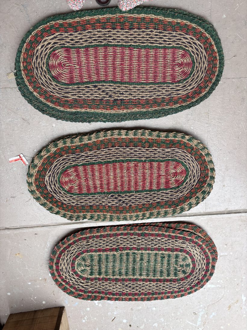 Wunderschöne vintage Rattanteppiche in tollen Farben. Es gibt drei verschiedene Varianten. Die Teppiche wurden nie benutzt. Teilweise sind noch die Etiketten vorhanden. Sie sind aus Rattan handgeflochten. Natürlich trotzdem alt. da Handmade gibt es leichte Variationen in der Flechtung.