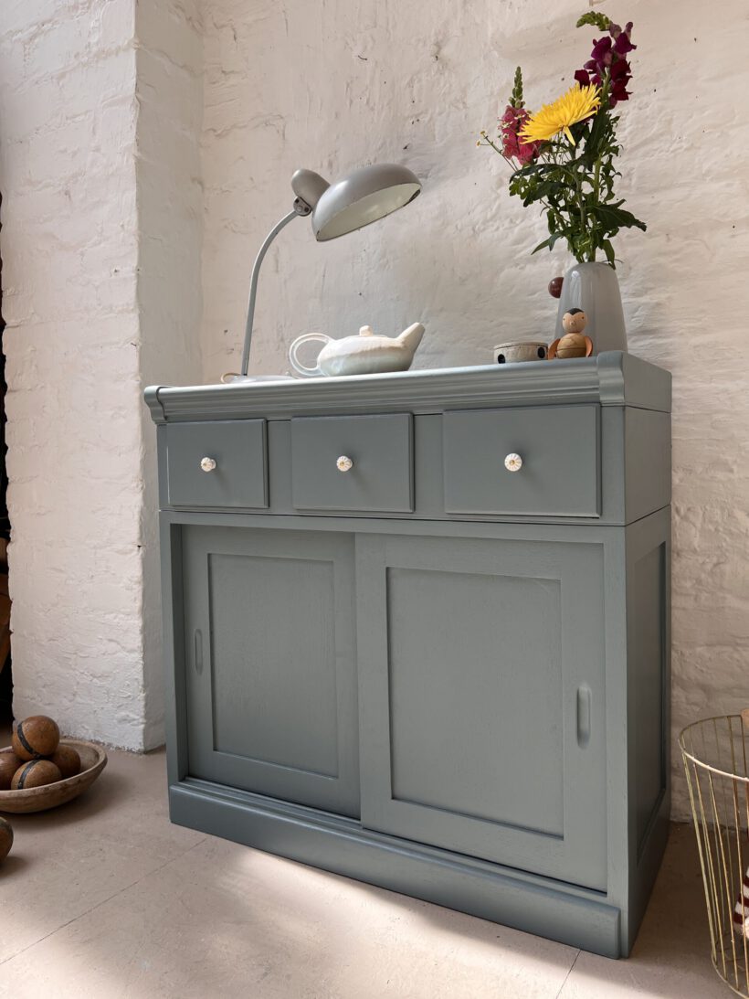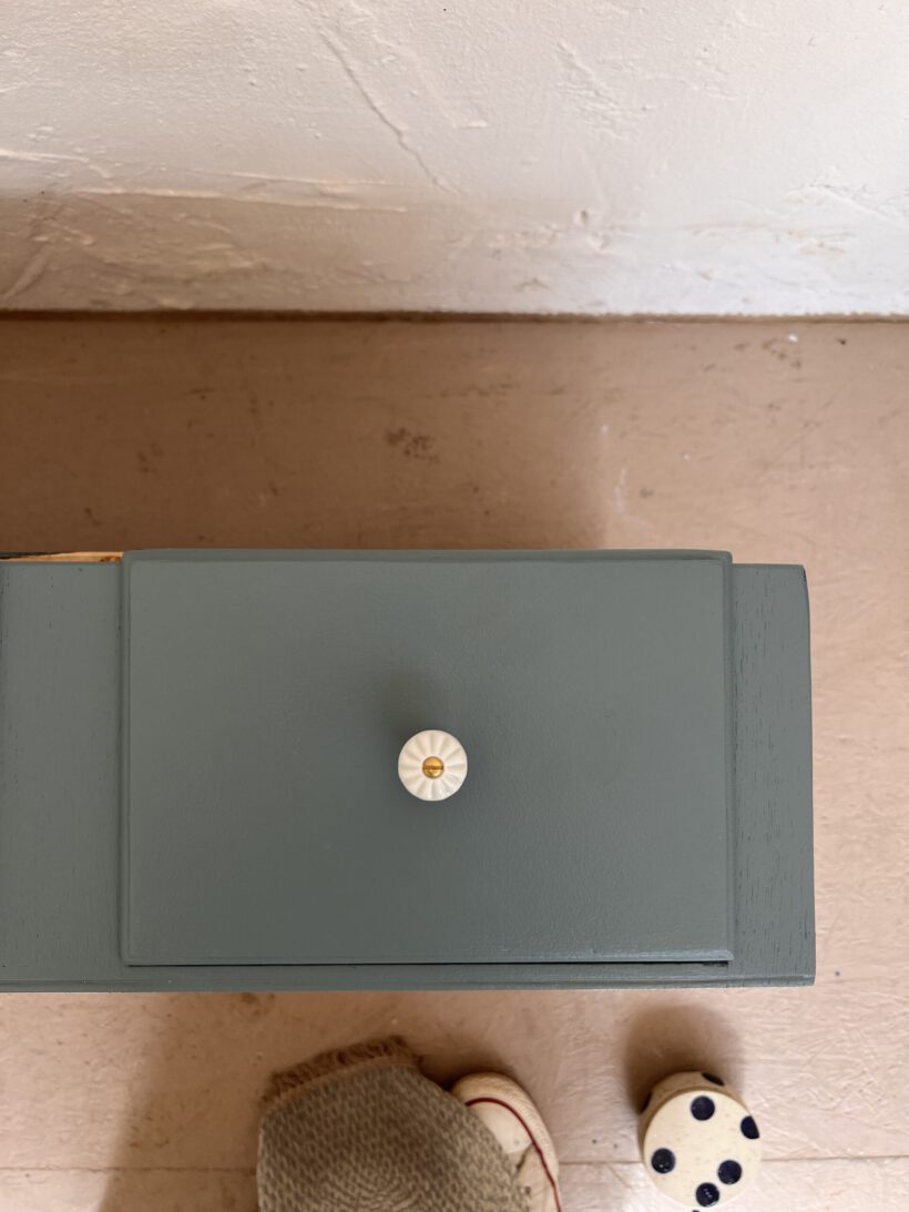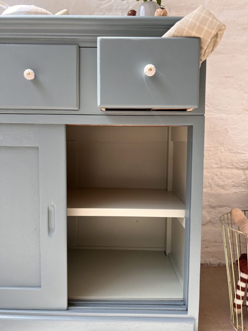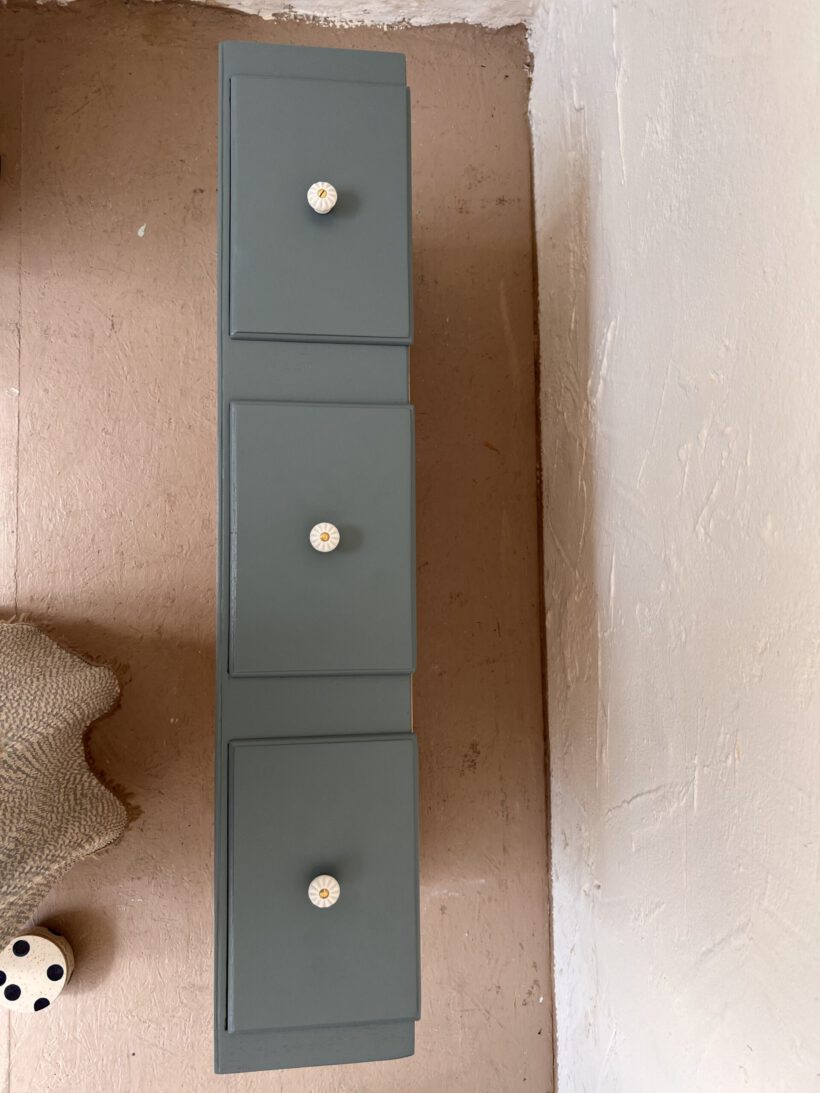 Théodore hat außen von uns einen wunderschönen dunklen Blauton der Farbfirma Farrow and Ball von bekommen. Und ihnen ein schönes Salbeigrün. Die Kommode sieht so auch offen stehend traumhaft aus. Einfach ein schönes und funktionales Möbel.