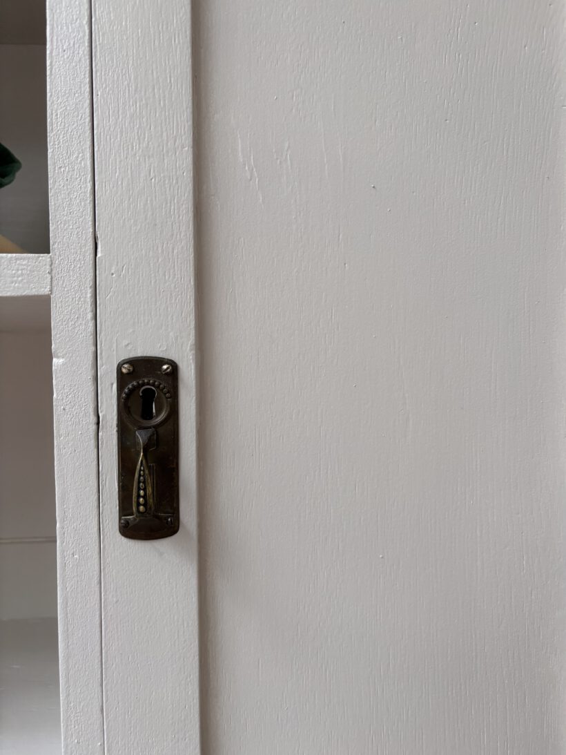 Wir haben Thorid in ein warmes weiß von Farrow and Ball getaucht. Er wurde innen und außen restauriert, geschliffen, grundiert und zwei Mal lackiert. Thorids Tür hat keinen Schlüssel. Sie schließt auch so wunderbar. Nur abschließen kann man sie nicht.