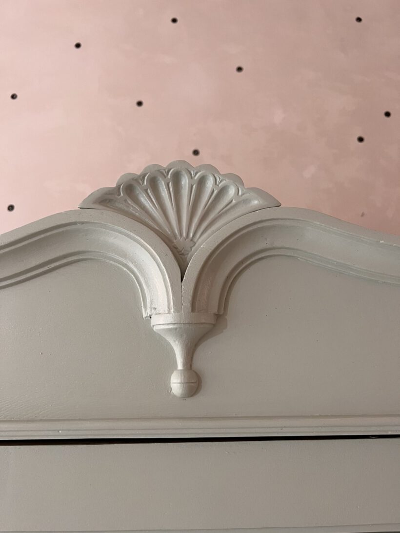 Tilly ist ein antiker Steckschrank, gute 100 Jahre alt und aus Eiche. Ihr ganzes Erscheinungsbild ist einfach nur besonders und so schön. Angefangen bei der kleinen Muschelverzierung oben auf der Krone, bis hin zu ihren Füßen ist einfach nur alles charmant. Die alten geschliffenen Spiegel sind noch erhalten, ebenso ein Schlüssel für das Schloss. Tilly wirkt trotz ihrer Grösse sehr zart und luftig. Dafür sorgen ihr zartes Design, die hohen Füße, sowie die schmale Tiefe.