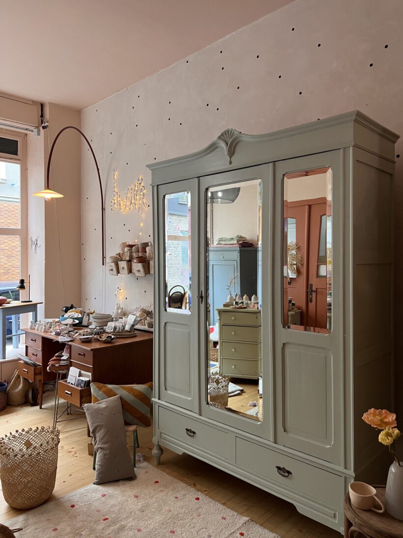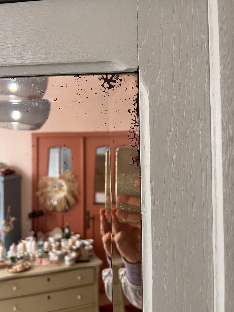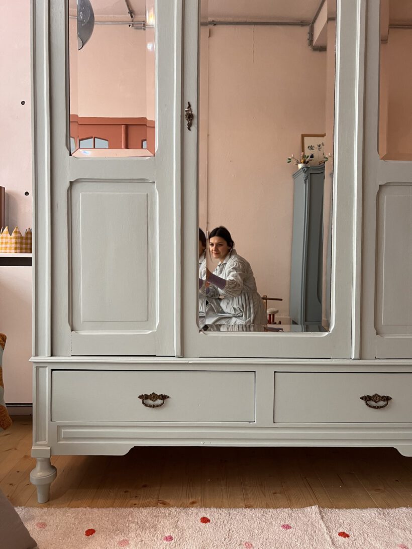 Die Spiegel haben Patina (siehe Fotos), man kann sich natürlich trotzdem wunderbar darin sehen. Wir haben Tilly außen eine neue Farbe geschenkt, sie ist restauriert, zwei mal grundiert und zwei mal lackiert in unserem Lieblingsmint von Farrow and Ball. Innen hat Tilly ihr weiß behalten, dass sie schon hatte. Das weiß hat Patina.