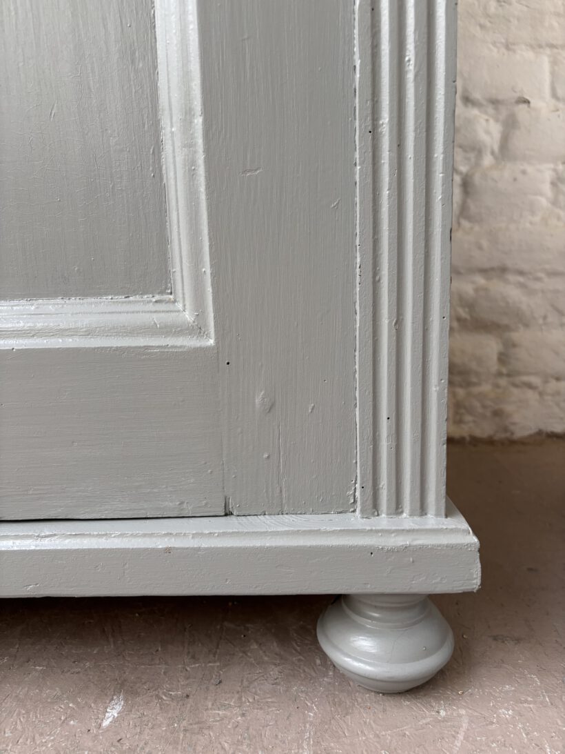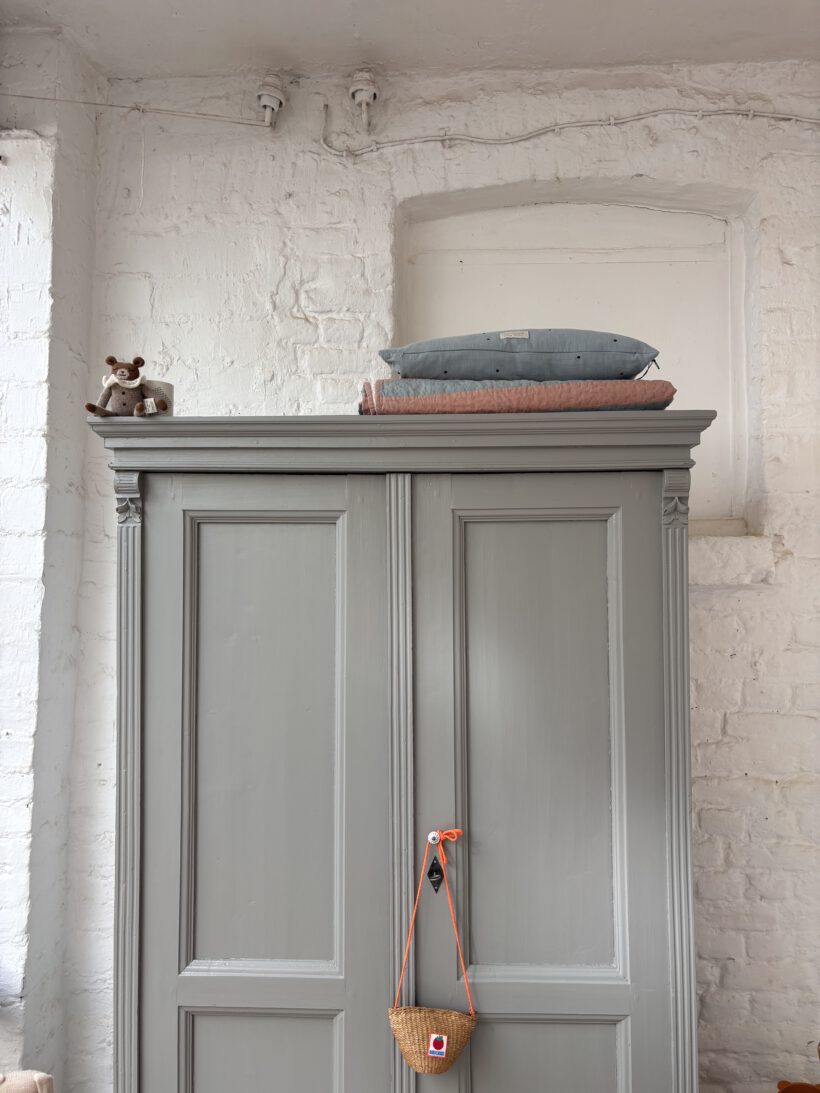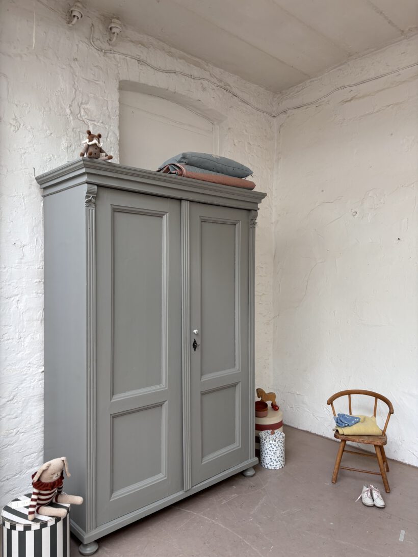 Toni wurde von einem Prager Restaurator aufbereitet mit wasserbasierter Farbe und Pinselstrich. Die färbe ist ein warmes grau. Toni´s Holz trägt Spuren der Zeit. Es hat eine wunderschöne Patina (siehe Bilder).
