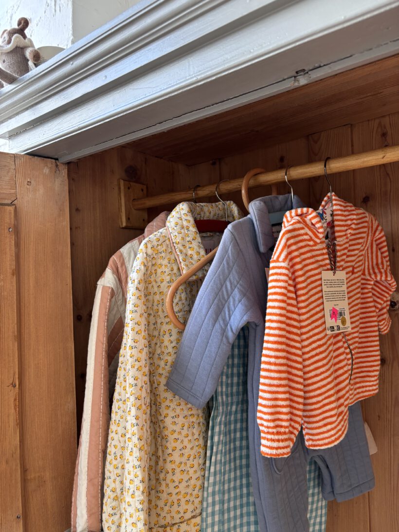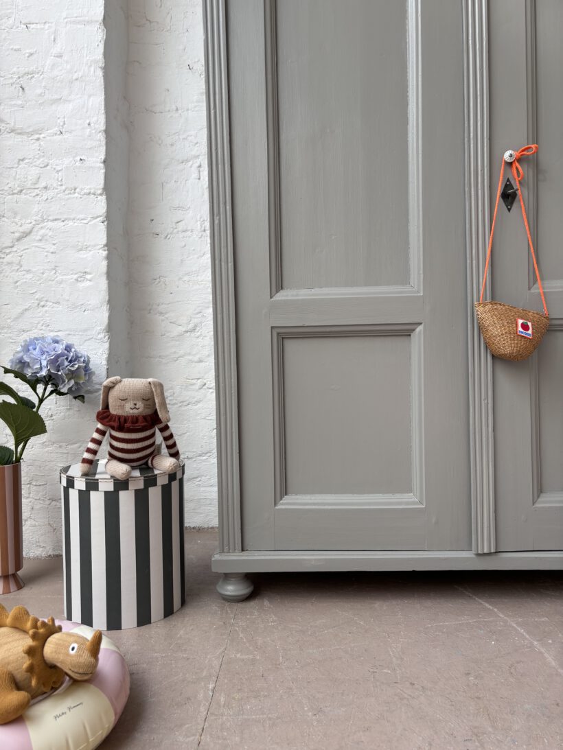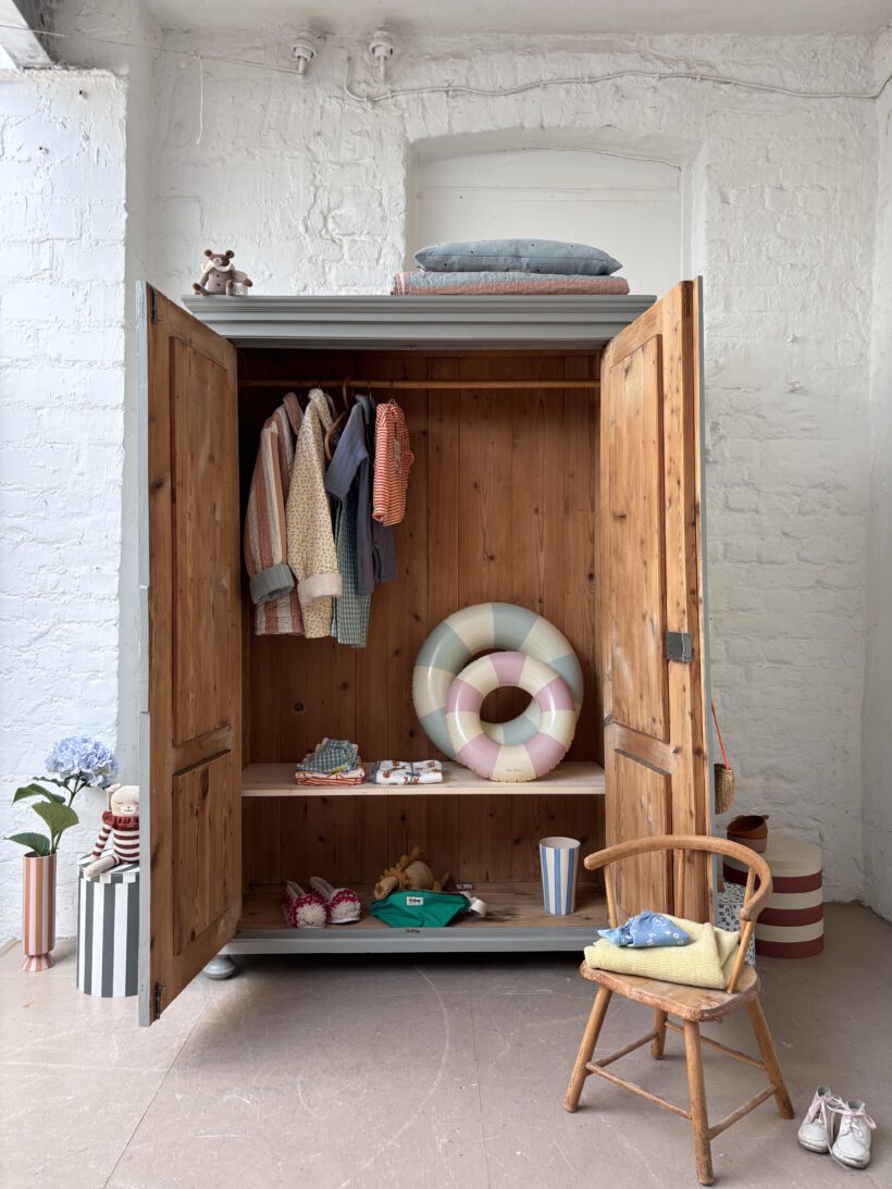 Toni ist einfach und doch besonders gehalten. Er hat grafische Verzierungen: Linienhafte Vertiefungen an den Seiten und zwei kleine Blumeverzierungen an den Oberkanten. Dass macht ihn zu einem zeitlosen wunderschönen Hingucker für jede Gelegenheit. Innen hat er eine Kleiderstange, darüber einen Boden und unten noch einen Boden. Den Stauraum kann man dadurch optimal nutzen. Er hat noch seinen original Schlüssel und schließt einwandfrei.
