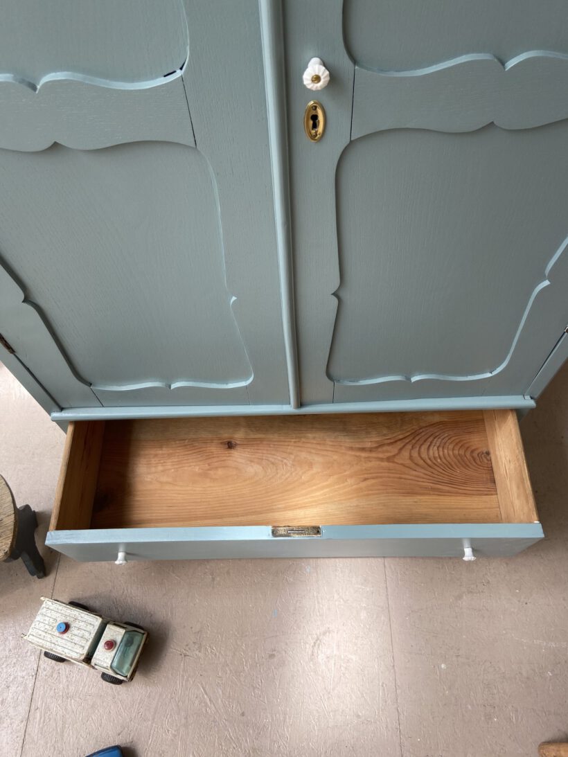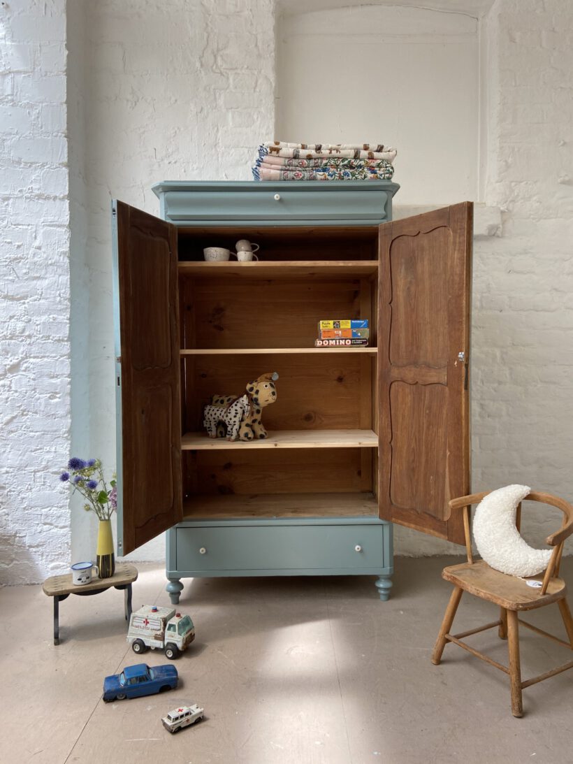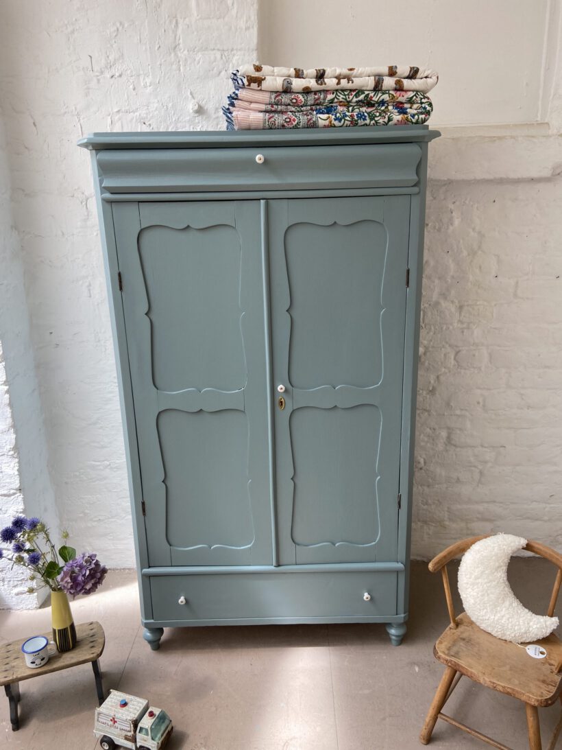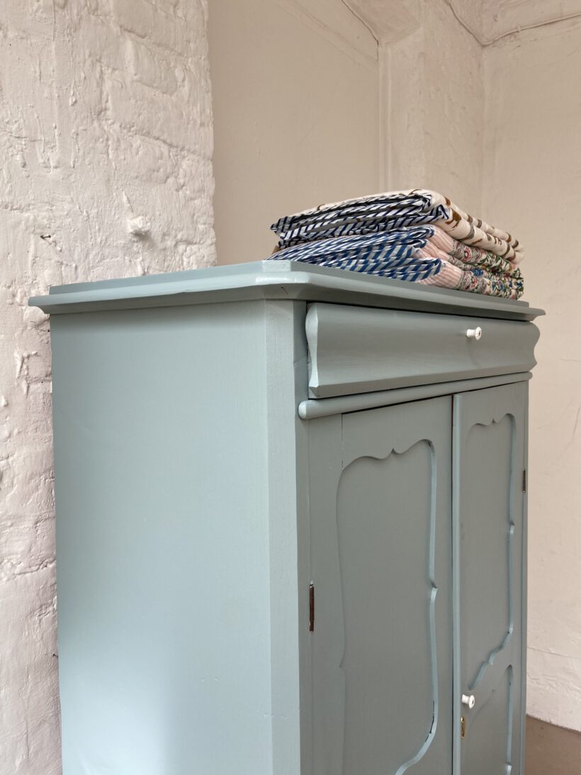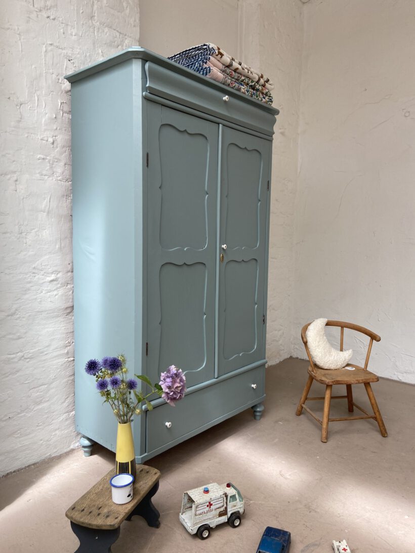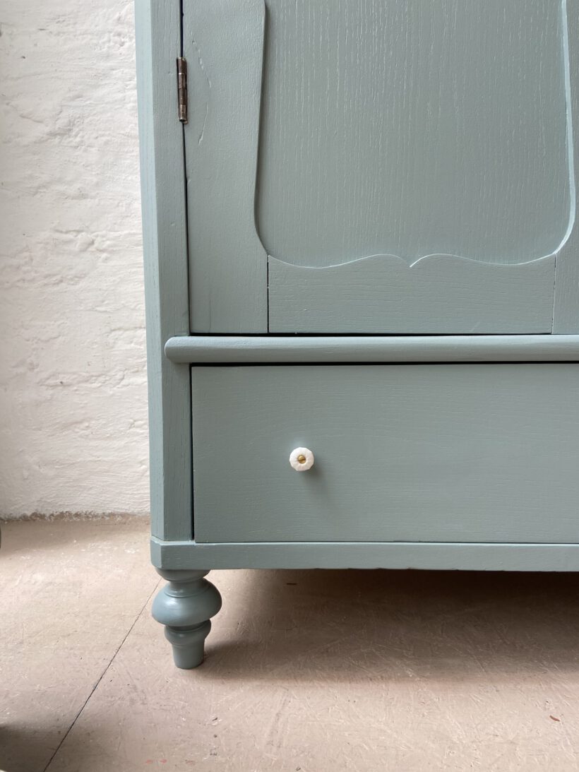 Tore ist ein schwedischer Traumkleiderschrank vom Feinsten. Er stammt aus Smaland und ist gute 100 Jahre alt. So vieles an seinem Look ist besonders: Er hat zum Beispiel zwei Türen bei einer Breite von gerade mal 96 cm. Er hat zwei charmante Schubladen, eine oberhalb der Türen, was sehr ungewöhnlich ist. Die Türen zieren geschwungene Holzelemente und hinter ihnen verbergen sich 3 Einlegeböden. Auch Tores Füße sind entzückend. Hah, ihr seht, wir schwärmen ohne Ende 🙂