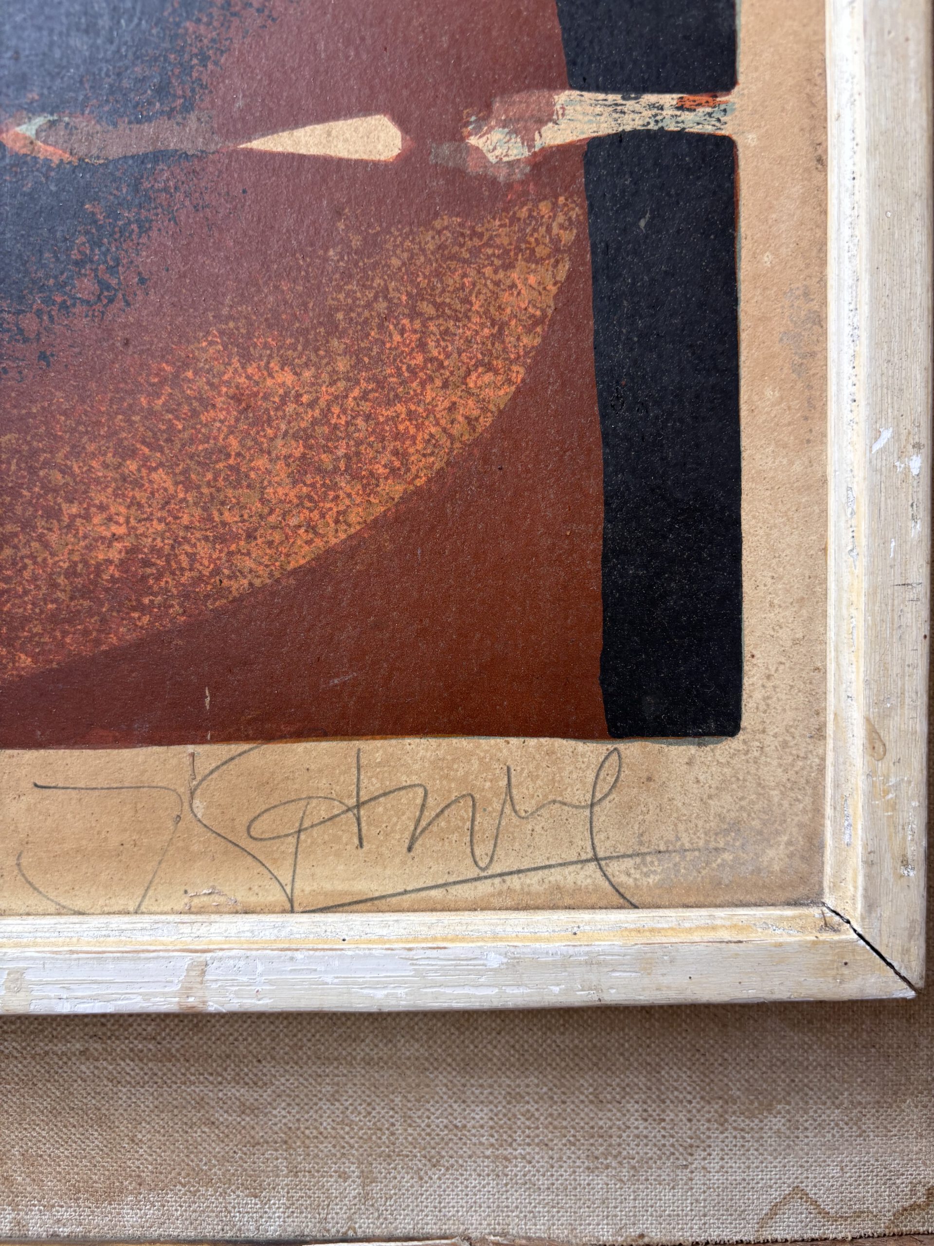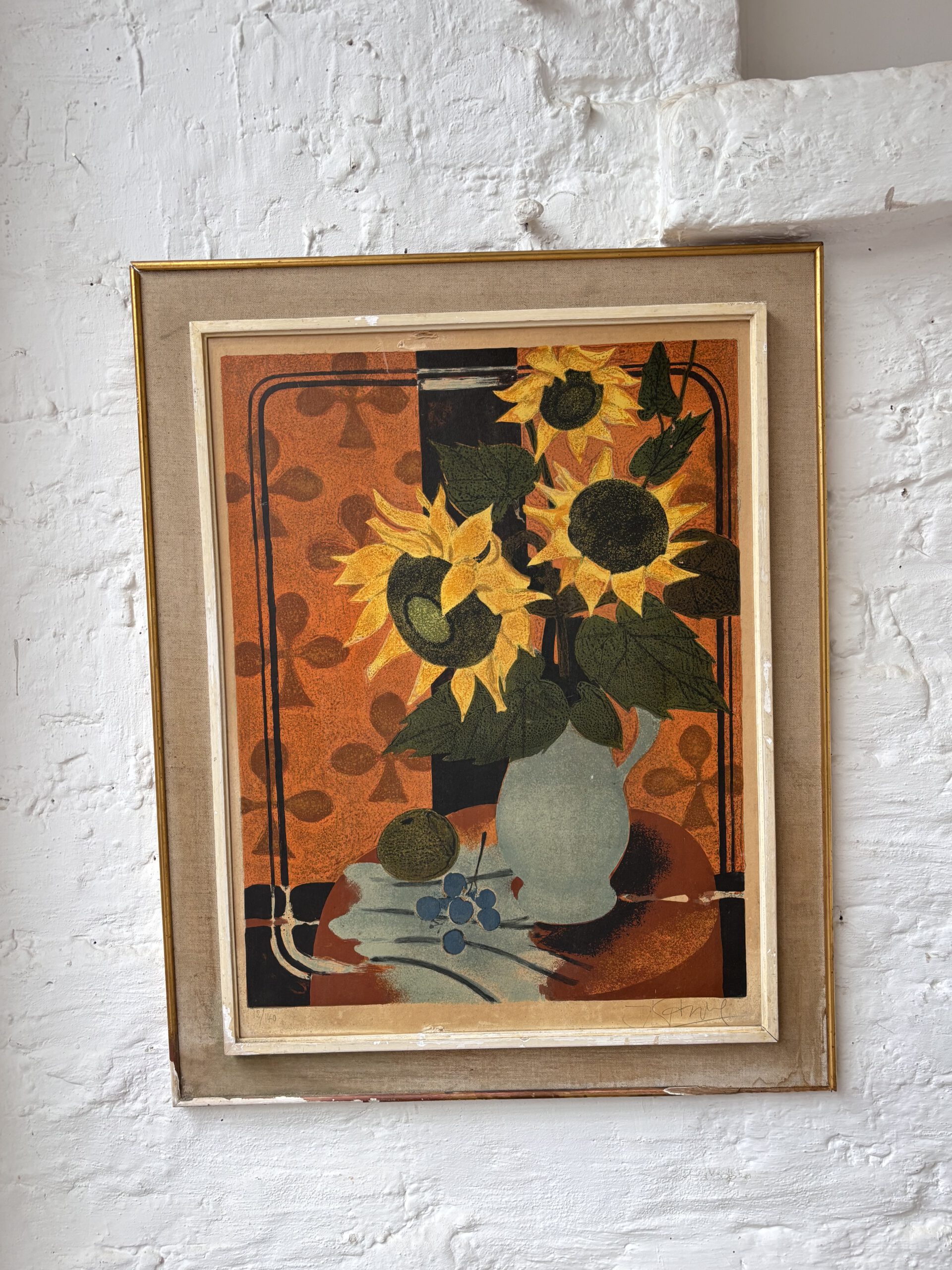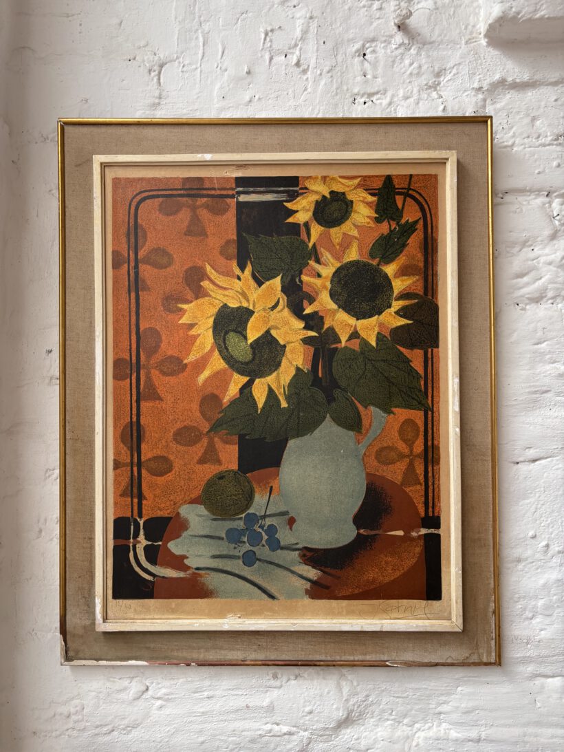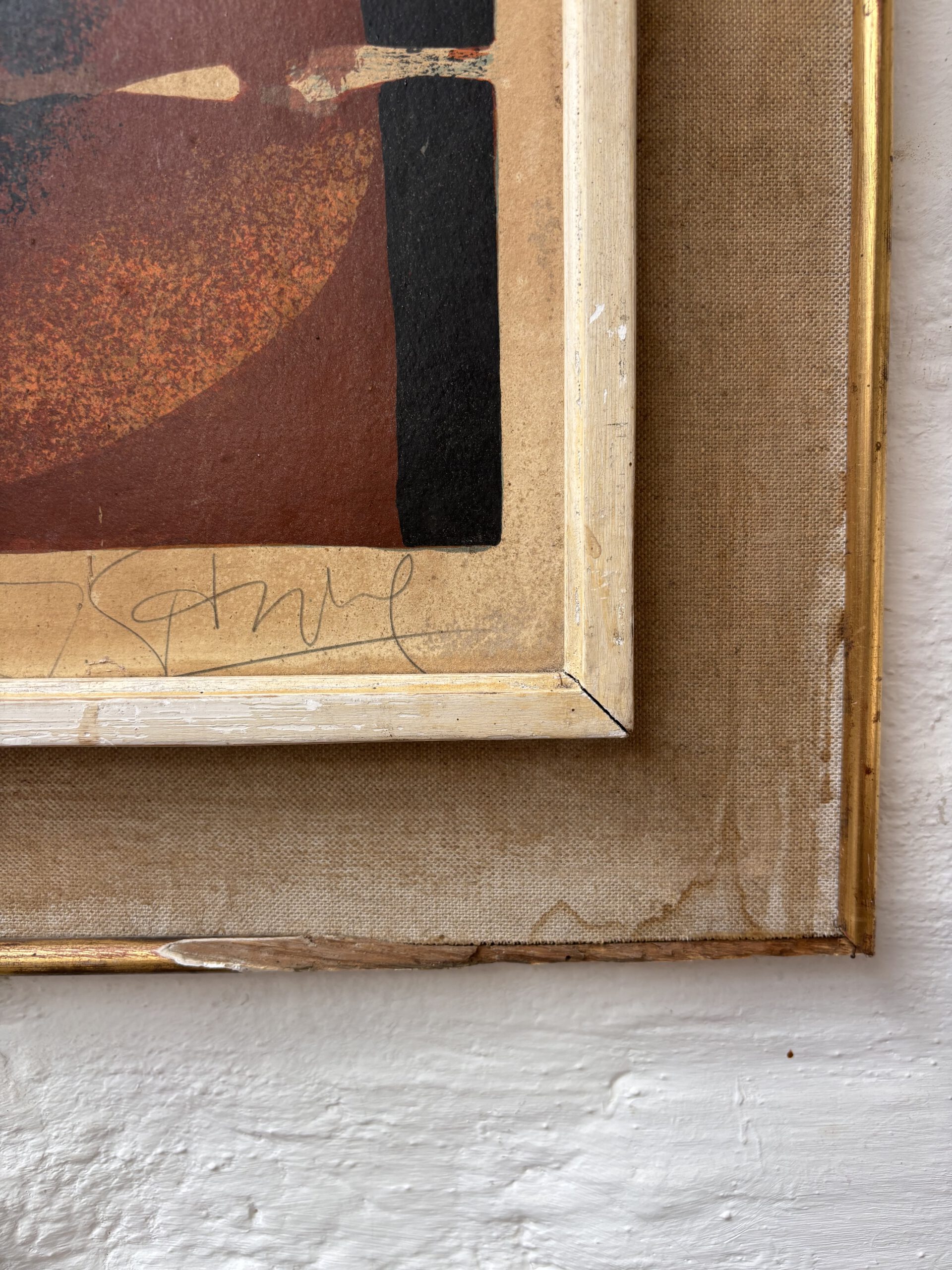 Die Farben überzeugen von der ersten Sekunde an – man sieht es und liebt es! Das Gemälde ist antik, dies erkennt man an dem antiken Rahmen und dem Stoff Pass Partout erkennen. Es trägt viele Spuren der Zeit. Der Rahmen hat im unteren Bereich schwer gelitten und auch der Stoffbezug hat Patina. Nichtsdestotrotz oder vielleicht genau deswegen hat es so viel Charme und strahlt in jedem Raum. Auch der Druck hat an kleineren Stellen leichte Spuren der Zeit.
