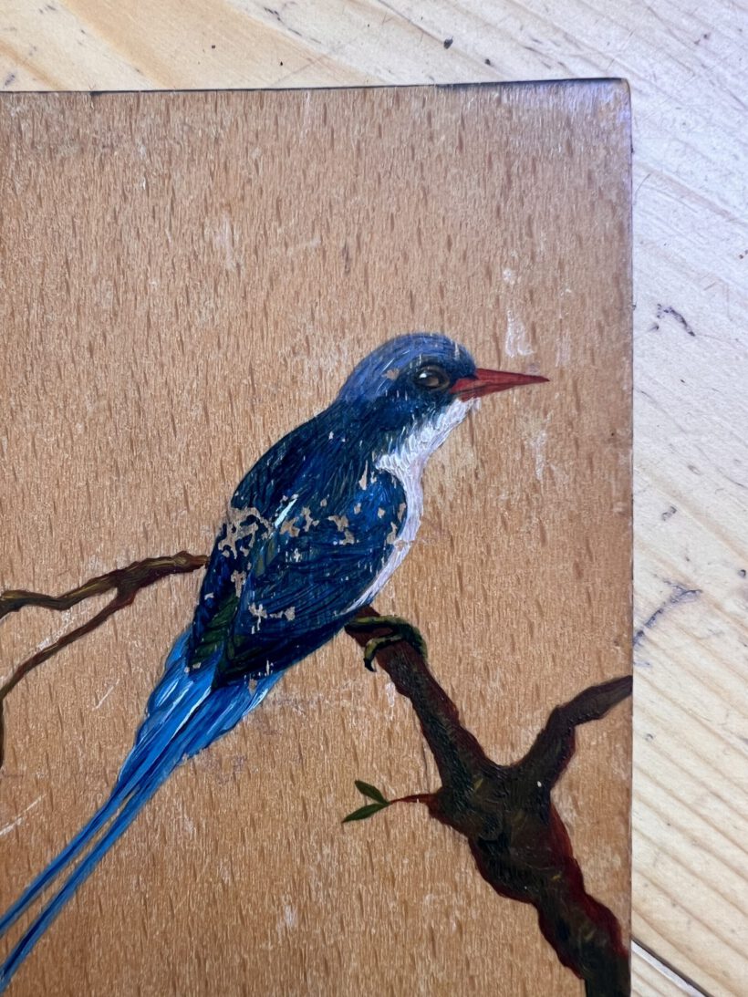 Wunderschöner antike Vogelmalerei auf Holz aus Frankreich.