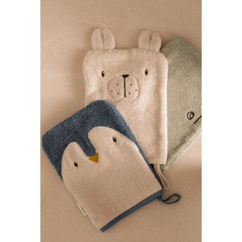 Diese Waschlappen aus Baumwoll-Frotee haben aufgestickte Tiergesichter und sind perfekt zum spielerischen Baden.