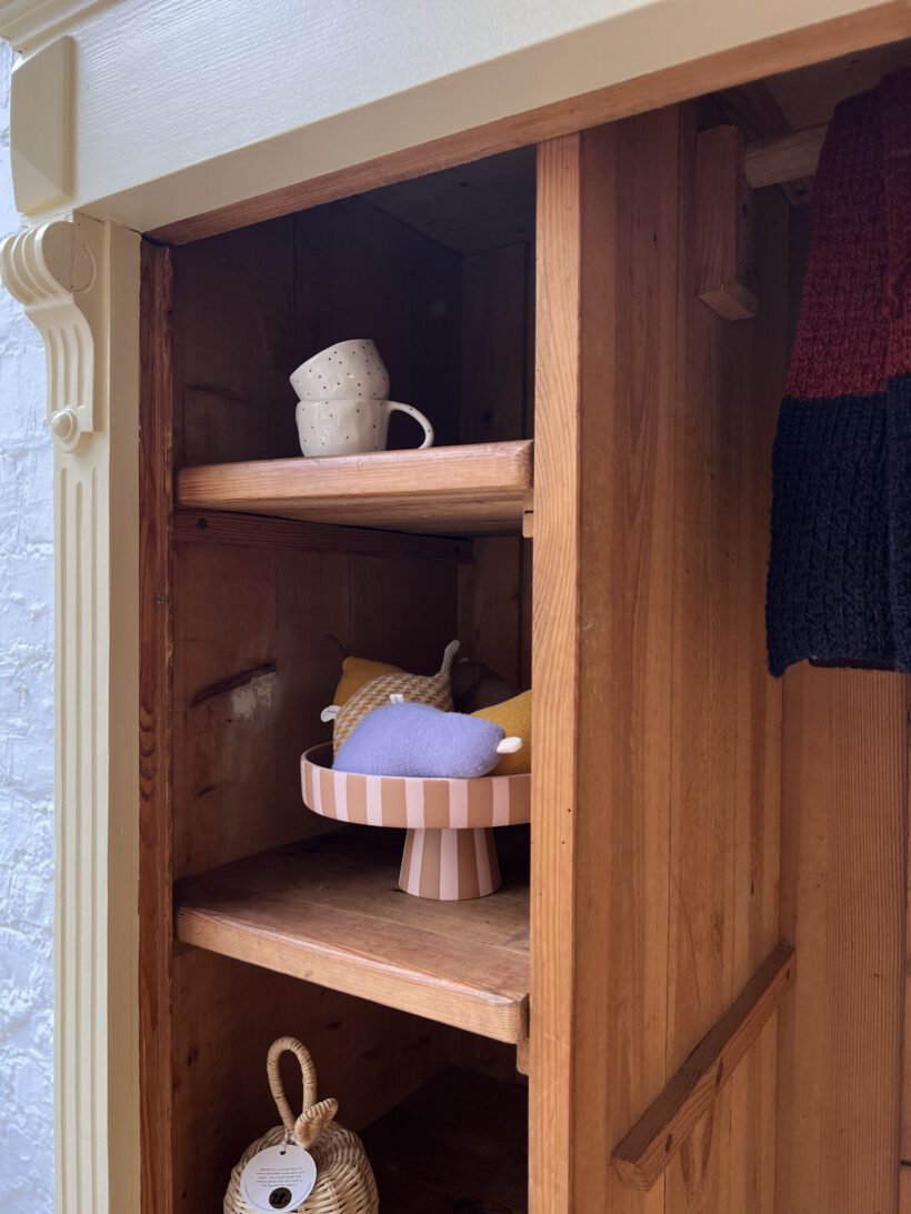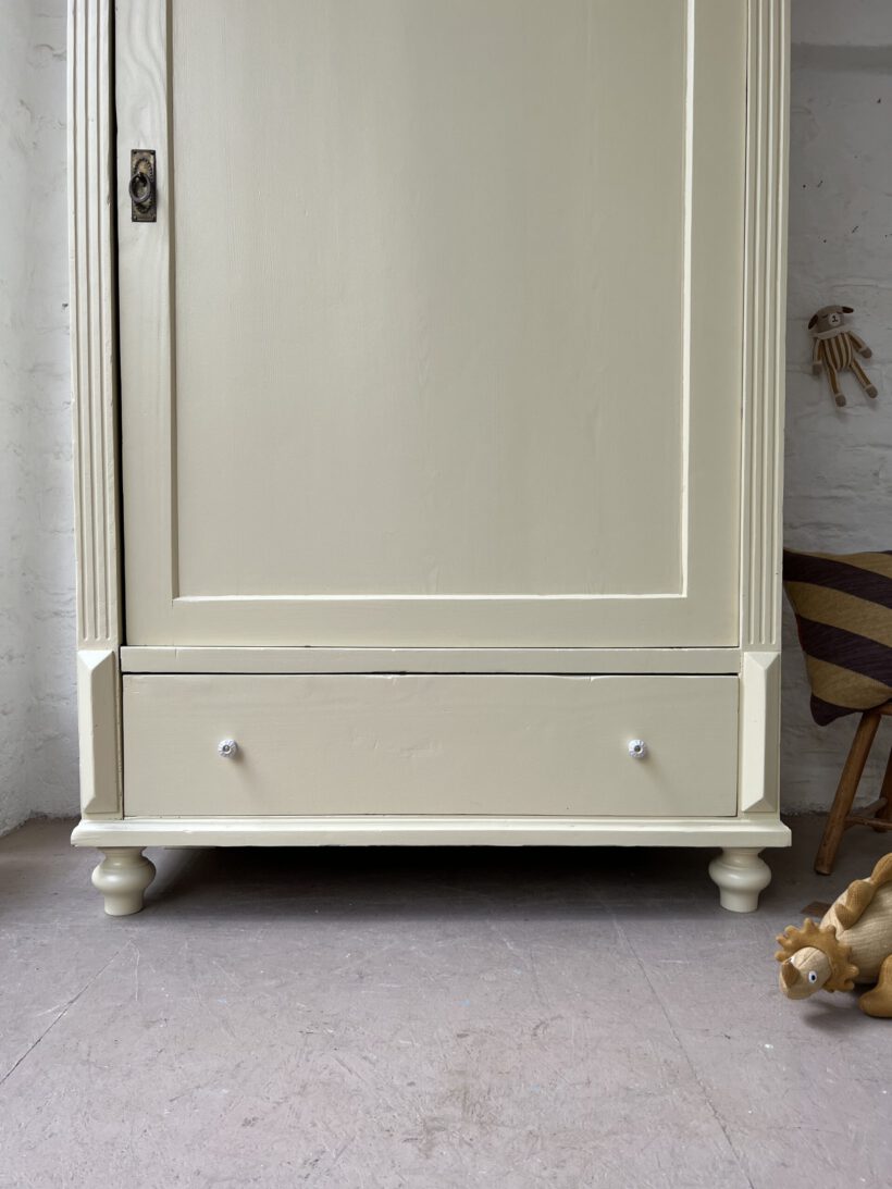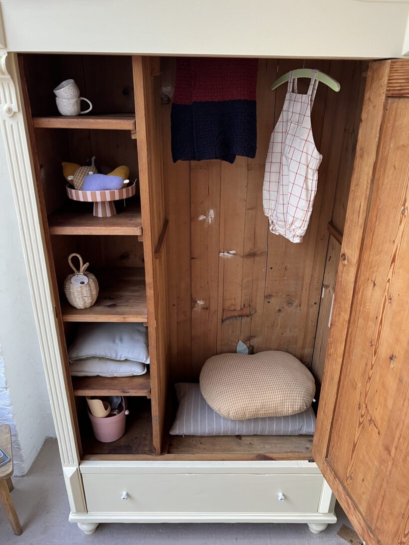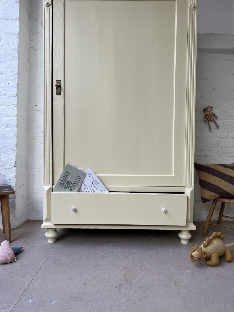 Wir haben Willi restauriert, einige große Löcher im Holz geflickt (das Geflickte kann man von innen noch gut sehen/von außen nicht), neue Füße angebracht und und und…Dann wurde er geschliffen, grundiert und zwei Mal lackiert in unserm Lieblingsgelb von Farrow and Ball. Willi hat ein ziemlich schönes Innenleben mit einer zweifachen Aufteilung, was sehr ungewöhnlich ist für einen Eintürer. Er hat kein Schloss mehr. Die Tür schließt aber auch ohne gut und steht zu. An der rechten Seite sind über die Jahre zwei Holzrisse entstanden die wir hätten kitten können, aber sie wären durch Bewegung und Co immer wieder aufgegangen, deswegen haben wir uns dagegen entschieden. Es ist eine charmante Altersspur;-)
