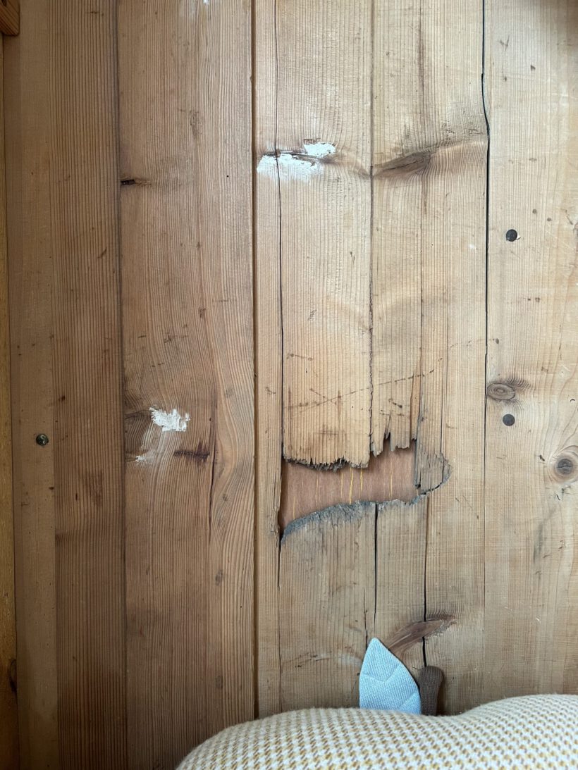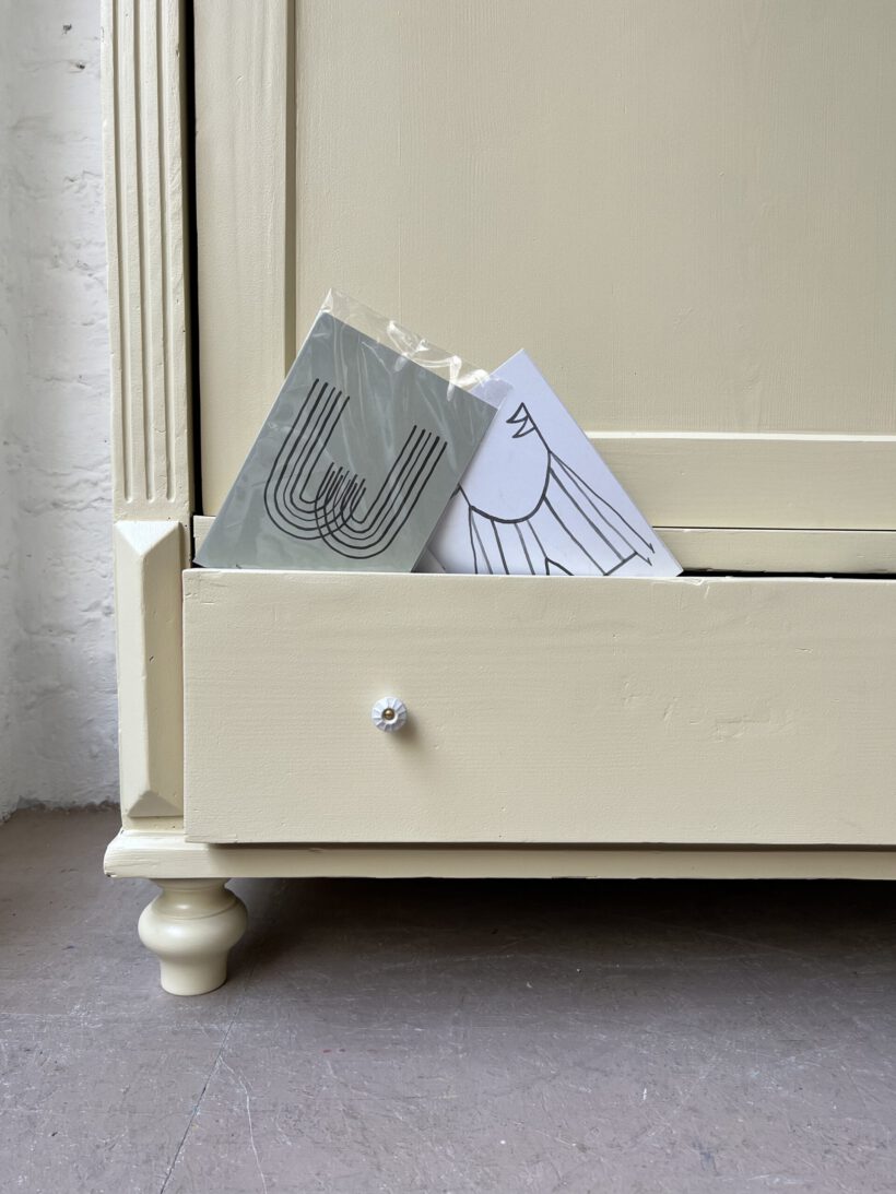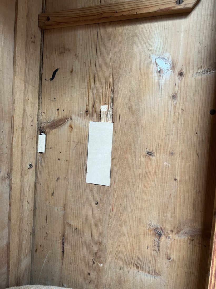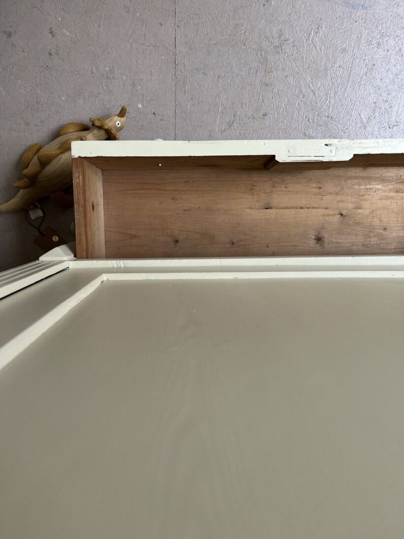 Wir haben Willi restauriert, einige große Löcher im Holz geflickt (das Geflickte kann man von innen noch gut sehen/von außen nicht), neue Füße angebracht und und und…Dann wurde er geschliffen, grundiert und zwei Mal lackiert in unserm Lieblingsgelb von Farrow and Ball. Willi hat ein ziemlich schönes Innenleben mit einer zweifachen Aufteilung, was sehr ungewöhnlich ist für einen Eintürer. Er hat kein Schloss mehr. Die Tür schließt aber auch ohne gut und steht zu. An der rechten Seite sind über die Jahre zwei Holzrisse entstanden die wir hätten kitten können, aber sie wären durch Bewegung und Co immer wieder aufgegangen, deswegen haben wir uns dagegen entschieden. Es ist eine charmante Altersspur;-)