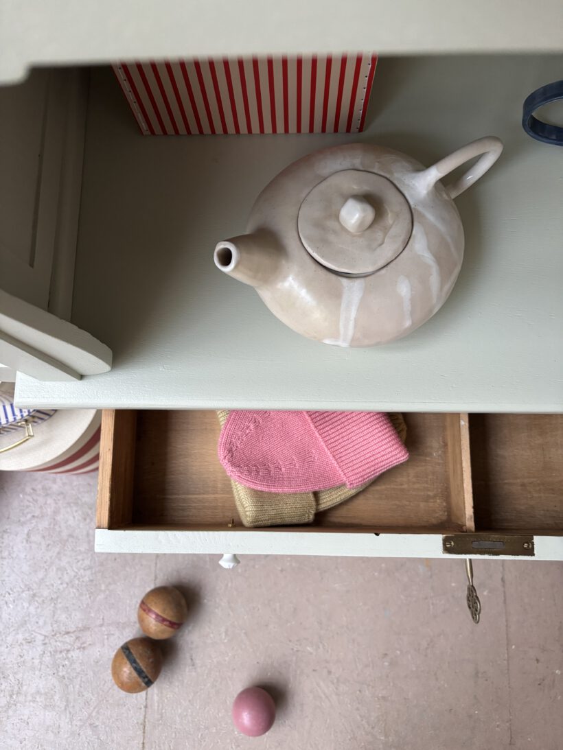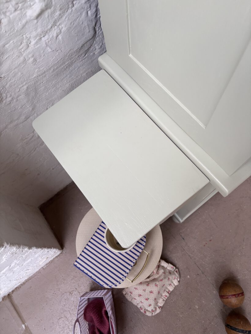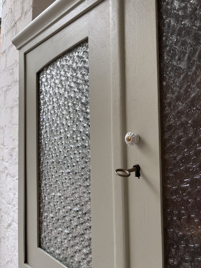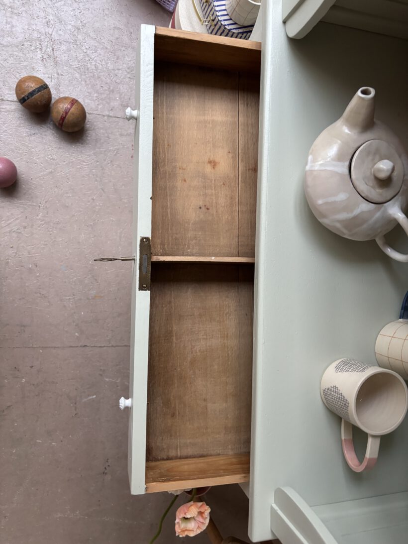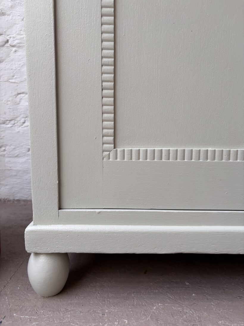 Weil sie ein absolutes Einzelstück ist – es gibt keine zweite Wilma dieser Art. Ihre Maße sind sehr süß, der Kommodenteil proportional kleiner als der Buffetteil, was sehr sweet aussieht. Dann hat sie zauberhafte Fenster mit kleinen Pusteblumen-artigen Mustern und so schmale Maße, denn sie ist gerade mal 37,5 cm tief und nur 76 cm breit. Die Maße machen sie zu einem Allrounder Talent, denn sie passt nahezu in jeden noch so kleinen Raum. Ihr wisst, wie sehr wir das lieben. Gerade heutzutage wo Wohnraum knapp ist, braucht es schmale Möbel mit Charakter. Besonders süß sind auch Wilma´s Verzierungen und Kugelfüße, sowie, das kleine Tischlein seitlich, dass man aufklappen kann. Rundum ein Lieblingsmöbel!