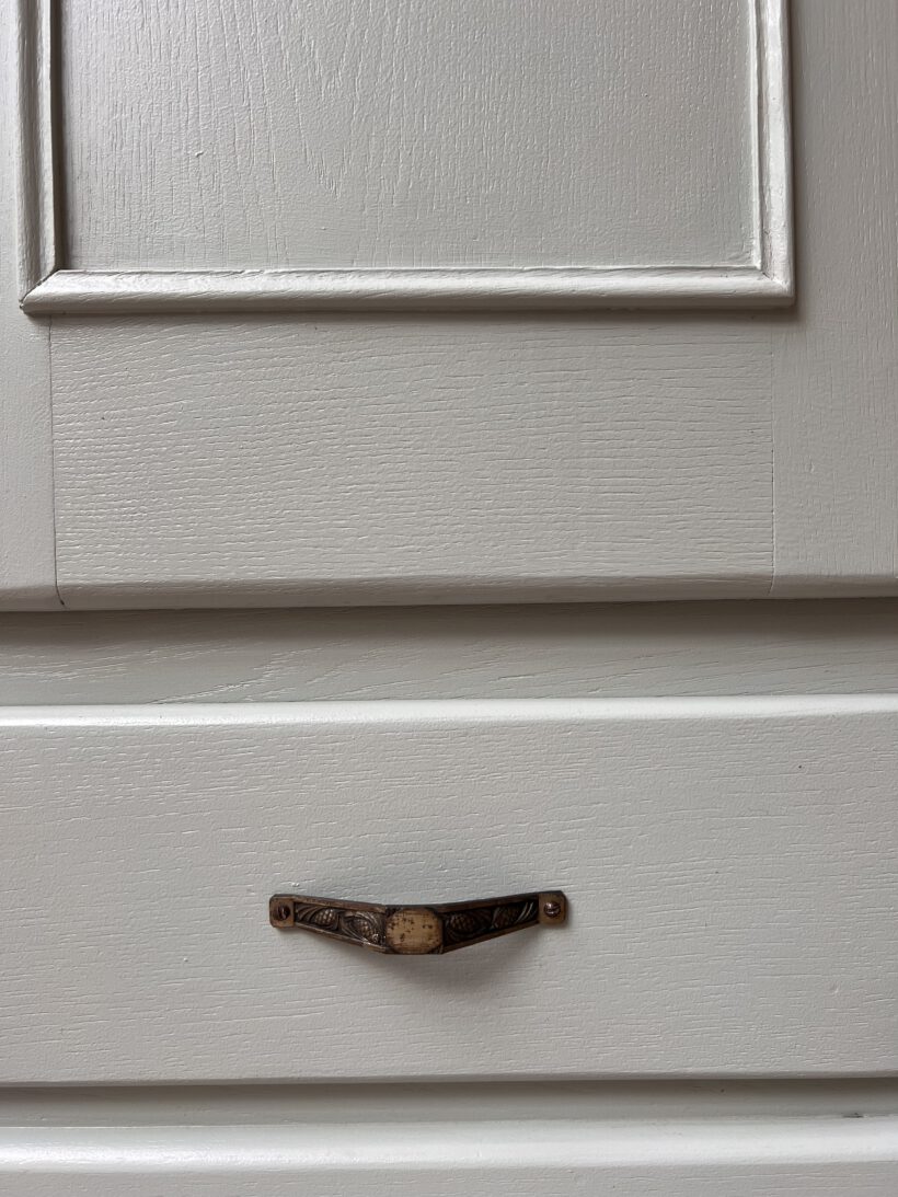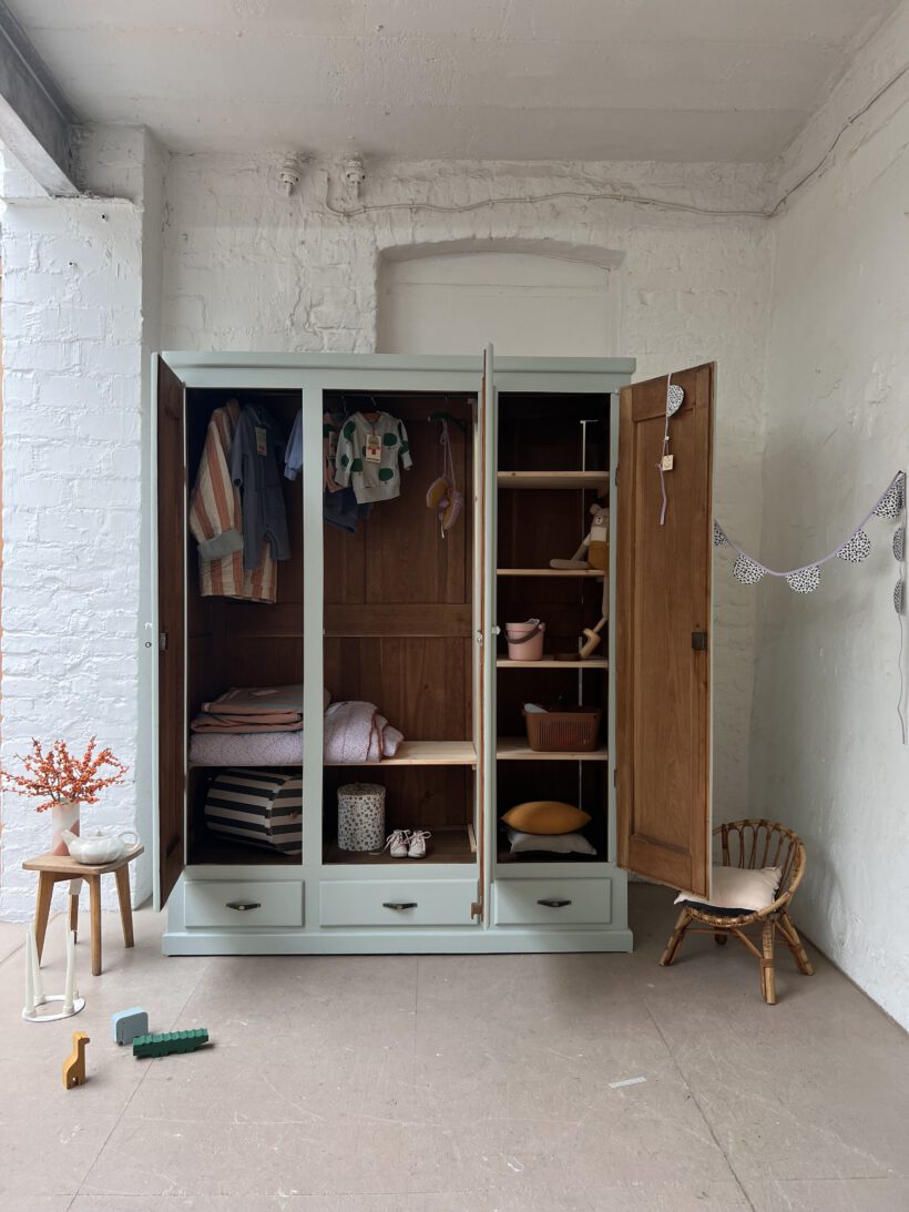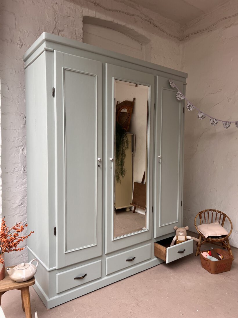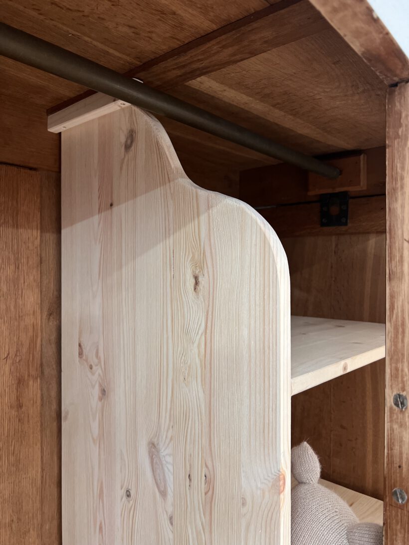 Zabel ist ein antiker großer Steckschrank aus Eiche, der mit solch einer Eleganz und Unsterblichkeit so so viele Sachen verstauen kann. Er ist schlicht, zeitlos und mega praktisch. Das alte Eichenholz ist robust und quasi unkaputtbar. Und da er ein Steckschrank ist, lässt er sich einfach auf- und abbauen. Und dadurch bequem in jedes noch so kleine Dachgeschoss Zimmer tragen. Zabel ist ein Schrank fürs Leben und deshalb hat er von uns auch ein schönes neues Innenleben bekommen., damit all sein Raum für jeden gut nutzbar ist. Rechts hinter der dritten Türe haben wir vier Regalböden eingebaut, eine Trennwand links und davon abgehend verläuft die original Kleiderstange und ein Regalboden. Die rechte und linke Türe haben einen Schlüssel, die mittlere leider keinen mehr, dafür einen Kugelschnapper von uns, womit sie gut schließen kann. Unten hat Zabel drei Schubladen. Ein Träumchen.