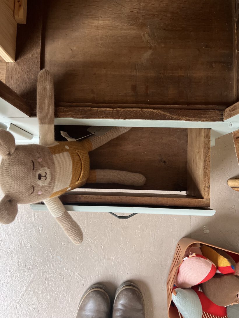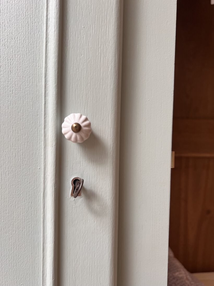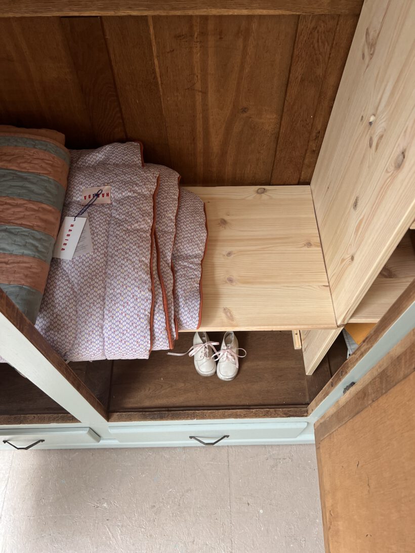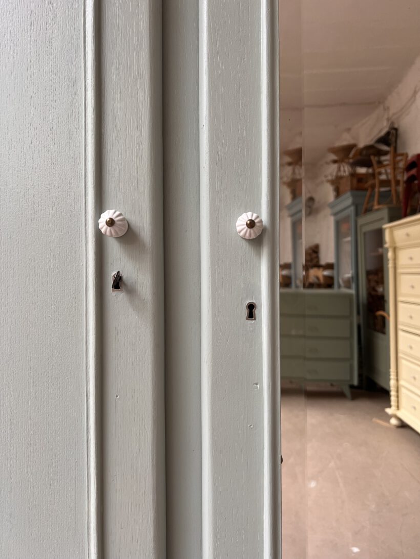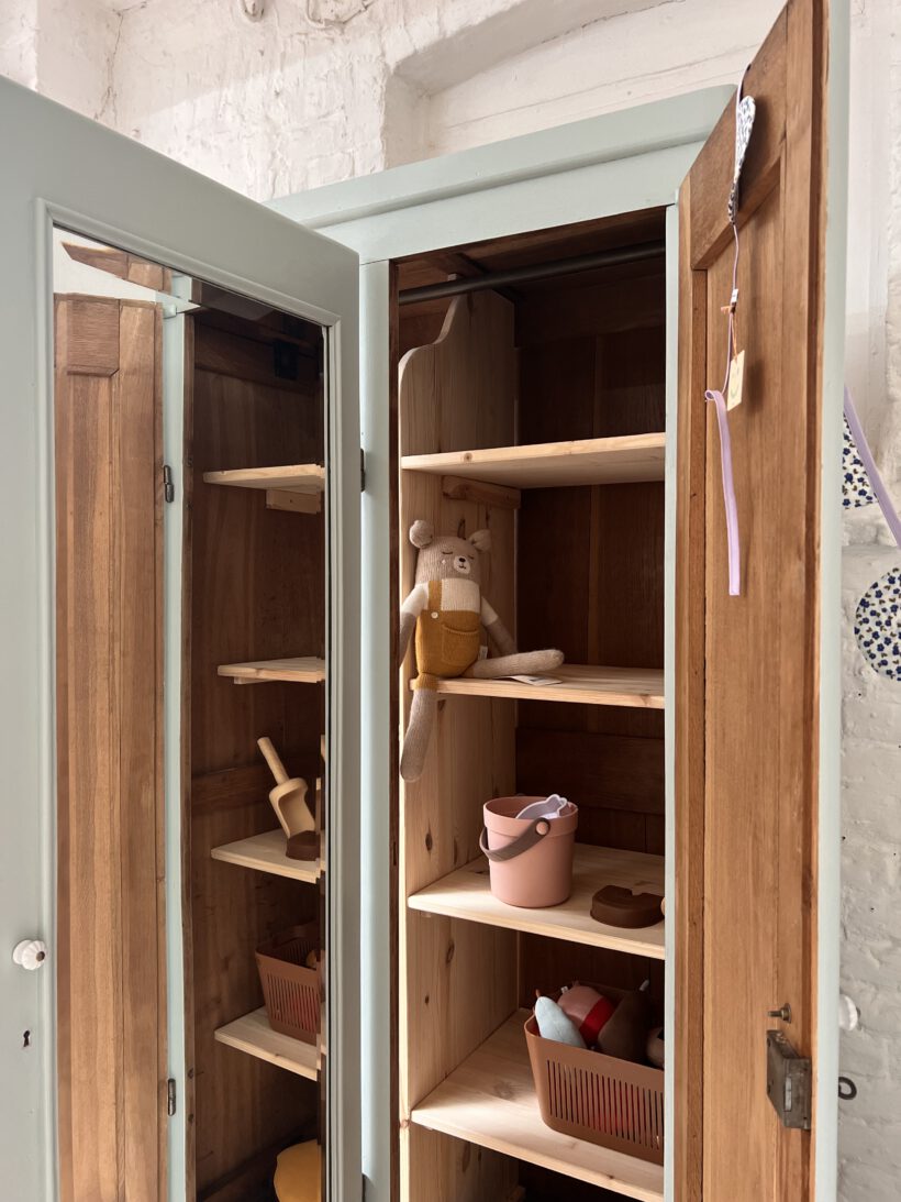 Zabel ist ein antiker großer Steckschrank aus Eiche, der mit solch einer Eleganz und Unsterblichkeit so so viele Sachen verstauen kann. Er ist schlicht, zeitlos und mega praktisch. Das alte Eichenholz ist robust und quasi unkaputtbar. Und da er ein Steckschrank ist, lässt er sich einfach auf- und abbauen. Und dadurch bequem in jedes noch so kleine Dachgeschoss Zimmer tragen. Zabel ist ein Schrank fürs Leben und deshalb hat er von uns auch ein schönes neues Innenleben bekommen., damit all sein Raum für jeden gut nutzbar ist. Rechts hinter der dritten Türe haben wir vier Regalböden eingebaut, eine Trennwand links und davon abgehend verläuft die original Kleiderstange und ein Regalboden. Die rechte und linke Türe haben einen Schlüssel, die mittlere leider keinen mehr, dafür einen Kugelschnapper von uns, womit sie gut schließen kann. Unten hat Zabel drei Schubladen. Ein Träumchen.