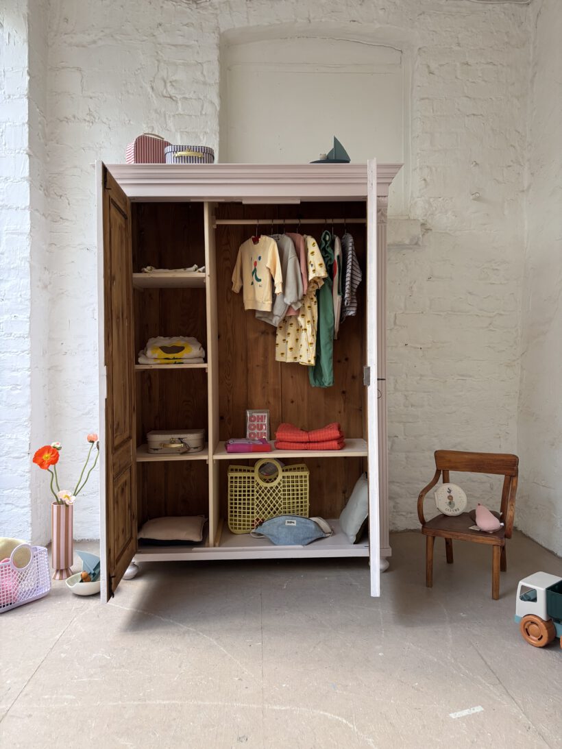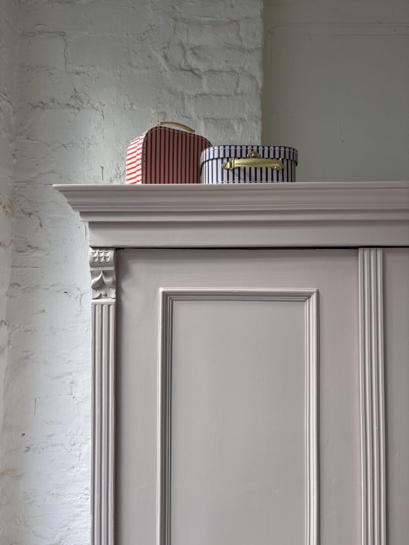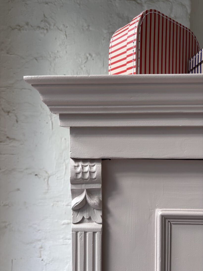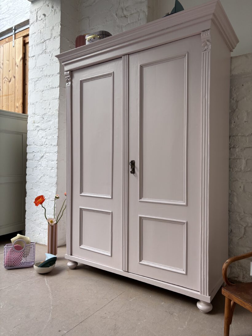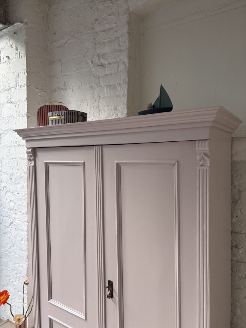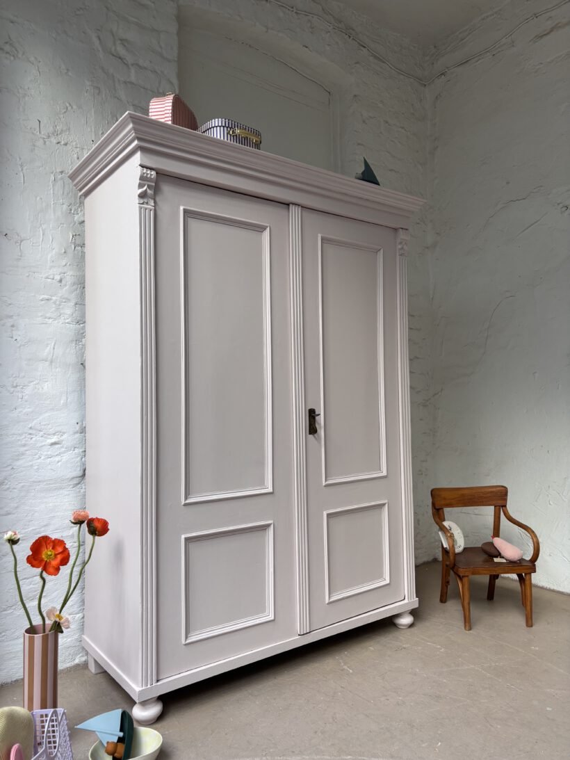 Zelda wurde von uns restauriert, repariert, lackiert und innen neu besetzt. Sie hat neue Füße bekommen und teilweise wurden sehr alte poröse Hölzer und Stellen ausgetauscht. Nun steht sie stabil, stark und lebensfroh – bereit für eine oder mehrere neue Lebensrunden. Innen haben wir Zelda ein komplett neues Innenleben verpasst. Böden links, rechts eine Kleiderstange und ein Boden. Wunderschön! Der Platz wird perfekt ausgenutzt und bietet viel Stauraum.